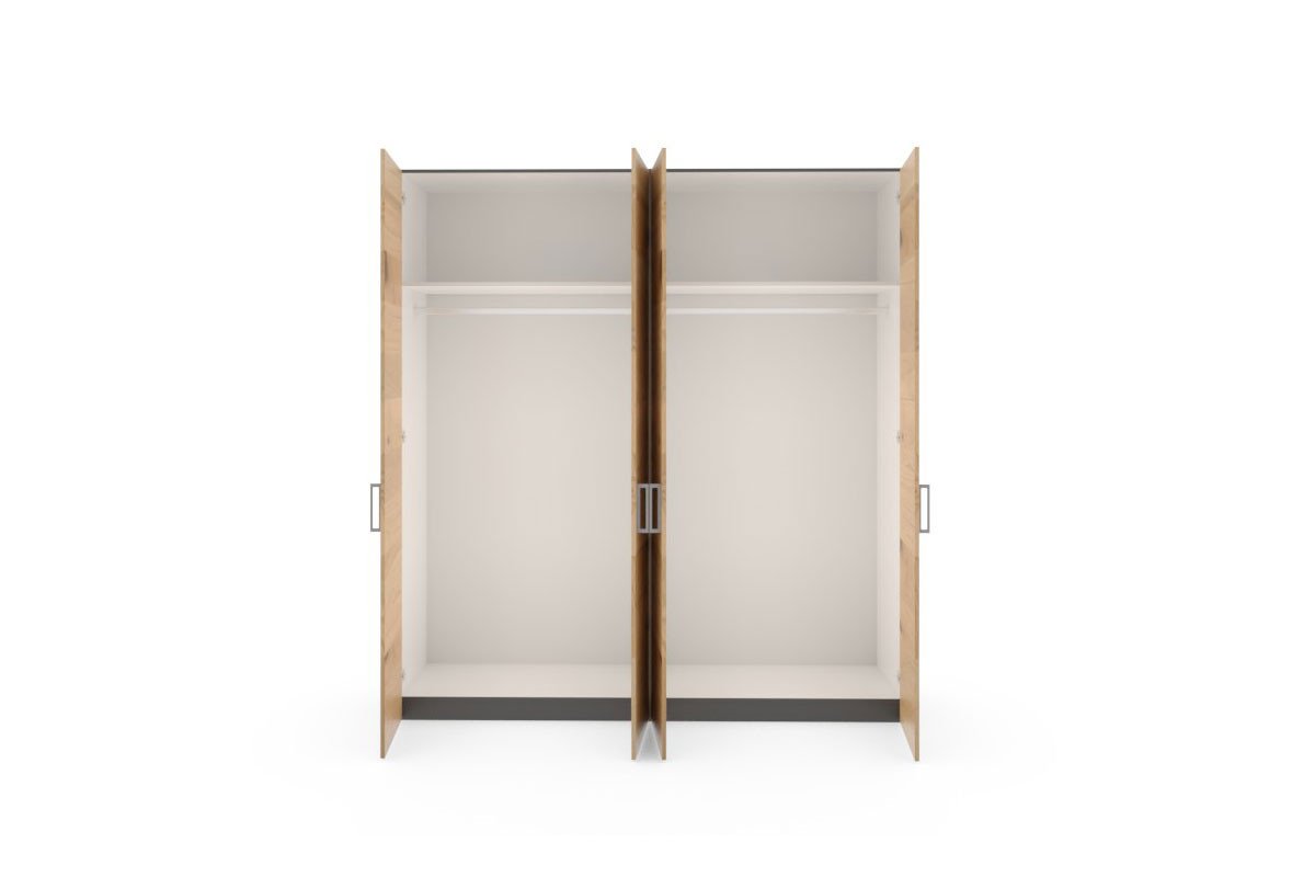Der JUTZLER Longline ist ein stilvoller und geräumiger Kleiderschrank, der hier in unserem Shop online erworben werden kann. Mit seinen vier Türen, die mit einem edlen Wildeichenfurnier in Paneel-Optik versehen sind, und einem Korpus in elegantem Schwarz sorgt er für eine moderne Atmosphäre in Ihrem Schlafzimmer. Durch diese geschickte Oberflächen-Kombination entsteht ein ansprechender Kontrast, der dem Kleiderschrank eine zeitlos schöne und natürliche Note verleiht. Die matten Bügelgriffe sind titanfarben und setzen einen stilvollen Akzent auf den furnierten Türen. Diese dekorativen Griffe bieten nicht nur eine praktische Möglichkeit zum Öffnen und Schließen der Türen, sondern unterstreichen auch das moderne Design des Schranks. Dank seiner intelligenten Innenraum-Aufteilung, die aus zwei breiten Einlegeböden und zwei langen Kleiderstangen besteht, finden Sie immer schnell und einfach, was Sie suchen. Für weitere Gliederungs- und Sortiermöglichkeiten können Sie über die Zusatzoptionen beispielsweise weitere Böden und praktische Innenschubladen bestellen. Mit dem JUTZLER Kleiderschrank Longline können Sie Ihren Kleidungsstücken ein stilvolles Zuhause geben, Ihre Räume aufwerten und gleichzeitig von viel Stauraum profitieren. Bestellen Sie diesen Drehtürenschrank jetzt ganz einfach online und lassen Sie sich von seiner Qualität und seinem Design begeistern.