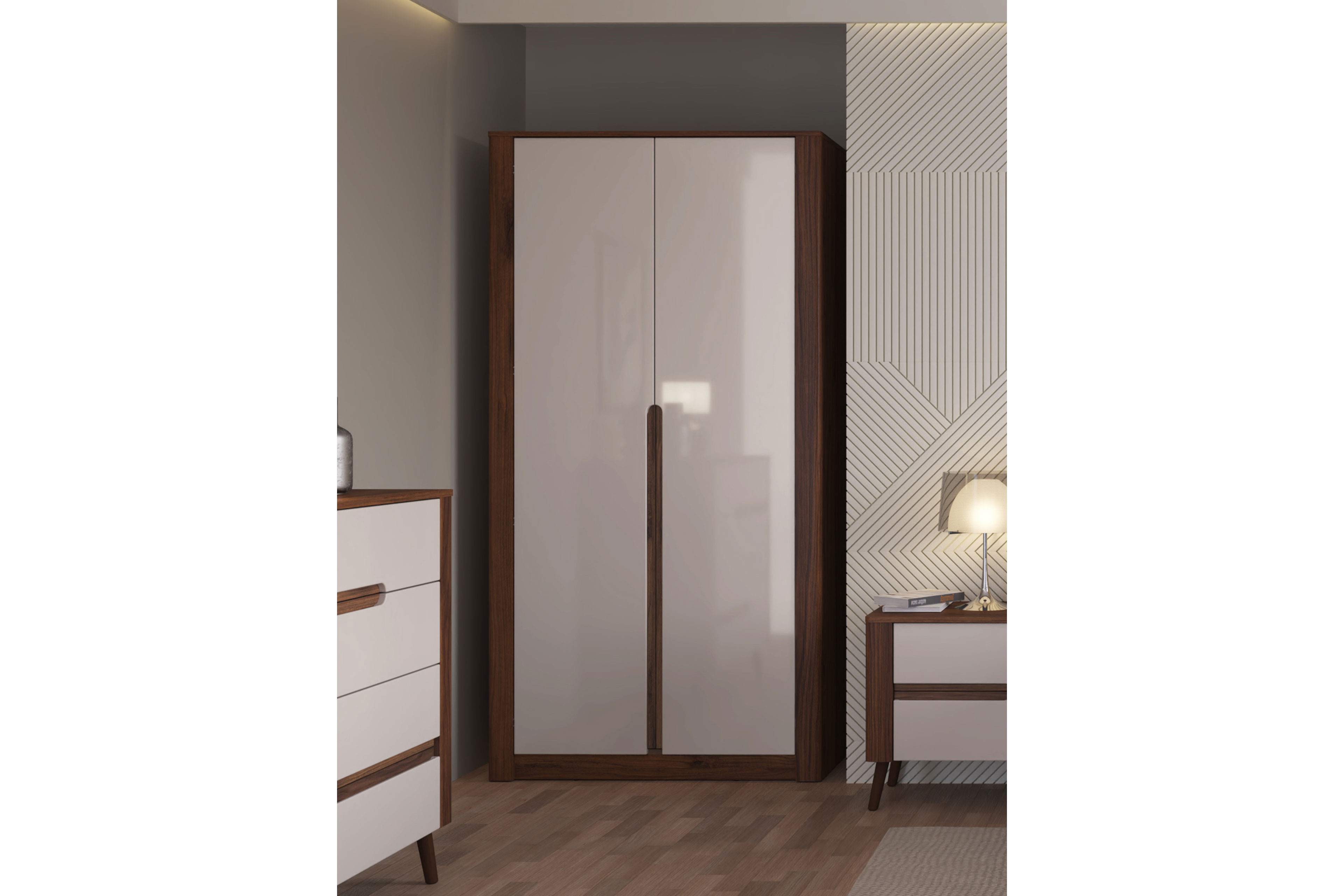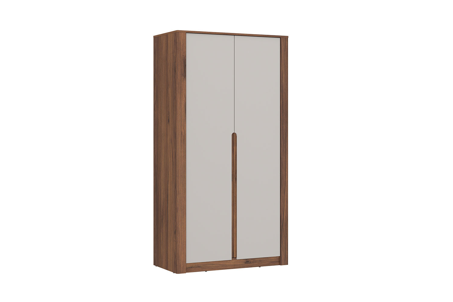 Der clevere Ordnungshelfer mit modernem Look macht in jedem Schlafzimmer eine gute Figur. Mit der Kollektion Amarillo-sleeping vereint Meble Wojcik Design und Farbgestaltung zu einem Spiel der Kontraste. Auch beim Kleiderschrank der Serie mixt sich lässige Geradlinigkeit mit subtil abgerundeten Details, während intensive Walnuss-Warmia-Nachbildung auf elegantes Mondschein trifft. Mit dieser Kombination strahlt Ihr Schlafzimmer eine behagliche Wärme aus und lädt zum Bleiben ein. Die beiden Drehtüren sind mit einer Softclose-Funktion ausgestattet, die ein geräuscharmes und besonders sanftes Schließen ermöglicht. Im Inneren finden Sie eine Kleiderstange für Kleider, Hemden oder Jacken sowie einen Fachboden, der Ihnen zusätzlichen Stauraum für Kleidungsstücke bietet, die Sie gerne zusammengelegt aufbewahren möchten. Mit seinen kompakten Maßen von circa 107 cm Breite, etwa 207 cm Höhe und ungefähr 60 cm Tiefe eignet er sich gleichermaßen für kleine wie große Räume. Drehtürenschränke von Meble Wojcik – hier ist alles jederzeit griffbereit und dennoch stilvoll verborgen.