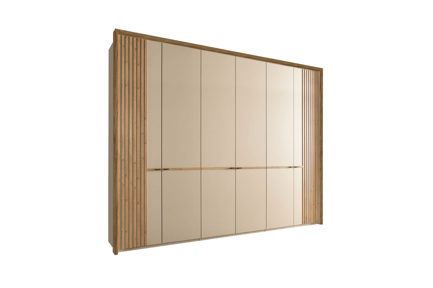 Der 6-türige Musterring Kleiderschrank MR Isabelle kombiniert stilvolles Design mit praktischem Stauraum. Mit seinem eleganten Champagner-Dekor und den naturgetreuen Absetzungen in einer Bianco-Eiche-Nachbildung, die sich in Form von Lamellen und Zierleisten zeigen, verleiht der Musterring Schrank jedem Raum eine stilvolle Note. Im Inneren des geräumigen Ordnungshüters, der ein Gesamtmaß von ca. 307 x 220 x 65 cm aufweist, stehen Ihnen drei gleich große Abteile mit der Standard-Ausstattung von je zwei Böden und einer Kleiderstange zur Verfügung. Zusätzlich stehen Ihnen in diesem Angebot drei weitere Wäscheböden zur individuellen Organisation des Innenraums zur Verfügung. So lassen sich gezielt verschiedene Kleidungsstücke und Accessoires ordentlich sortiert unterbringen. Der zugehörige Passepartout rahmt den Drehtürenschrank stilvoll ein und setzt ihn gekonnt in Szene. Die hochwertige Verarbeitung und ausgewählte Materialien sorgen zudem für eine lange Lebensdauer des Möbels. Musterring Einrichtungen sind generell die perfekte Wahl für alle, die Wert auf Qualität, Funktionalität und Design legen. Gönnen Sie sich ein Stück Luxus für Ihr Zuhause - mit den Möbeln von Musterring.