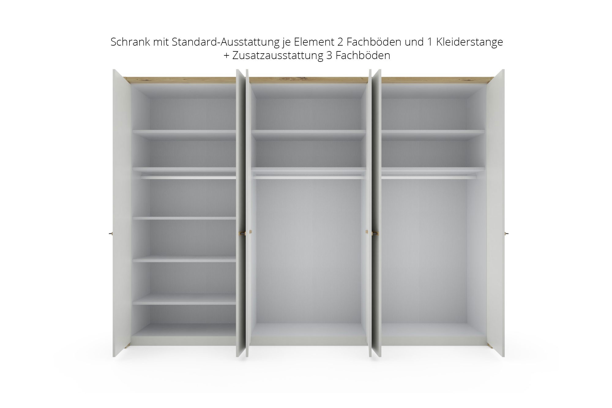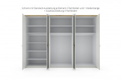 - Kleiderschrank: Inneneinteilung - 3 Elemente, je ca. 96,4 cm breit, je Element 2 Einlegeböden und 1 Kleiderstange, Zusatz-Ausstattung 3 Einlegeböden
