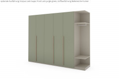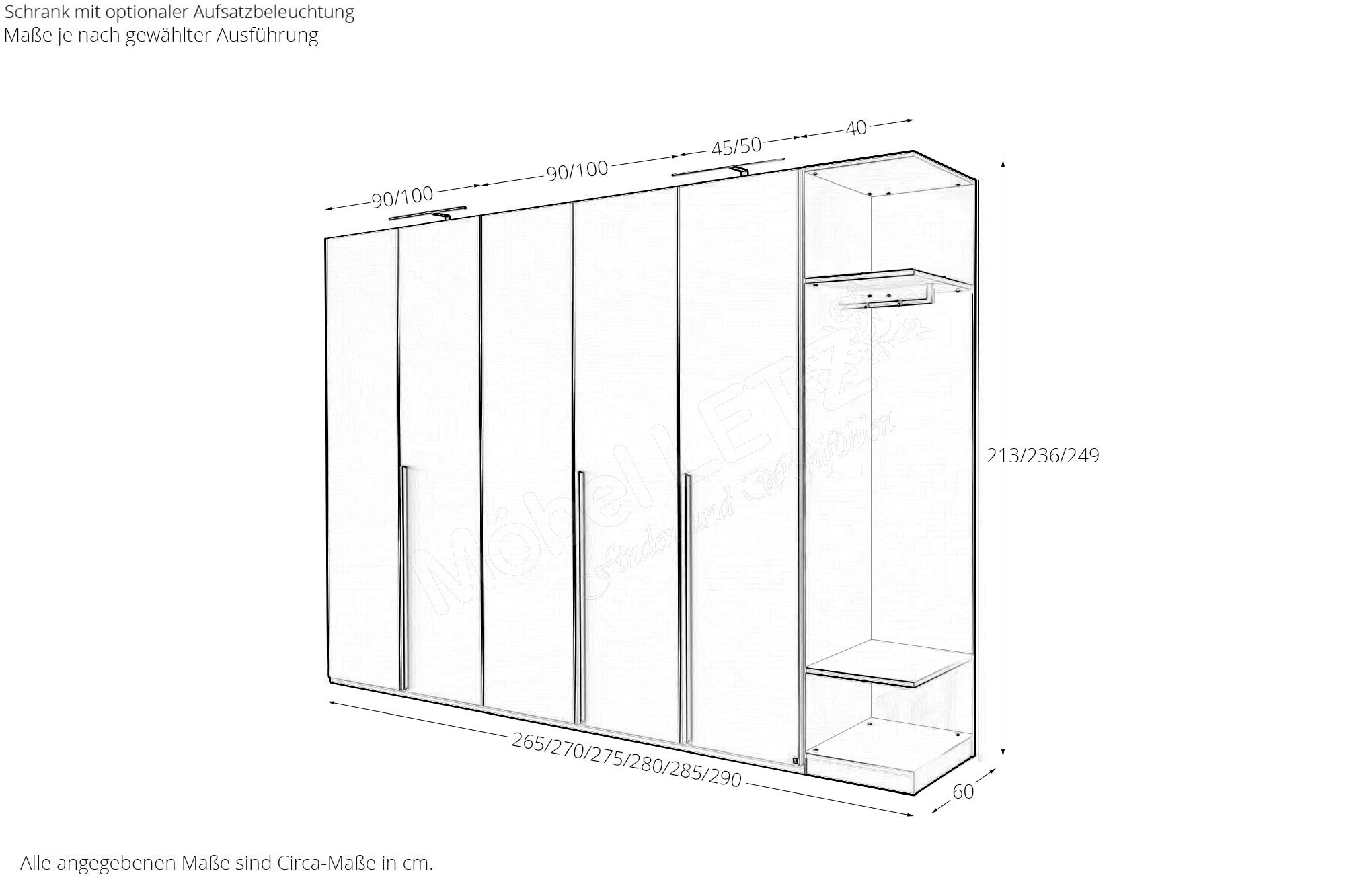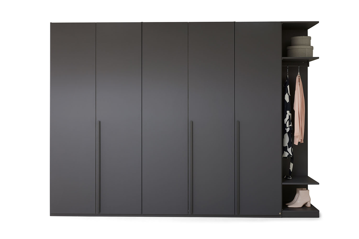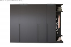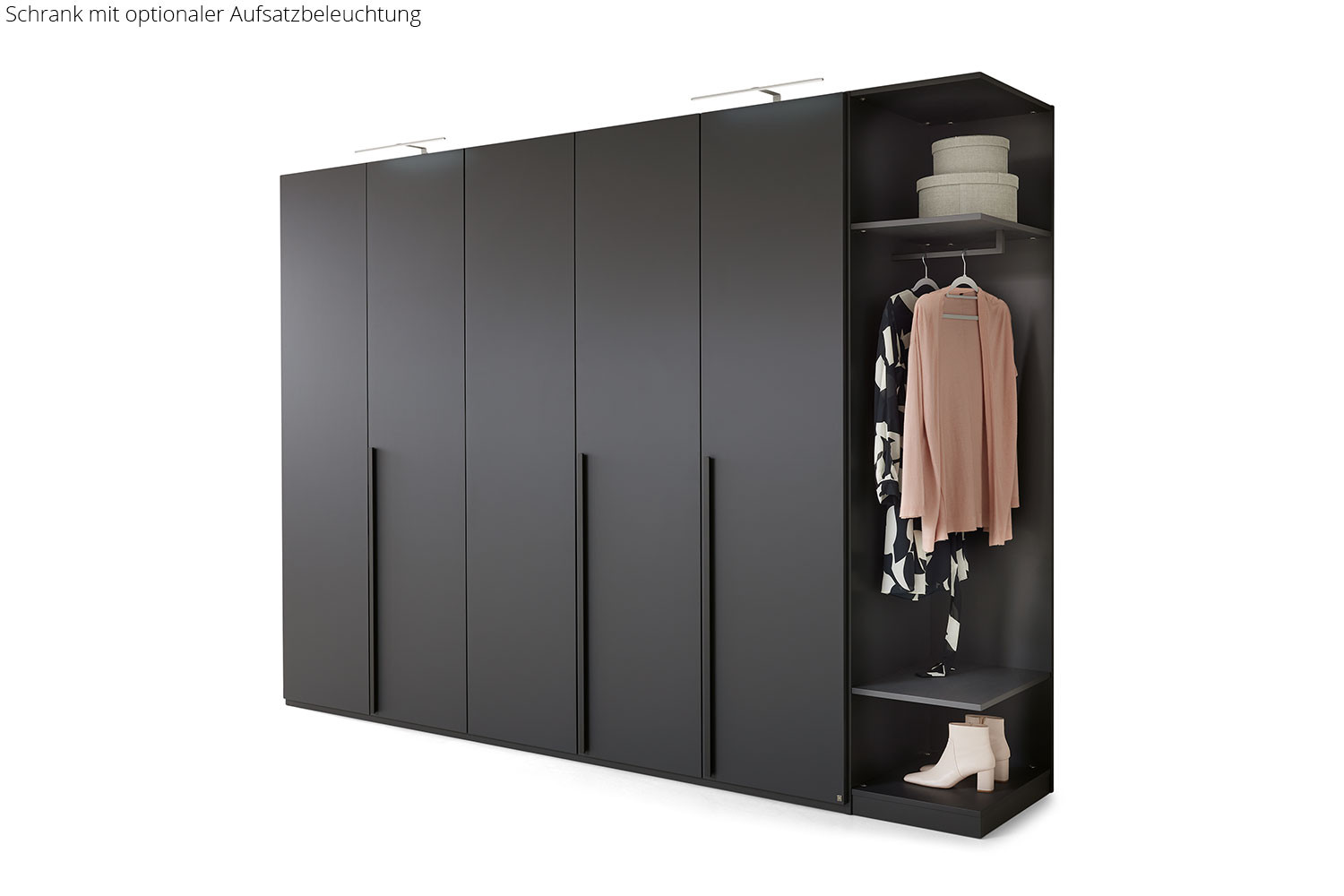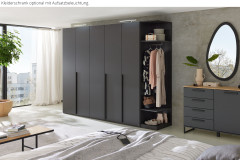 Eleganz, die heraussticht und Ihrem Schlafzimmer eine ganz neue Note verleiht. Montino von Musterring weiß mit klaren Formen und einem modernen Design zu überzeugen, das hier ganz selbstbewusst in den Vordergrund tritt. Die funktional gestaltete Schrank-Kombination besteht aus drei Schrankelementen und einem offenen Garderobenelement, das hier das Gesamtbild abrundet. Nicht nur optisch ansprechend, überzeugen hier auch die inneren Werte, die sich hinter den fünf gedämpften Türen verbergen. Mit je zwei Böden und einer Kleiderstange je Schrankabteil stehen hier bereits einige Unterbringungsmöglichkeiten für Ihre Kleidung zu Verfügung. Sie wollen das Grundangebot mit zusätzlichem Zubehör erweitern? In unseren Zusatzoptionen finden Sie nicht nur weitere Böden, eine T-Einteilung oder auch Innenschubkästen. Dort können Sie auch die abgebildete Aufsatzbeleuchtung hinzufügen und Ihren individuellen Kleiderschrank gestalten. Breite, Höhe, Korpus, Front und sogar die Griffe sind ebenfalls anpassbar. Montino von Musterring – für Orte der Gelassenheit.