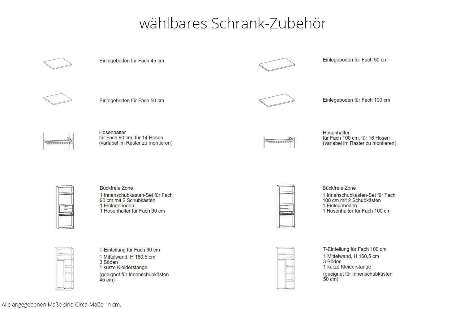 Standard-Ausstattung je Element 2 Einlegeböden und 1 Kleiderstange (Art-Nr. 98180+98249+91239)