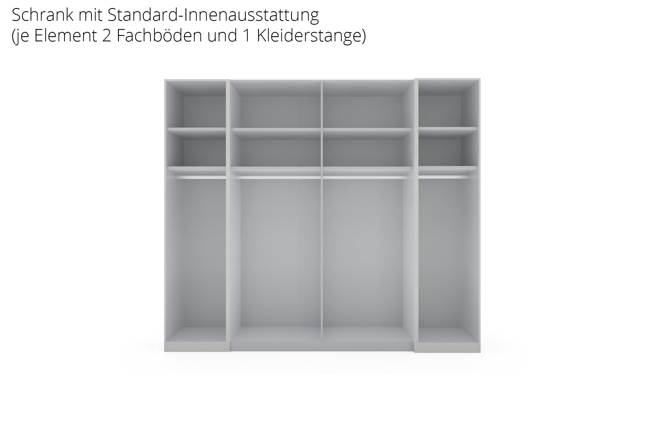 - Kleiderschrank: Aufteilung ca. 50|75|75|50 cm (47,5|72,2|72,2|47,5), je Element 2 Einlegeböden und 1 Kleiderstange