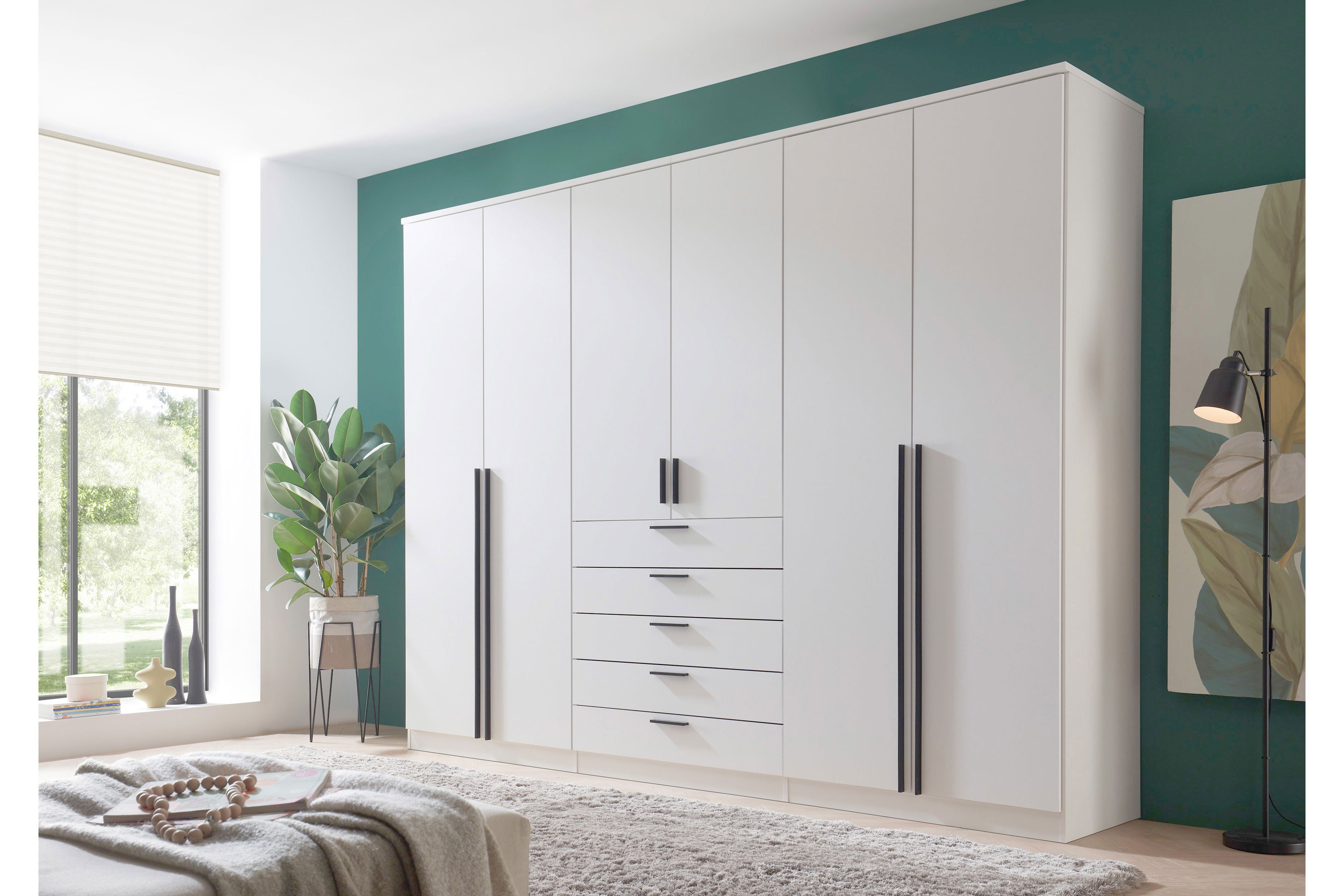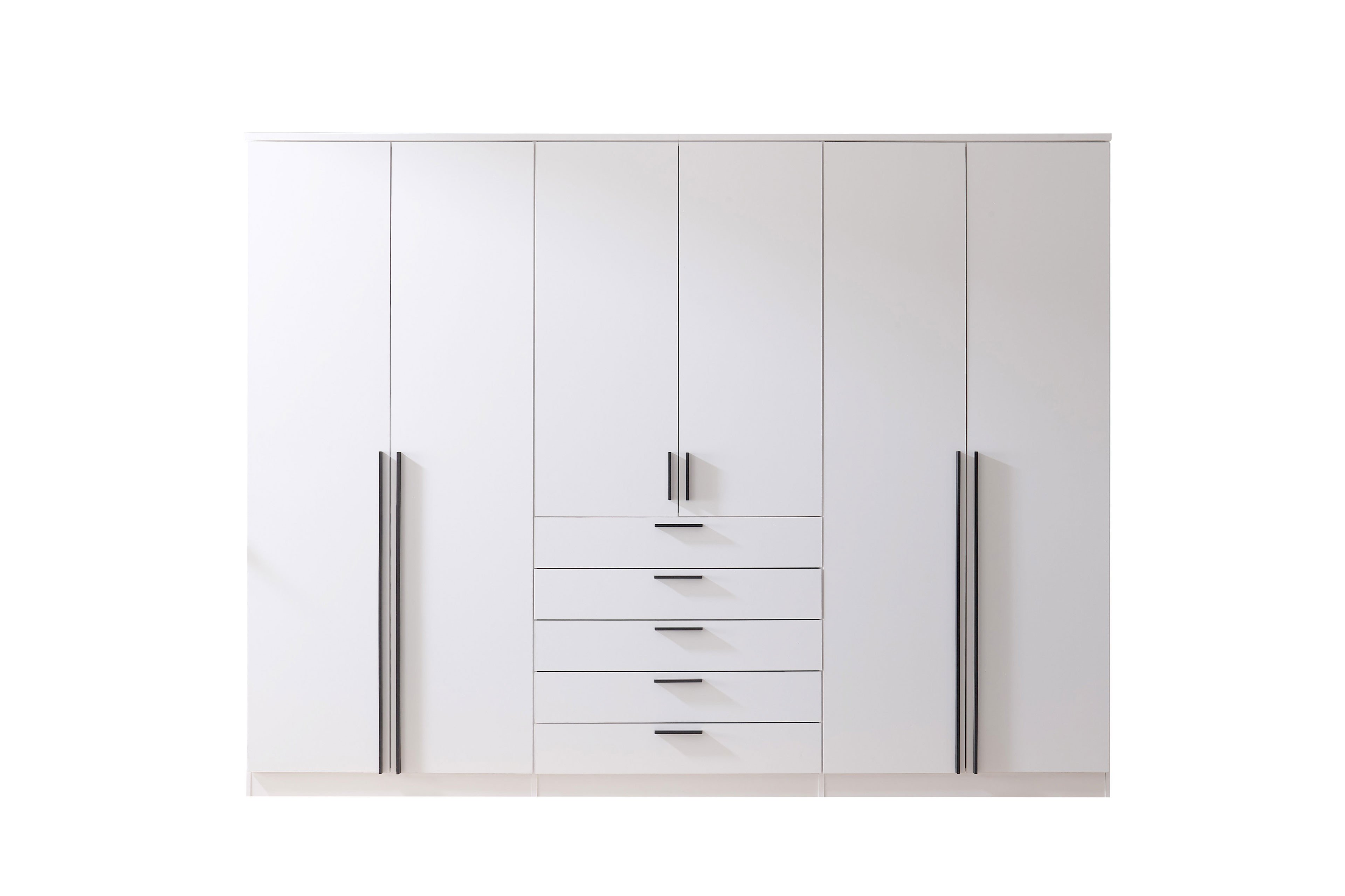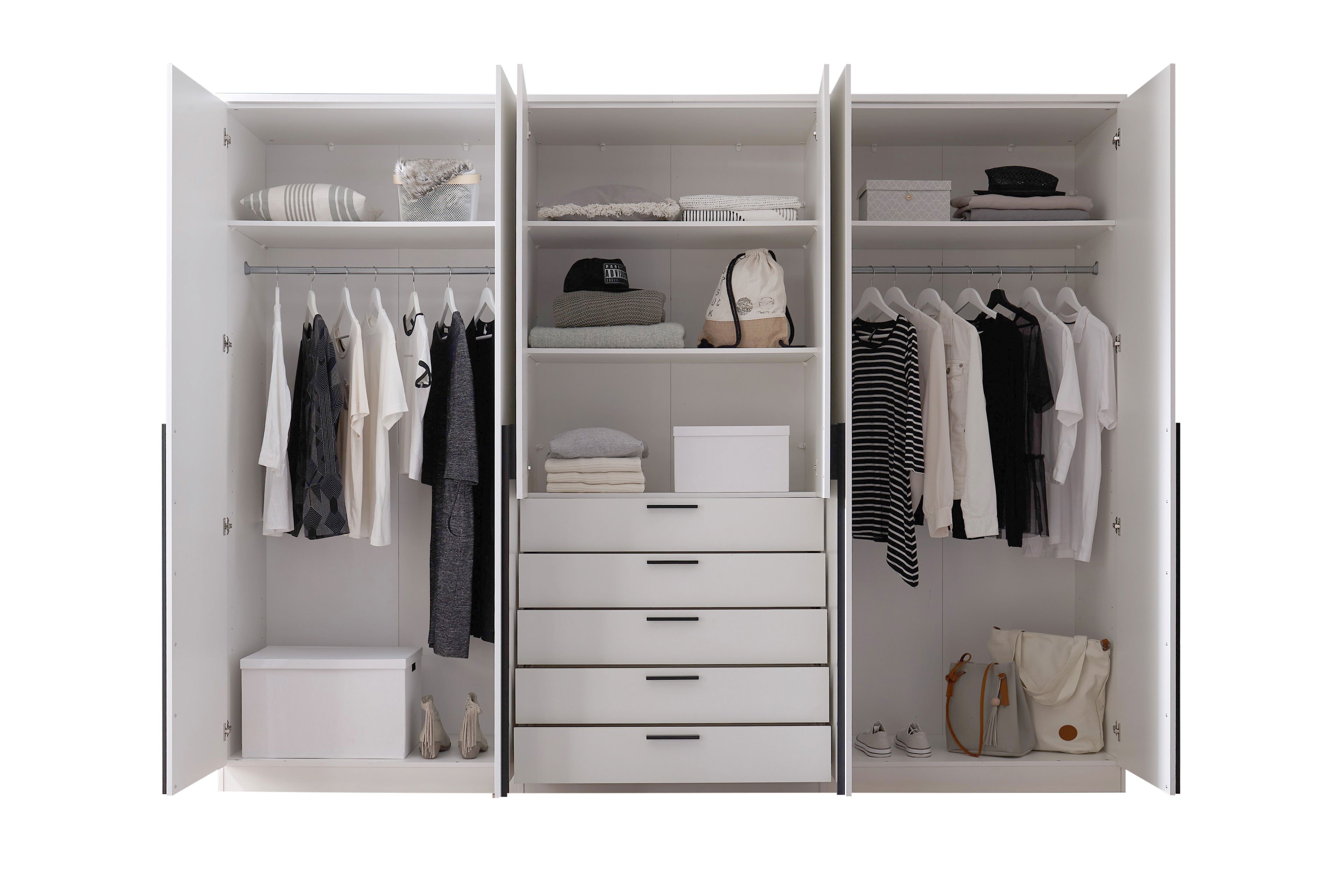 Der großzügige Arnis Kleiderschrank von POL Power überzeugt mit seinem modernen Look und seine durchdachte Innenraum-Aufteilung. In klassischem Weiß gehalten und mit einem eleganten Kranz versehen, fügt sich der geräumige Kleiderschrank harmonisch in Ihr Schlafzimmer ein und sorgt für eine helle, freundliche Atmosphäre. Hinter sechs Türen und in fünf geräumigen Schubladen bietet Arnis reichlich Platz für Kleidung, Bettwäsche und Accessoires. Die drei Schrank-Elemente mit jeweils etwa 88 cm Breite sind durchdacht unterteilt: Insgesamt vier breite Einlegeböden und zwei stabile Kleiderstangen ermöglichen eine übersichtliche und praktische Aufbewahrung Ihrer Garderobe. Ob gefaltete Pullover, aufgehängte Hemden oder Kleinteile in den Schubladen - hier findet alles seinen Platz. Mit seinem großzügigen Maß bietet der Kombischrank viel Stauraum, ohne überladen zu wirken. Das schlichte, zeitlose Design macht ihn zu einem echten Blickfang in jedem Raum und lässt sich leicht mit verschiedensten Möbelstilen kombinieren. Entdecken Sie den POL Power Kleiderschrank Arnis jetzt günstig online - ein geräumiger, funktionaler und zugleich stilvoller Schrank, der Ordnung und Eleganz in Ihr Zuhause bringt.