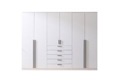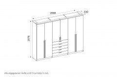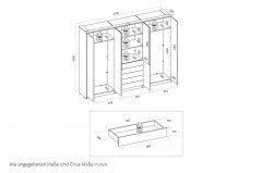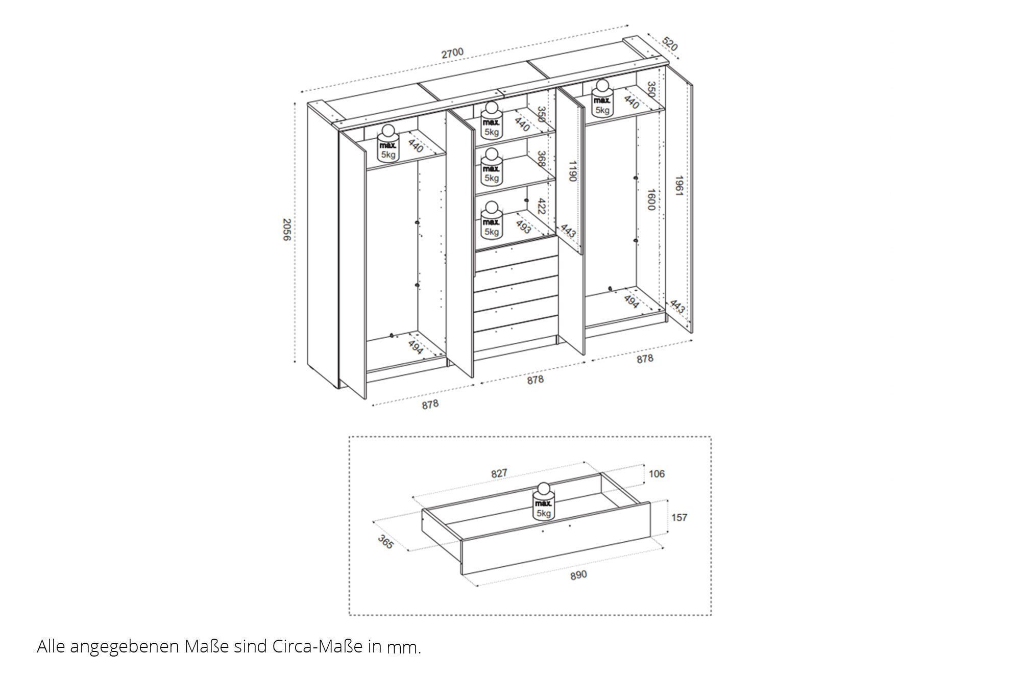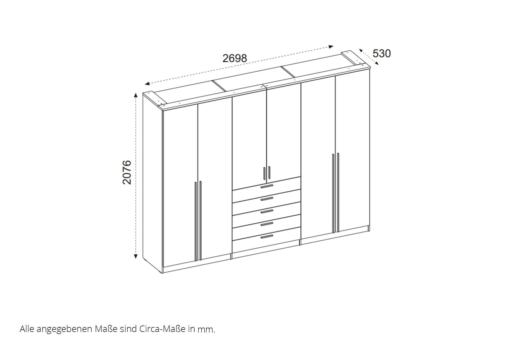 - Kleiderschrank: 6 Türen, 5 Schubkästen mittig, je etwa 88 cm breit, inklusive Kranzboden