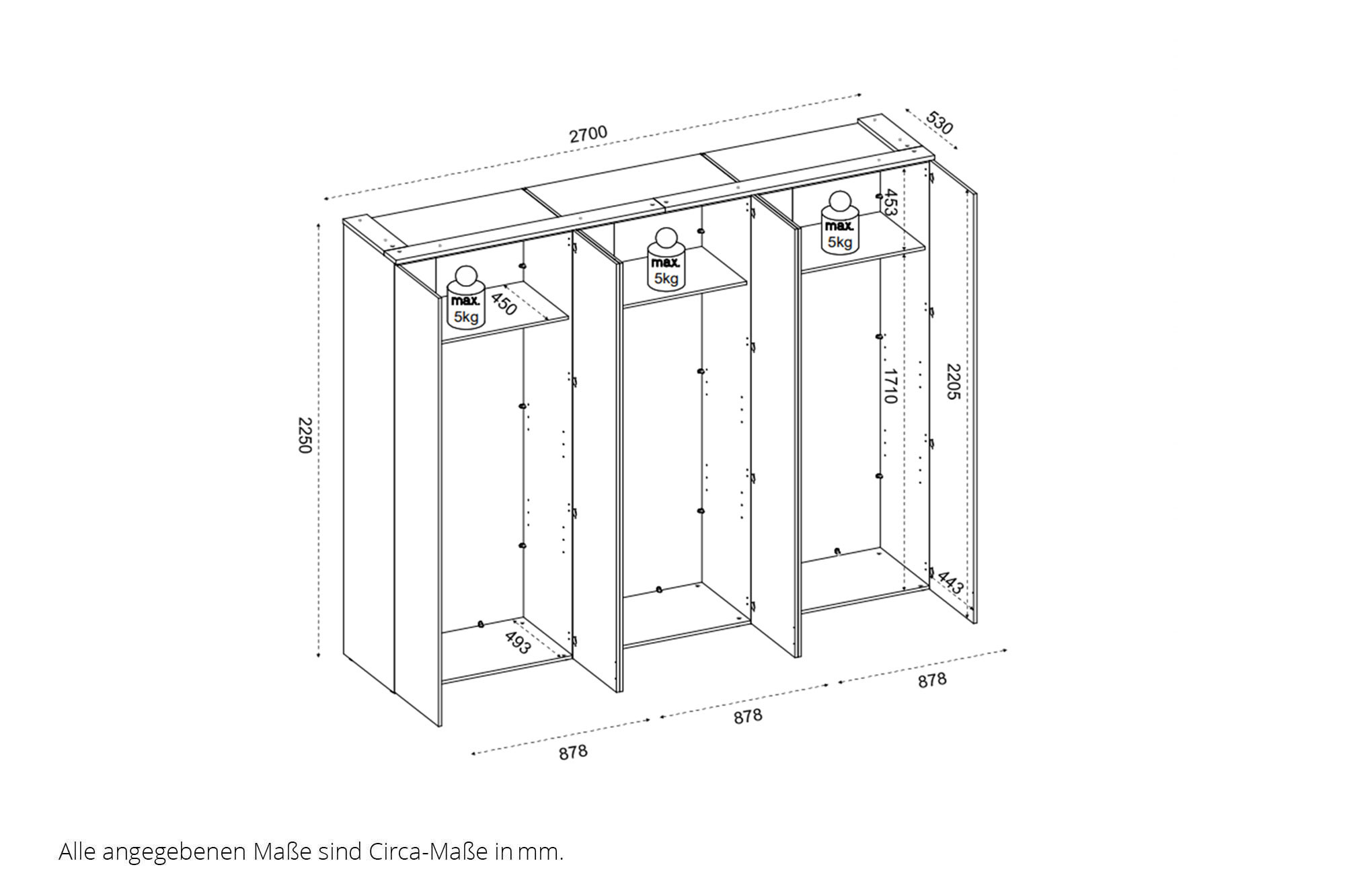 3 x 88er Element mit je 1 Boden und 1 Kleiderstange - Einlegeböden je maximal belastbar bis 5 kg