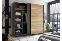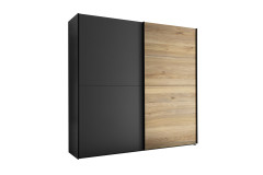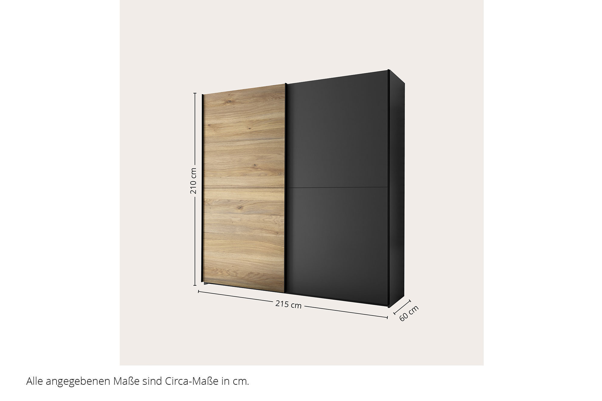 Für ein durchdachtes Design, das Ihnen maximale Funktion auf minimalem Raum gewährt, steht der 2-türige Schwebetürenschrank Melton von POL Power. Mit einer Breite von gerade einmal etwa 215 cm und einer ungefähren Höhe von 210 cm schenkt Ihnen Melton viel strukturierten Platz für all Ihre Kleidungsstücke. Aufgrund der kompakten Größe eignet sich der schmale Schrank nicht nur als praktischer Ordnungshüter im Schlafzimmer, sondern er leistet auch gute Dienste in einem Jugend- oder Gästezimmer. Der Korpus und auch die linke Tür sind in einem dunklen Graphit gehalten, während die rechte Tür mit ihrer Mauvella-Eiche-Nachbildung für einen dekorativen Kontrast und wohnliche Natürlichkeit sorgt. Hinter dem Schwebetüren-Paar verbirgt sich eine optimale Inneneinteilung, die sich aus zwei breiten Böden und zwei Hoteleinteilungen zusammensetzt. Somit stehen Ihnen oben zwei große Fächer, links und rechts außen zwei schmale Wäschefächer mit je drei Böden und mittig zwei schmale Kleiderfächer mit je einer Kleiderstangen zur Verfügung. Ergänzen Sie den Melton Schwebetürenschrank von POL Power mit weiteren Möbelstücken aus unserem Online-Shop und richten Sie ein modernes Zimmer für sich, Ihr Kind oder Gäste ein.