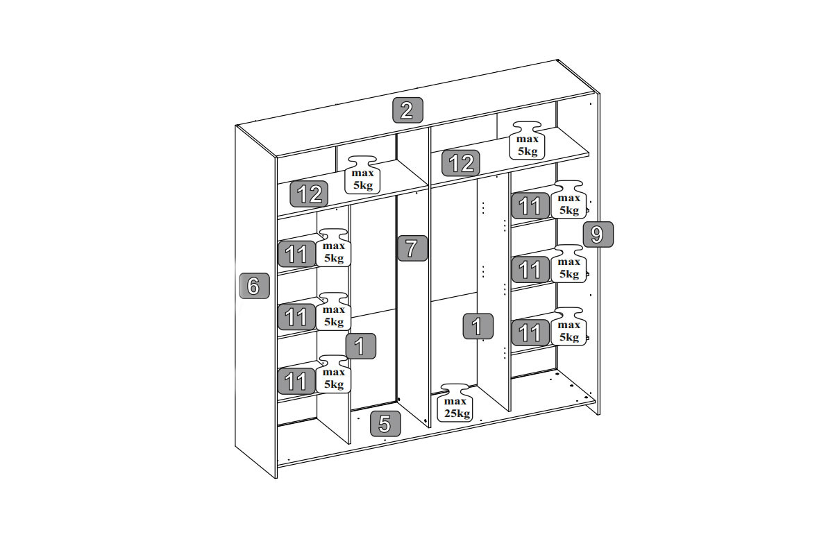 105er Element rechts: 1 großer Boden, 1 Hoteleinteilung (3 Böden und 1 Kleiderstange), - Böden je maximal belastbar bis 5 kg, Unterboden maximal belastbar bis 25 kg