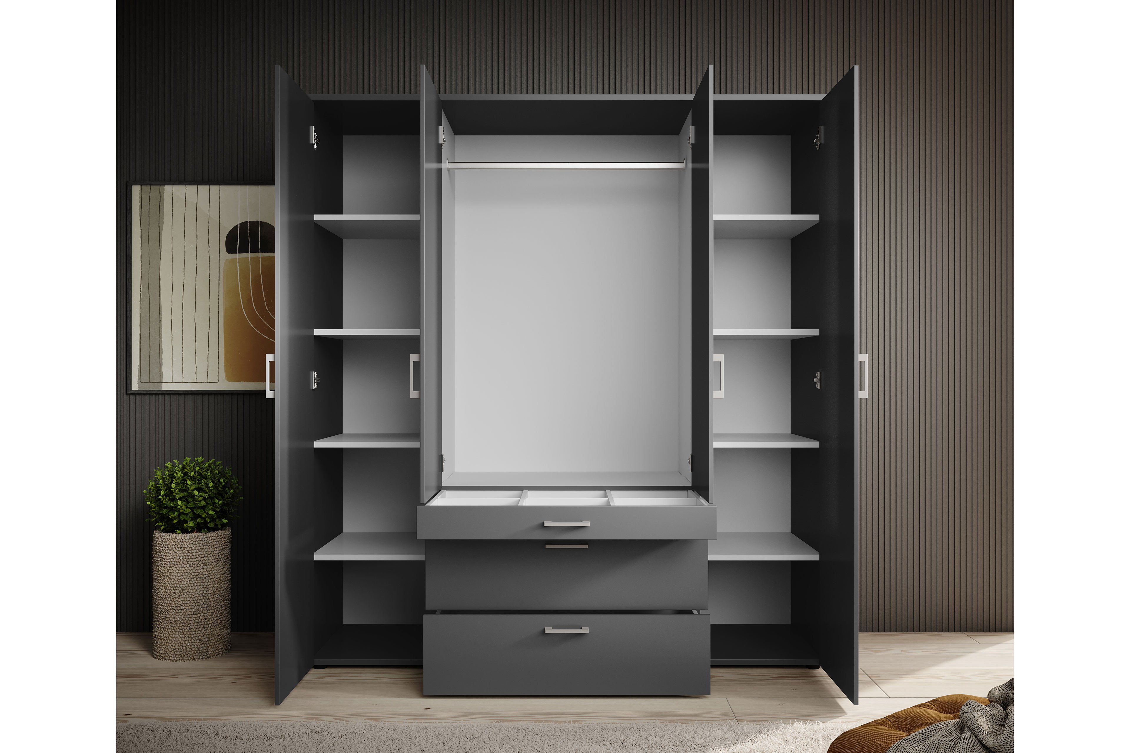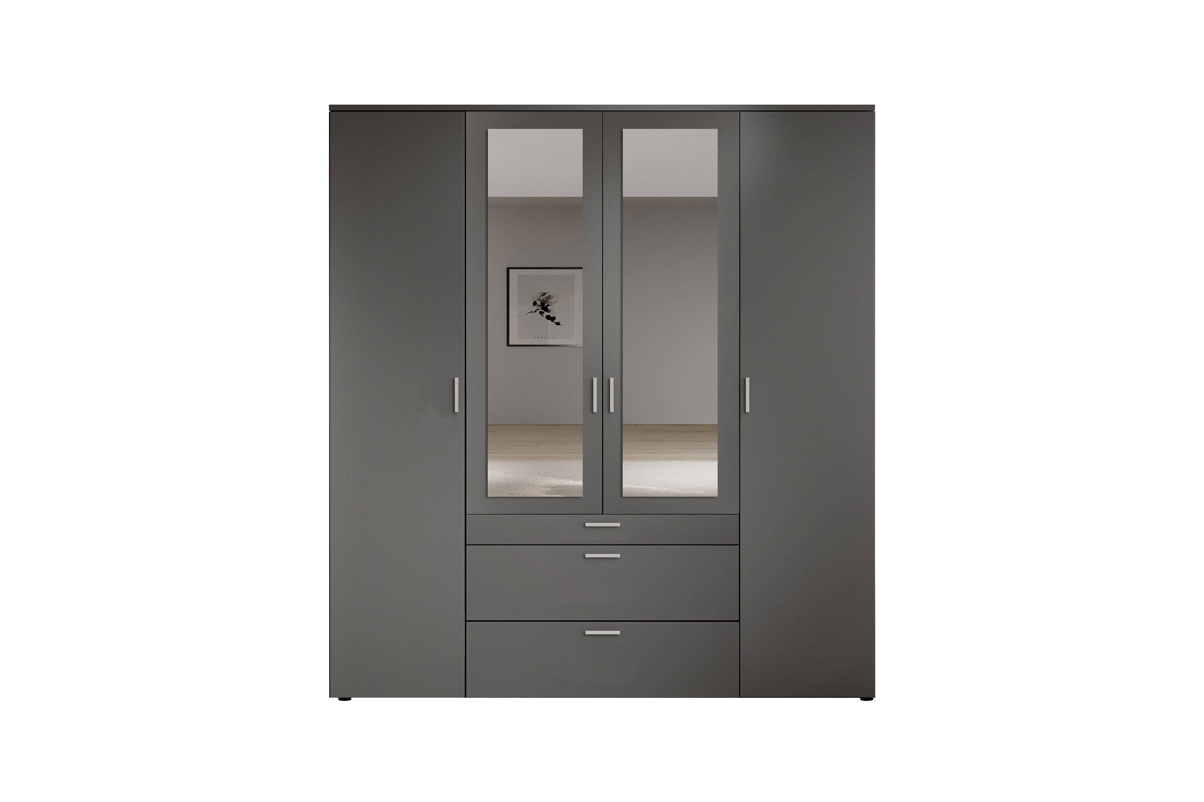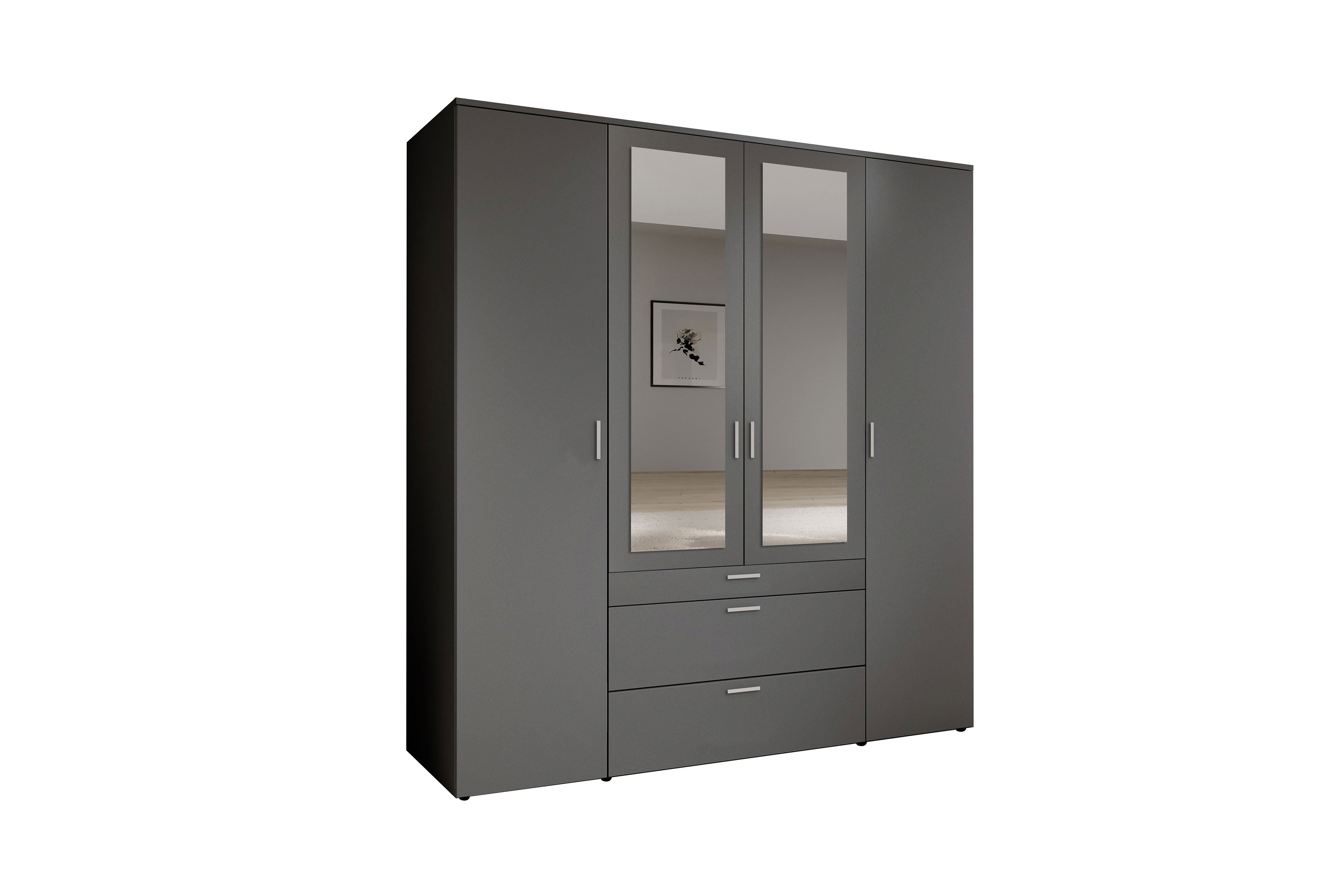 Der POL Power Kombi-Kleiderschrank Vesala vereint moderne Optik mit ausgeklügelter Funktionalität und bietet viel Stauraum für Kleidung, Wäsche und Accessoires. In edlem Graphit gehalten, fügt sich der Vesala-Kombischrank perfekt in unterschiedlichste Wohn- und Schlafzimmerkonzepte ein und wirkt dank der zwei integrierten Spiegelauflagen offen und einladend. Die Spiegelflächen vergrößern den Raum optisch und machen Vesala gleichzeitig zu einem praktischen Begleiter beim täglichen Styling. Hinter den vier Türen verbirgt sich ein strukturiertes Innenleben, das Ordnung halten leicht macht. Zwei etwa 43 cm breite Außen-Elemente dienen als Wäschefächer, da sie jeweils mit vier stabilen Böden ausgerüstet sind und viel Platz für gefaltete Kleidung, Handtücher oder Boxen zur Verfügung stellen. Das mittige ungefähr 88 cm breite Kleiderfach beinhaltet eine Kleiderstange und eignet sich somit ideal zur knitterfreien Aufbewahrung von Jacken, Hemden, Kleidern oder Mänteln. Unter den mittleren Spiegeltüren befinden sich drei breite Schubladen, die zusätzlichen Platz für kleinere Kleidungsstücke oder Accessoires schaffen. Besonders praktisch ist die oberste Schublade, die mit einer sechs-fachen Inneneinteilung ausgestattet ist und so übersichtliche Ordnung beim Sortieren von Socken, Unterwäsche oder Schmuck schafft. Der POL Power Kombi-Kleiderschrank Vesala überzeugt damit als stilvolle und funktionale Komplettlösung alle, die Wert auf Struktur und ein zeitloses Erscheinungsbild legen.