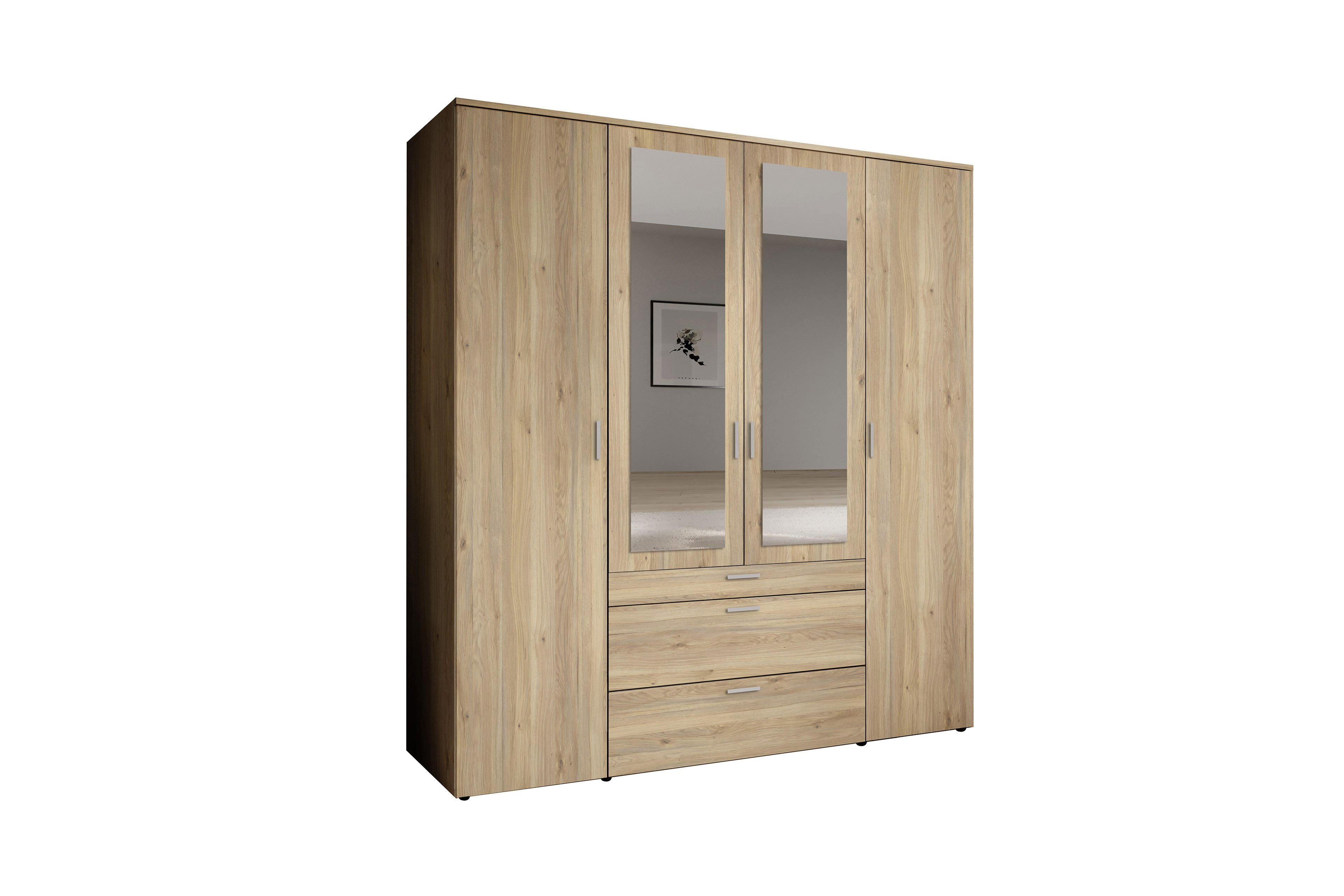 Der POL Power Kombi-Kleiderschrank Vesala vereint moderne Optik mit ausgeklügelter Funktionalität und bietet viel Stauraum für Kleidung, Wäsche und Accessoires. In natürlich wirkender Mauvella-Oak-Nachbildung gehalten, fügt sich der Vesala-Kombischrank perfekt in unterschiedlichste Wohn- und Schlafzimmerkonzepte ein und wirkt dank der zwei integrierten Spiegelauflagen offen und einladend. Die Spiegelflächen vergrößern den Raum optisch und machen Vesala gleichzeitig zu einem praktischen Begleiter beim täglichen Styling. Hinter den vier Türen verbirgt sich ein strukturiertes Innenleben, das Ordnung halten leicht macht. Zwei etwa 43 cm breite Außen-Elemente dienen als Wäschefächer, da sie jeweils mit vier stabilen Böden ausgerüstet sind und viel Platz für gefaltete Kleidung, Handtücher oder Boxen zur Verfügung stellen. Das mittige ungefähr 88 cm breite Kleiderfach beinhaltet eine Kleiderstange und eignet sich somit ideal zur knitterfreien Aufbewahrung von Jacken, Hemden, Kleidern oder Mänteln. Unter den mittleren Spiegeltüren befinden sich drei breite Schubladen, die zusätzlichen Platz für kleinere Kleidungsstücke oder Accessoires schaffen. Besonders praktisch ist die oberste Schublade, die mit einer sechs-fachen Inneneinteilung ausgestattet ist und so übersichtliche Ordnung beim Sortieren von Socken, Unterwäsche oder Schmuck schafft. Der POL Power Kombi-Kleiderschrank Vesala überzeugt damit als stilvolle und funktionale Komplettlösung alle, die Wert auf Struktur und ein zeitloses Erscheinungsbild legen.