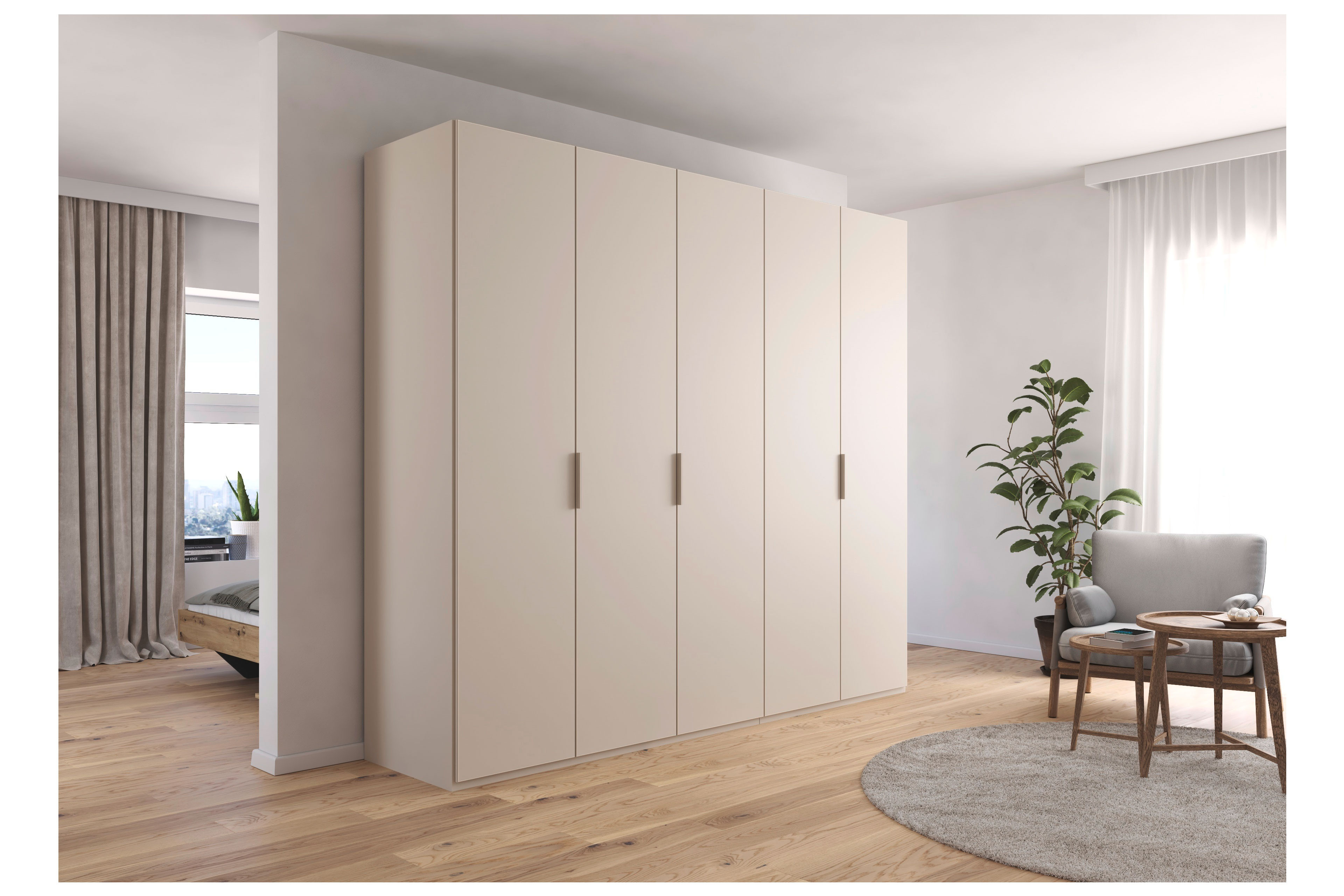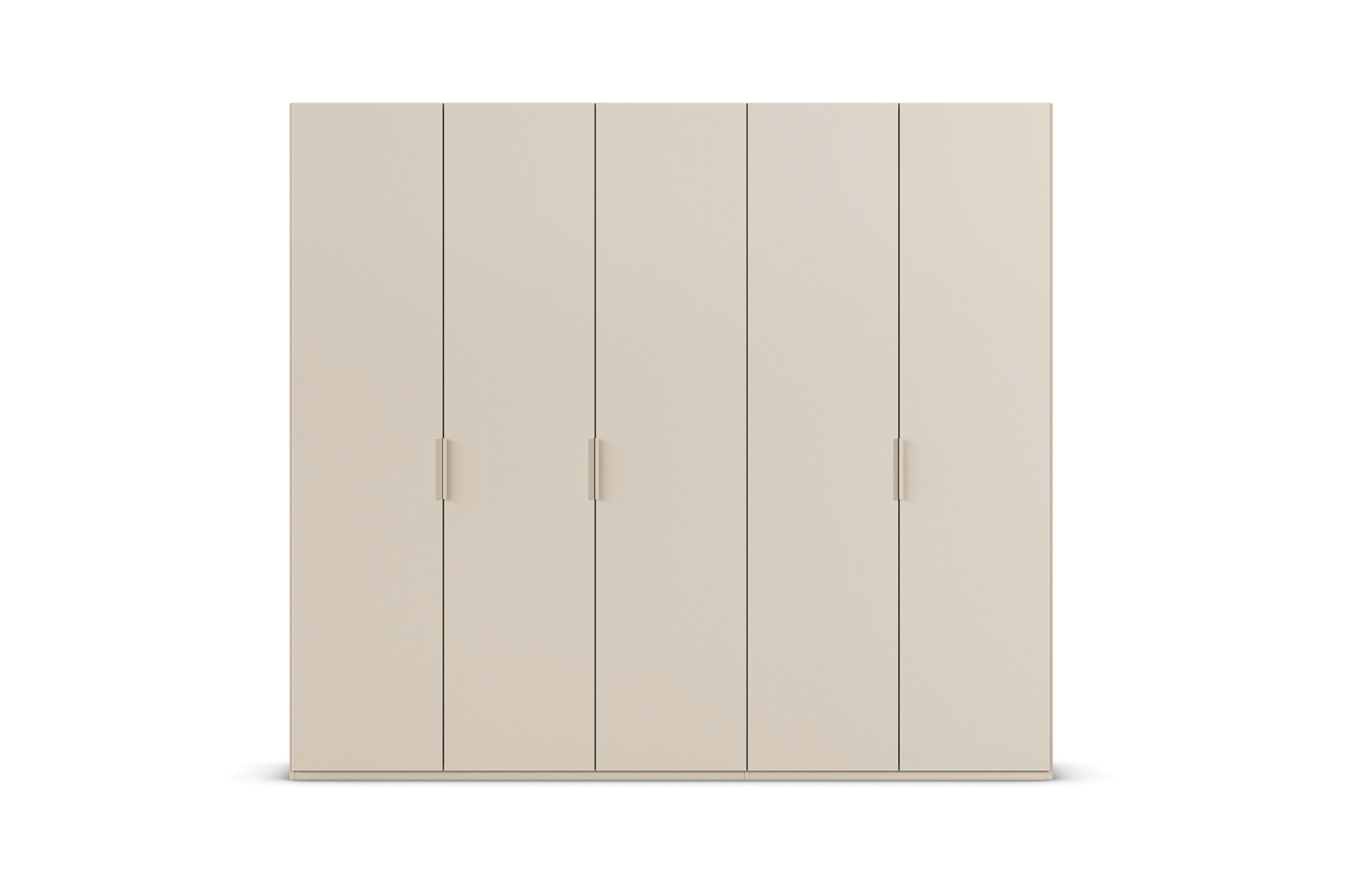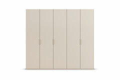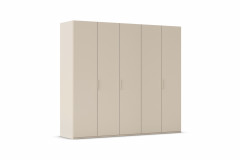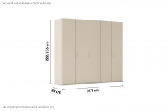 Dezent und harmonisch fügt sich der Kleiderschrank der Serie Fifty von Rauch Orange in dieser Farb-Ausführung ein. Ein sanftes Champagner-Dekor umhüllt den etwa 251 x 222 x 61 cm großen Ordnungshüter und selbst die Winkelgriffe erscheinen Ton in Ton. Mithilfe der Zusatzoptionen können Sie sich allerdings auch für eine andere Farbe oder eine naturgetreue Holznachbildung sowie alternative Oberflächenvarianten, wie Glas, Spiegel oder Hochglanz, entscheiden. Gestalten Sie nicht nur das Äußere nach Ihren Wünschen, auch die Schrank-Innenausstattung kann bedarfsgerecht ergänzt werden. Erweitern Sie das Standard-Ordnungssystem beispielsweise mit einem Kleiderlift, Schubkästen oder einem Regaleinsatz, sodass für Ihre gesamte Garderobe und Ihre Accessoires angemessene Unterbringungsmöglichkeiten gegeben sind. Übrigens verfügen alle fünf Drehtüren über ein komfortables Soft-Close-System, damit ein leiser Schließvorgang garantiert ist. Dank des integrierten Niveauausgleichs, der Bodenschrägen oder Unebenheiten bis zu 12 mm kompensieren kann, steht Ihr neuer Fifty Kleiderschrank der Marke Rauch Orange immer gerade und sicher.