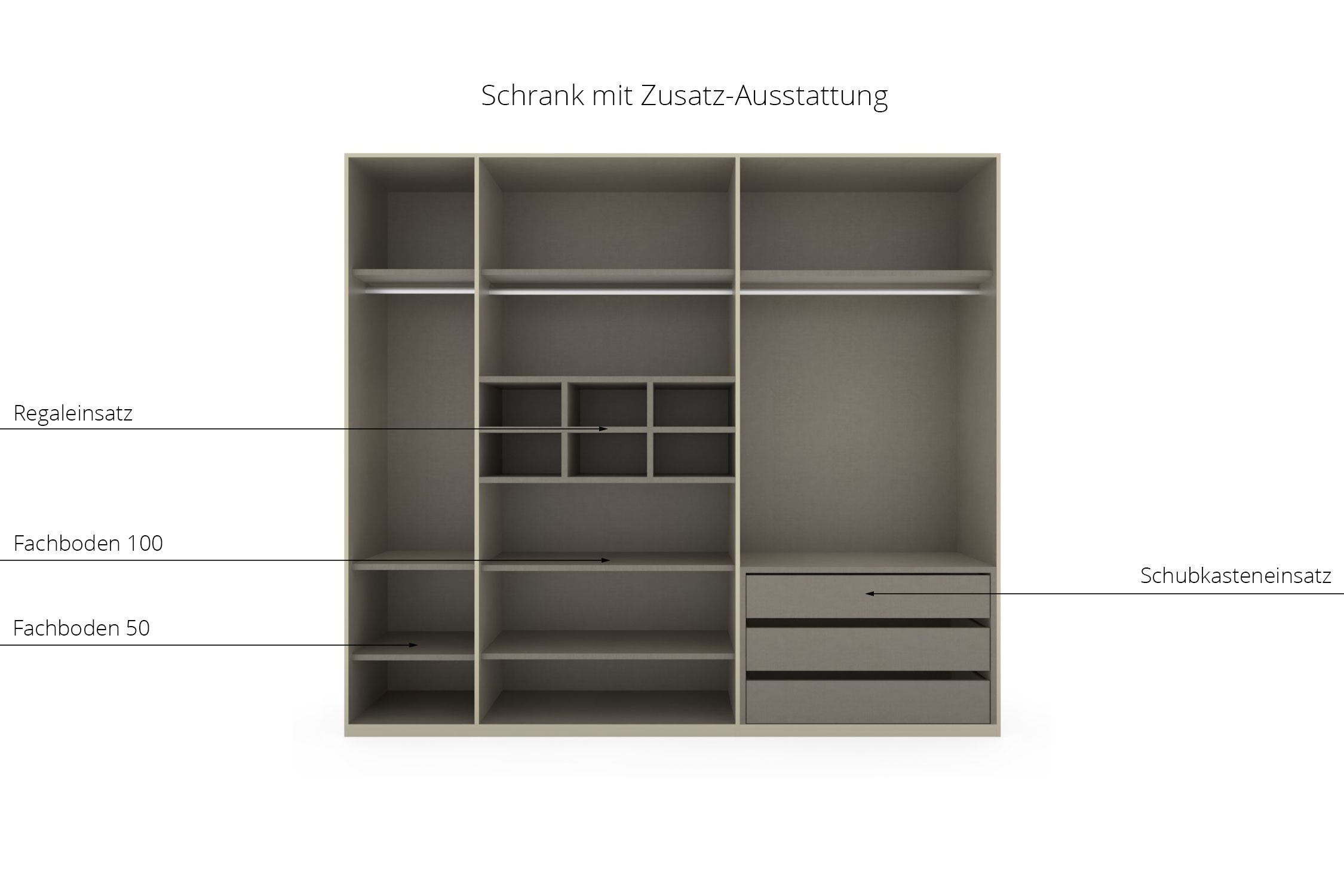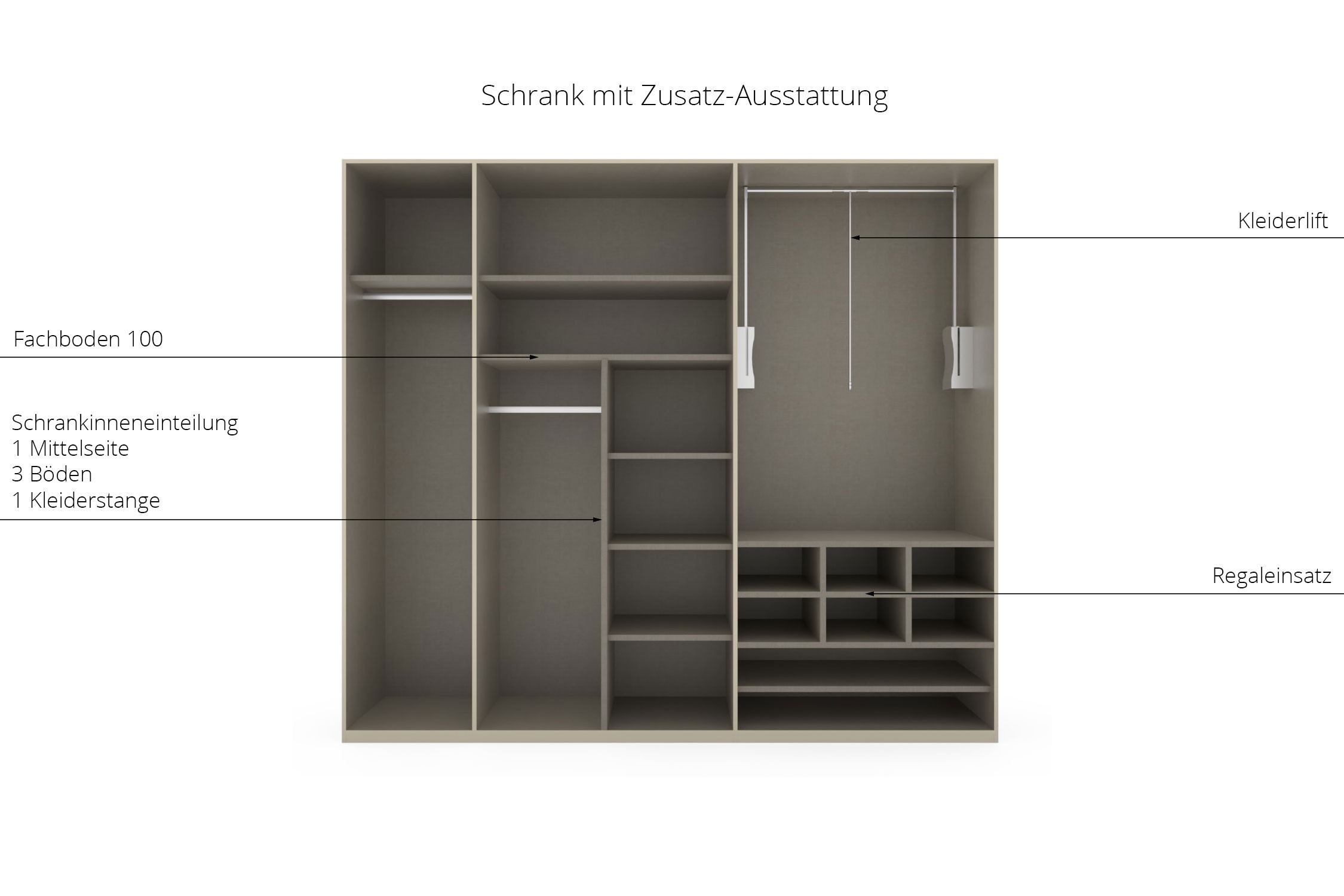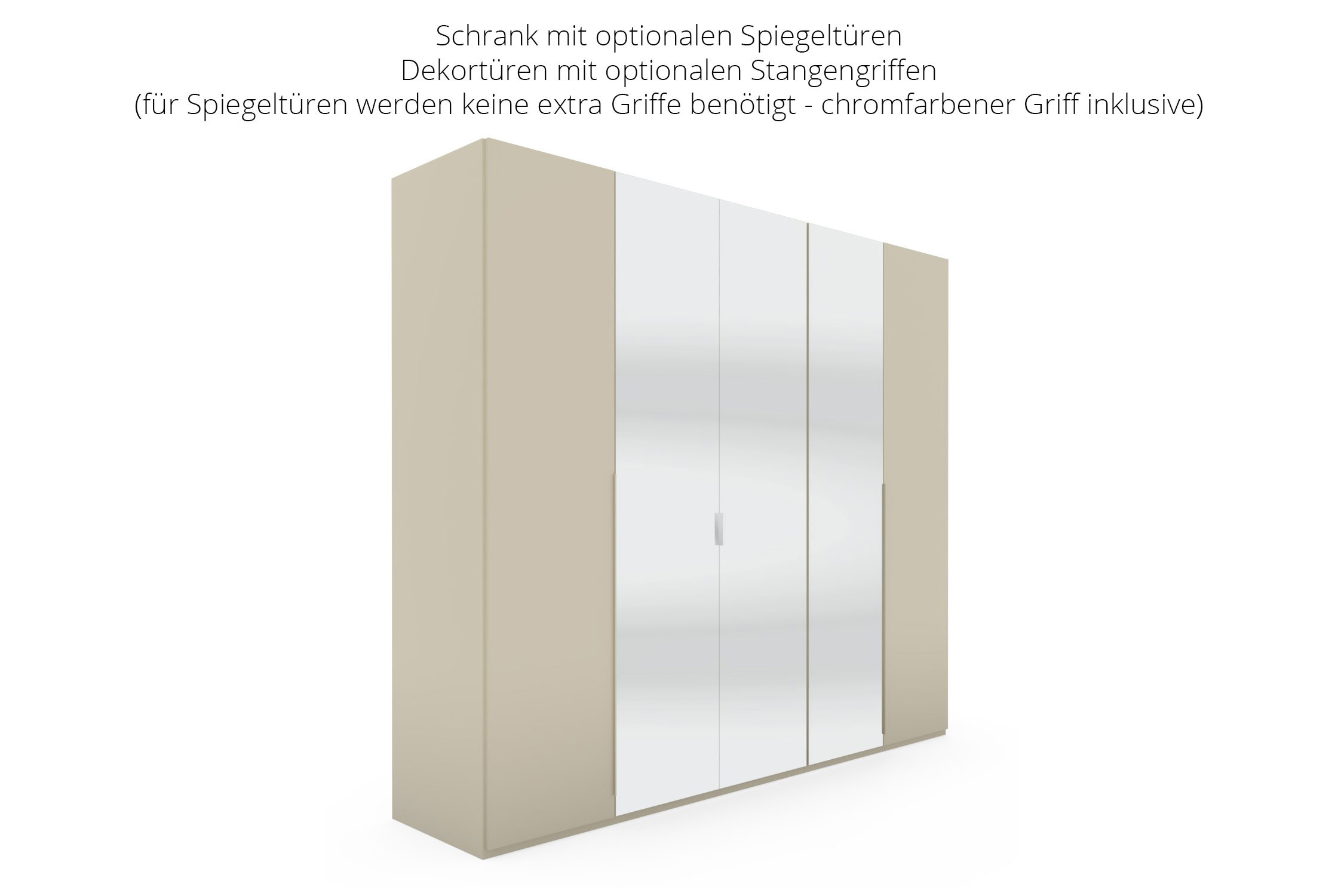 Bei den Schwebetürenschränken erscheint die vordere Sockelleiste immer in Seidengrau. Dies ist produktionsbedingt und kein Grund zur Beanstandung.