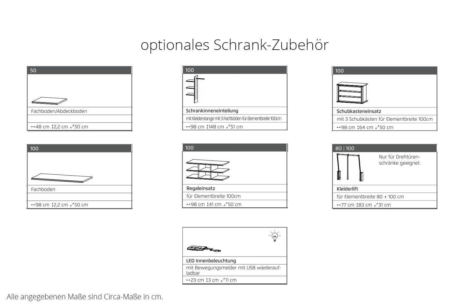 - Kleiderschrank: bestehend aus 3 Schrankelementen, ca. 50|100|100 cm (Aufbau auch ca. 100|50|100 cm möglich, da Mittelseite versetzbar ist), je Element 1 Fachboden und 1 Kleiderstange