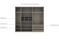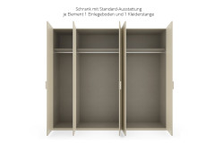 - System-Kleiderschrank bestehend aus 1 Schrankkorpus 150 Grundelement, 1 Schrankkorpus 100 Anbauelement, 1 Dekor-Tür, 2 Dekor-Türen-Paaren und 1 Griff-Set