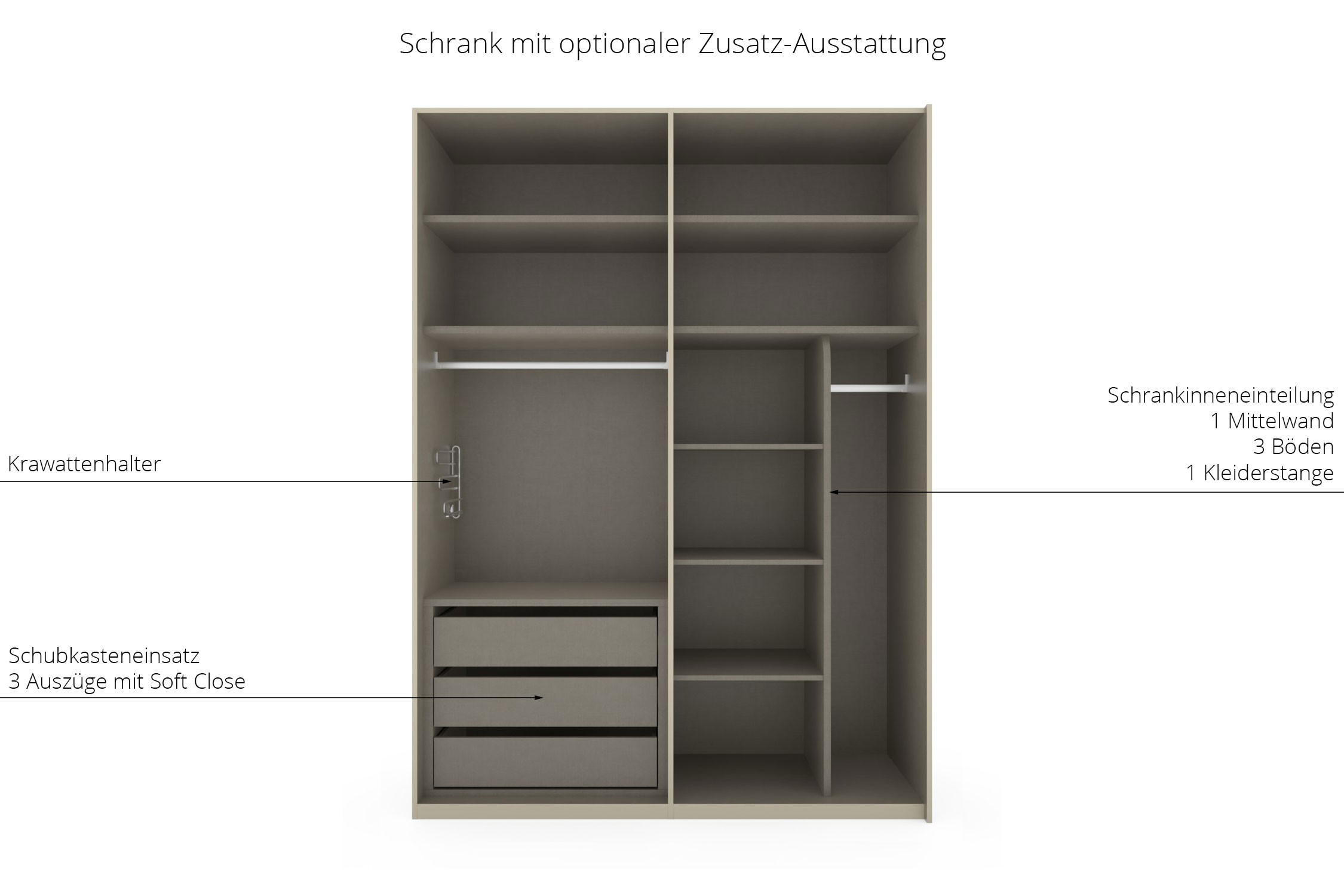 Eine sanfte Farbgebung, moderne Glasauflagen und eine dezente Bauchbinde bestimmen maßgeblich die charmante Optik des Rauch Kleiderschrankes SCALE-Slide-Line. Er ist in der 2-türigen Variante in drei Breiten sowie zwei Höhen, mit einer Tiefe von rund 68 cm, wählbar und kann auch farblich über die angebotenen Zusatzoptionen verändert werden. Als Standard-Ordnungssystem bietet der Schwebetürenschrank insgesamt vier Wäscheböden und zwei Kleiderstangen. Ganz nach Bedarf können Sie die beiden gleichgroßen Schrank-Abteile mit Schubkästen oder weiteren Fachböden ergänzen. Damit Ihr neuer Ordnungshüter besonders leise schließt, empfehlen wir Ihnen den Zukauf der Türdämpfer. Mit dem optionalen Kollisionsdämpfer wird auch ein sanfter Öffnungsvorgang garantiert. Das Programm SCALE der Marke Rauch Black beinhaltet alle in einem Schlafzimmer notwendigen Möbel. Unter den verschiedenen Modell-Beinamen, die sich an den enthaltenen Typen orientieren, finden Sie in unserem Online-Shop auch Drehtürenschränke (SCALE-Spin), Betten (SCALE-Sleep) und diverse Beimöbel (SCALE-Box). Planungen für ein individuelles Schlafzimmer-Set erstellen Ihnen gern unsere Einrichtungsexperten. Diese erreichen Sie telefonisch, im Live-Chat oder auch über unser Kontaktformular.