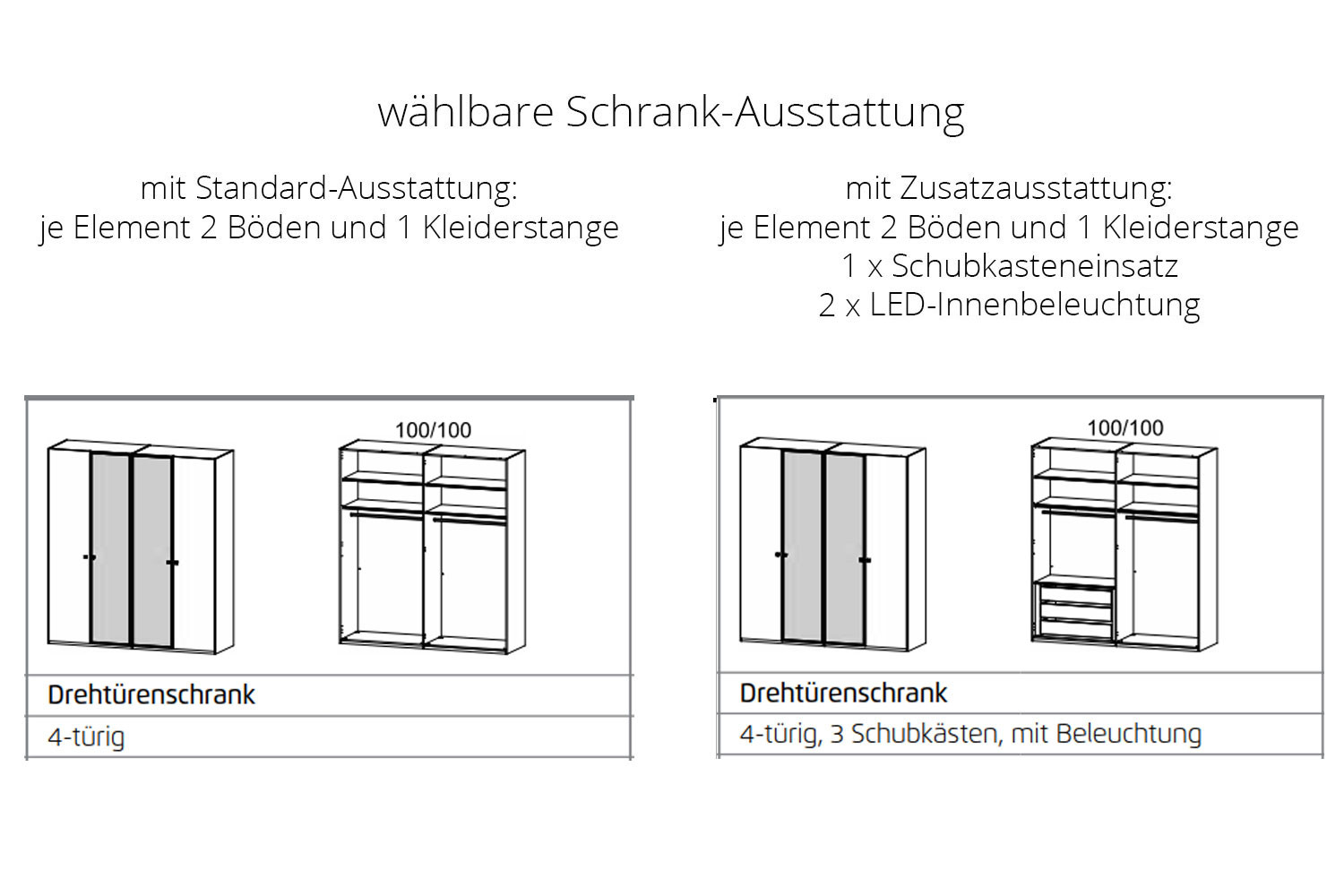 - Schrank: je Element 2 Fachböden und 1 Kleiderstange (Standard-Ausstattung)