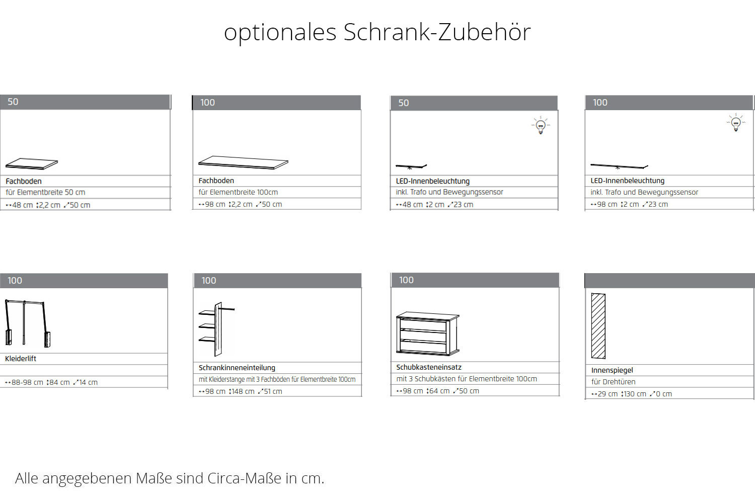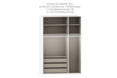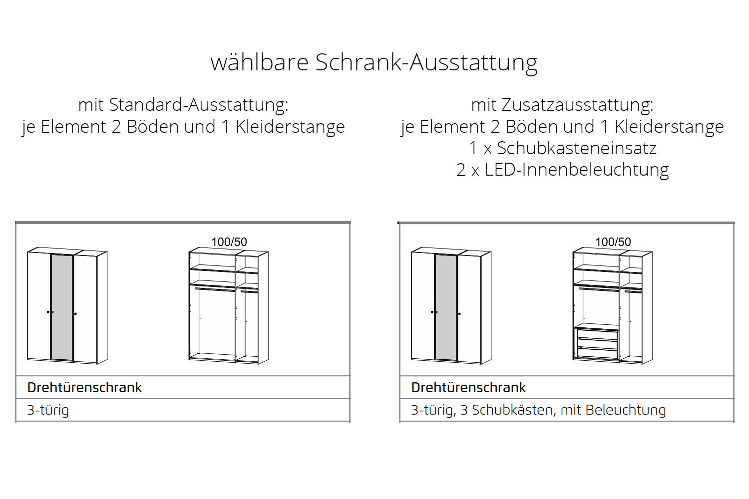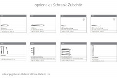 - Schrank: je Element 2 Fachböden und 1 Kleiderstange (Standard-Ausstattung)