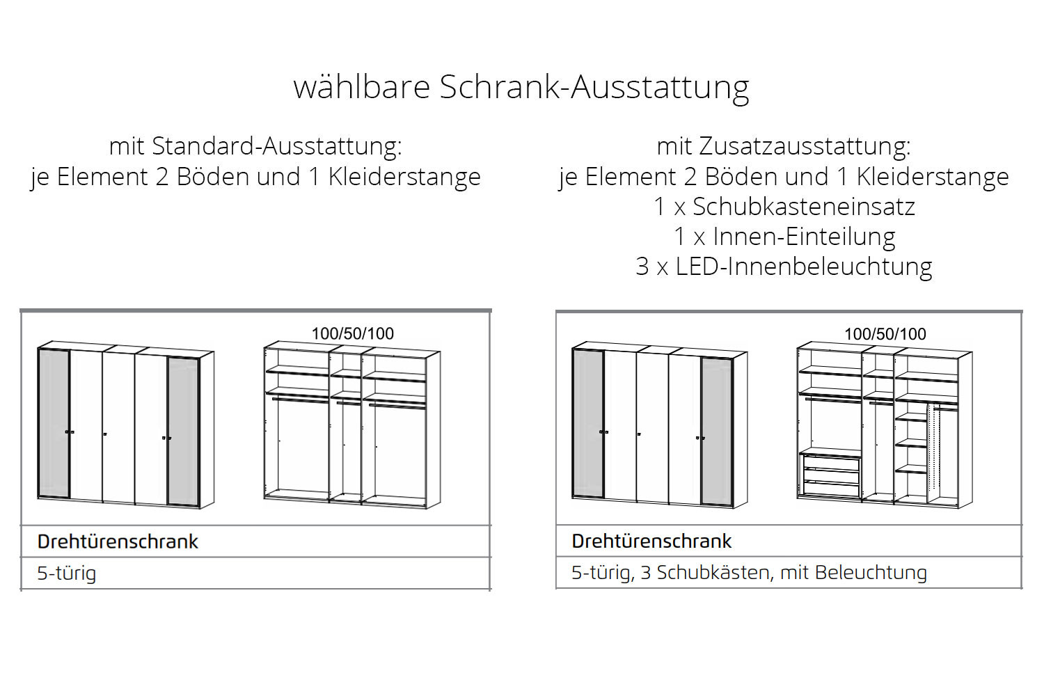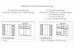 - Schrank: je Element 2 Fachböden und 1 Kleiderstange (Standard-Ausstattung)