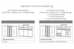 - Schrank: je Element 2 Fachböden und 1 Kleiderstange (Standard-Ausstattung)