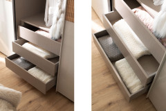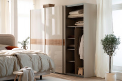 Möbel, mit denen Sie einfach SCHÖNER WOHNEN, finden Sie in großer Auswahl in der gleichnamigen Kollektion. Aus dieser stellen wir Ihnen hier den 3-türigen Kleiderschrank der Serie Minori vor. Mit seiner edlen Glasfront in sanftem Champagner oder erdigem Fango und einer geriffelten Massivholz-Bauchbinde weiß der Ordnungshüter bereits optisch zu überzeugen. Für ein bedarfsgerechtes Interieur stehen Ihnen verschiedene Optionen zur Wahl. Der platzsparend öffnende Schwebetürenschrank ist mit drei unterschiedlichen Zubehör-Sets erhältlich, kann aber auch ganz individuell eingerichtet werden. Bestimmen Sie mithilfe der Zusatzoptionen Ihre favorisierten Attribute, um den Innenraum für Sie passend und bestmöglich nutzbar zu machen. Wählen Sie beispielsweise den Schrank, der in zwei Breiten verfügbar ist, mit dem Zubehörpaket M mit integrierten Türdämpfern und einem Schubkasteneinsatz oder das Zubehör-Set L, das außer den zuvor genannten Elementen eine zusätzliche Wäscheeinteilung und LED-Innenbeleuchtungen beinhaltet, zum Vorzugspreis aus. Ergänzende Fachböden, weitere Schubladen sowie ein ausziehbarer Hosenhalter sind ebenso zubuchbar. Die Aufbewahrung Ihrer gesamten Garderobe kann so einfach sein … mit Minori aus der SCHÖNER WOHNEN Kollektion.