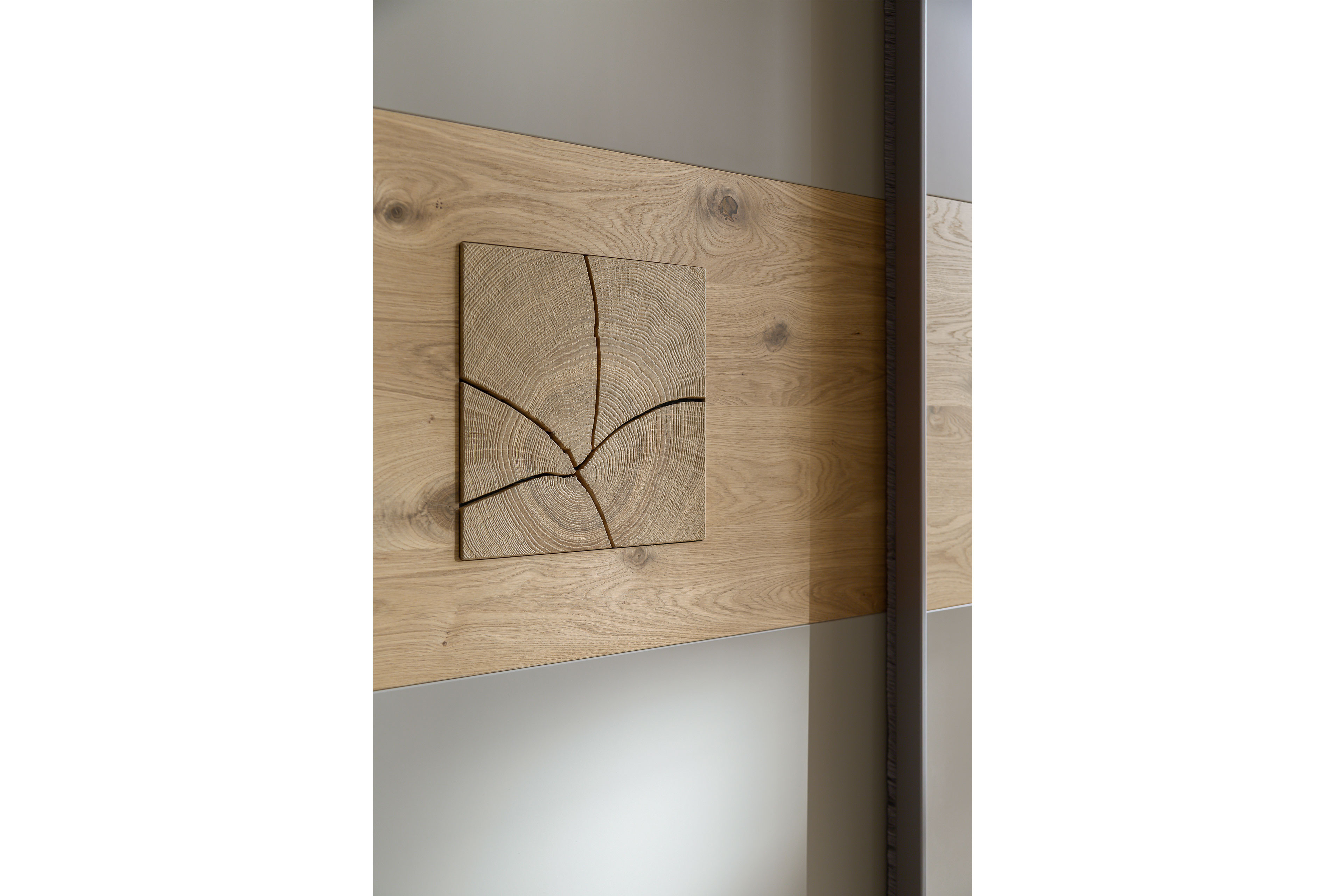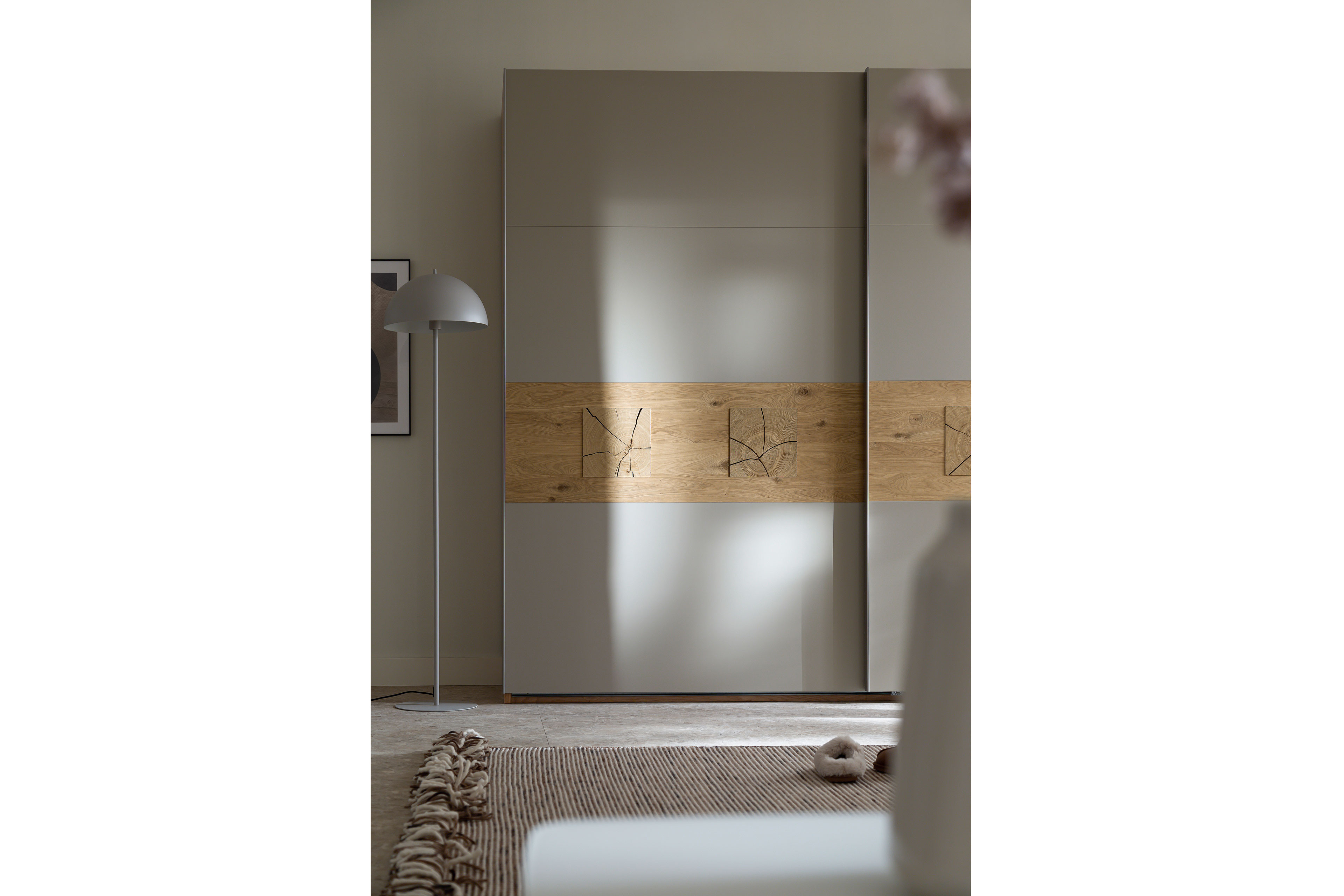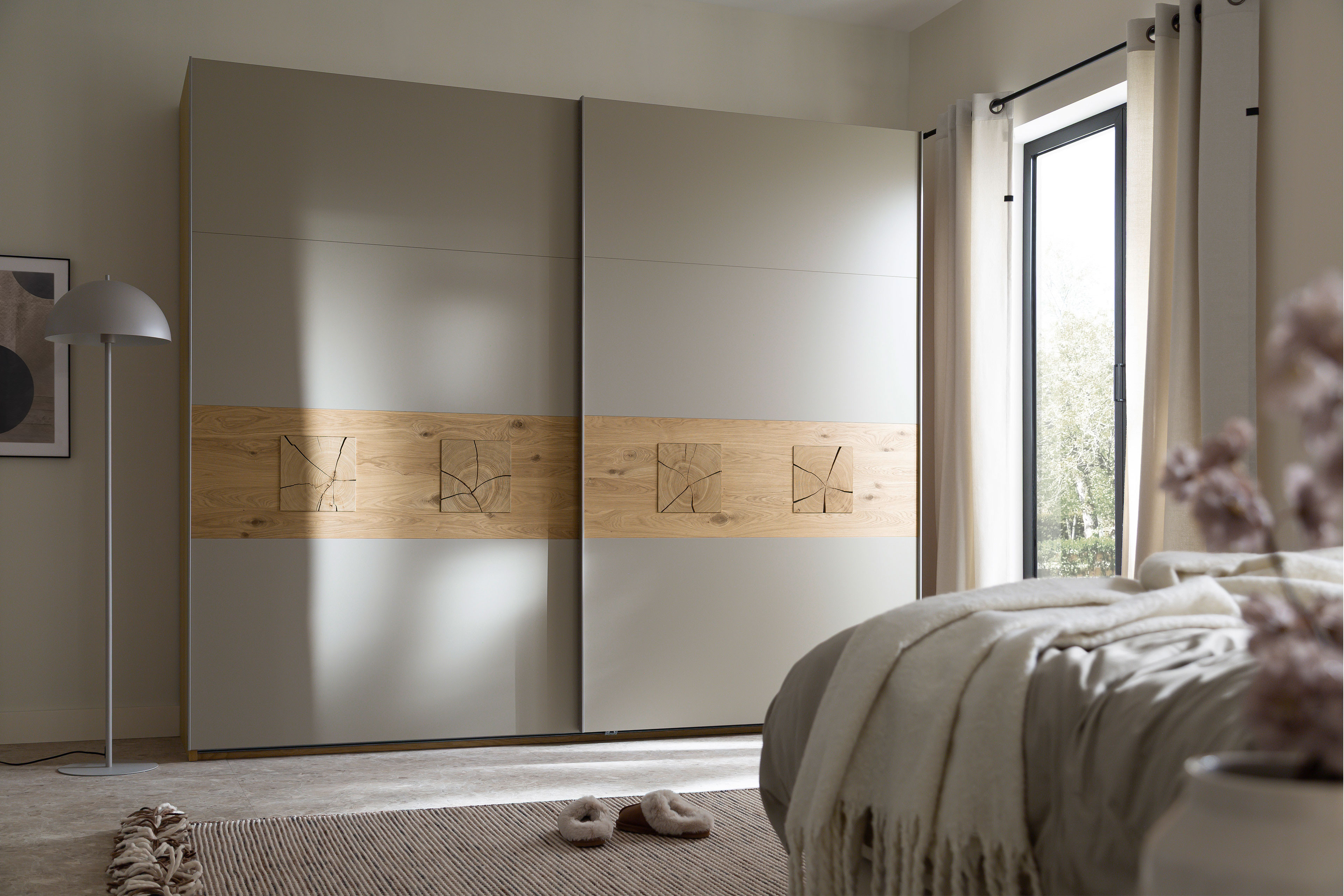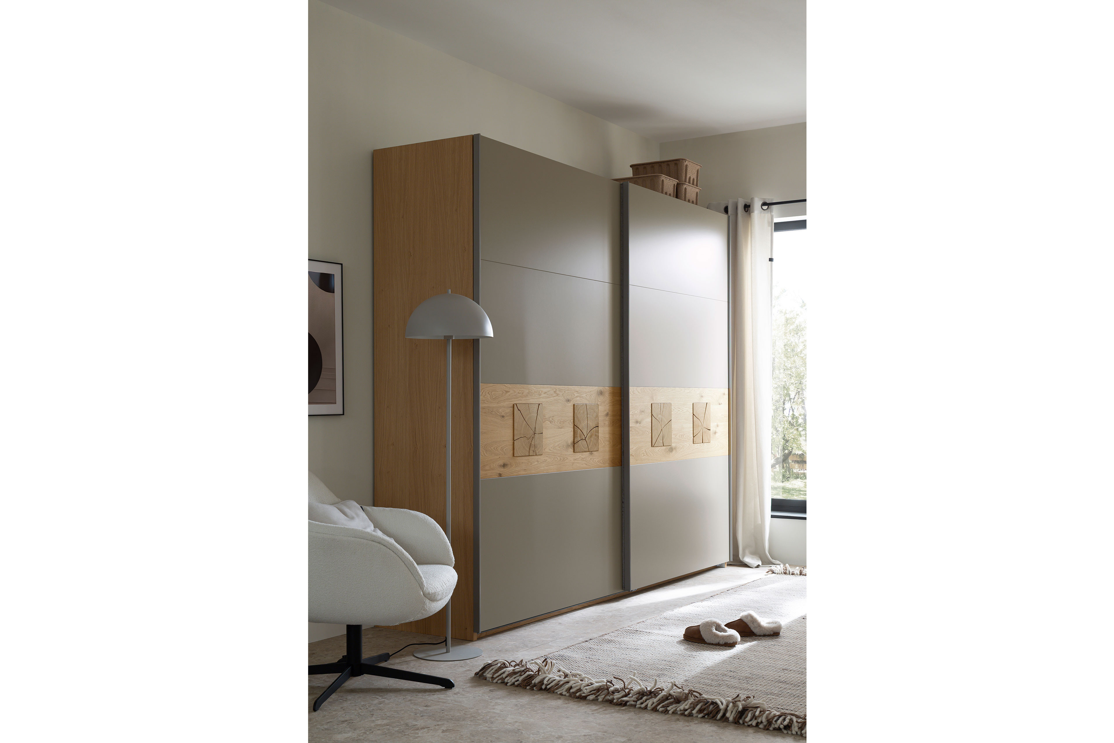 Kleiderschrank von SCHÖNER WOHNEN - Modell Multiline - Bauchbinde mit Quadrateinsätzen Multiline - ein Schlafzimmer, das Geborgenheit schenkt.