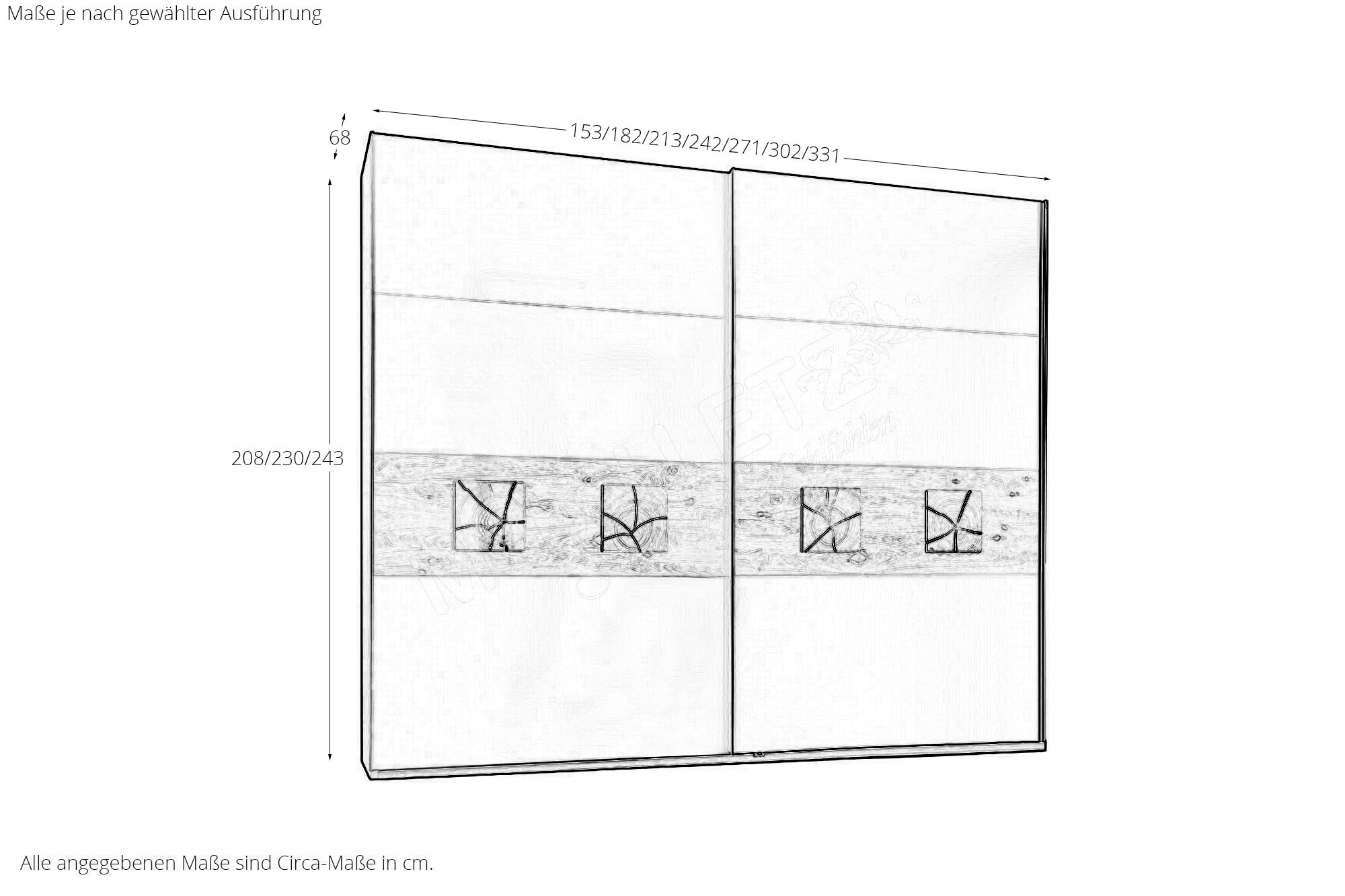 Hinweis: Schranktüren mit Spiegelauflage sind gegebenenfalls mit einer Holznachbildung versehen. Für den Aufbau eines Schrankes in einer Nische benötigen Sie mindestens 3 cm Luft in der Breite und mindestens 2 cm Luft zur Decke!