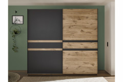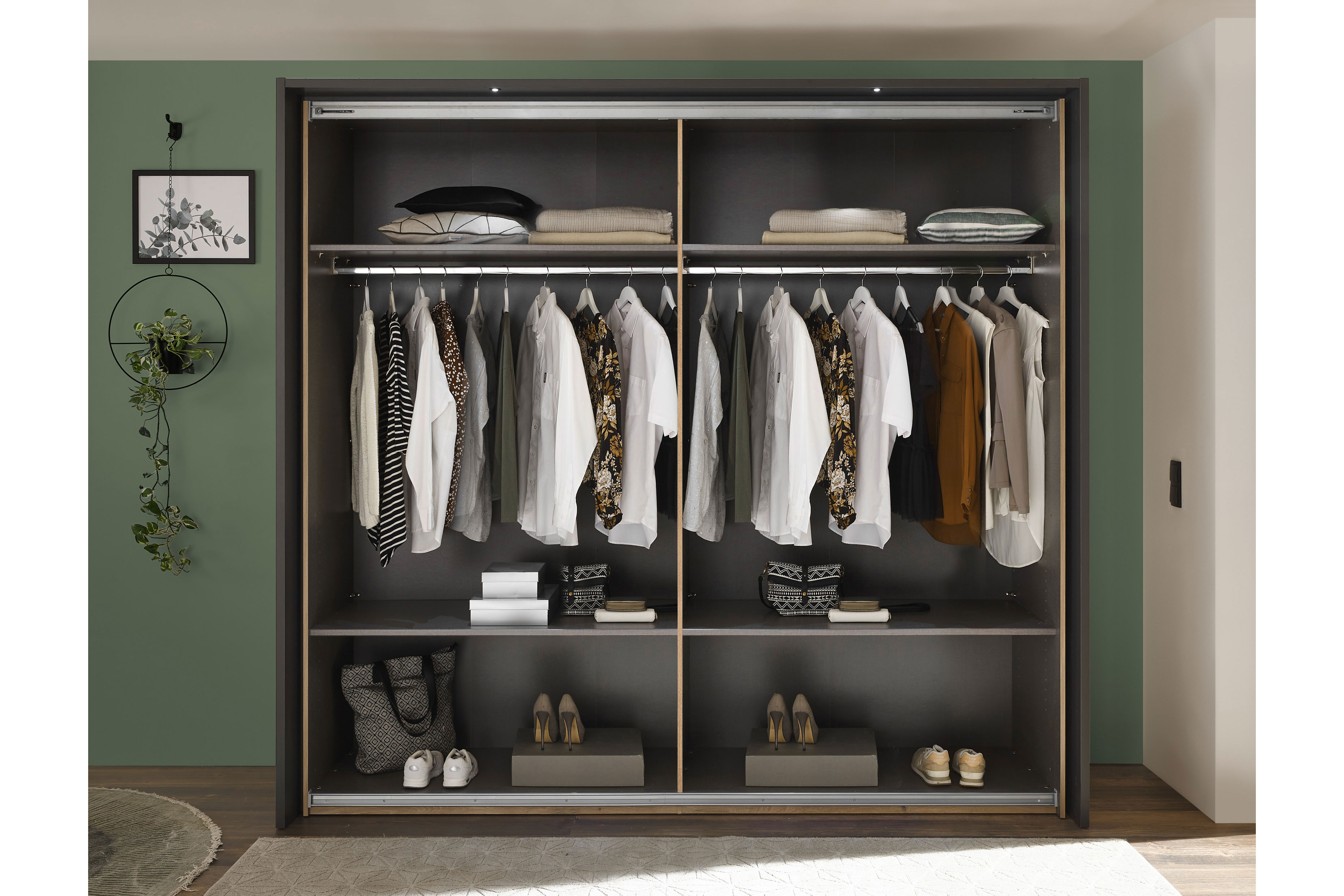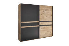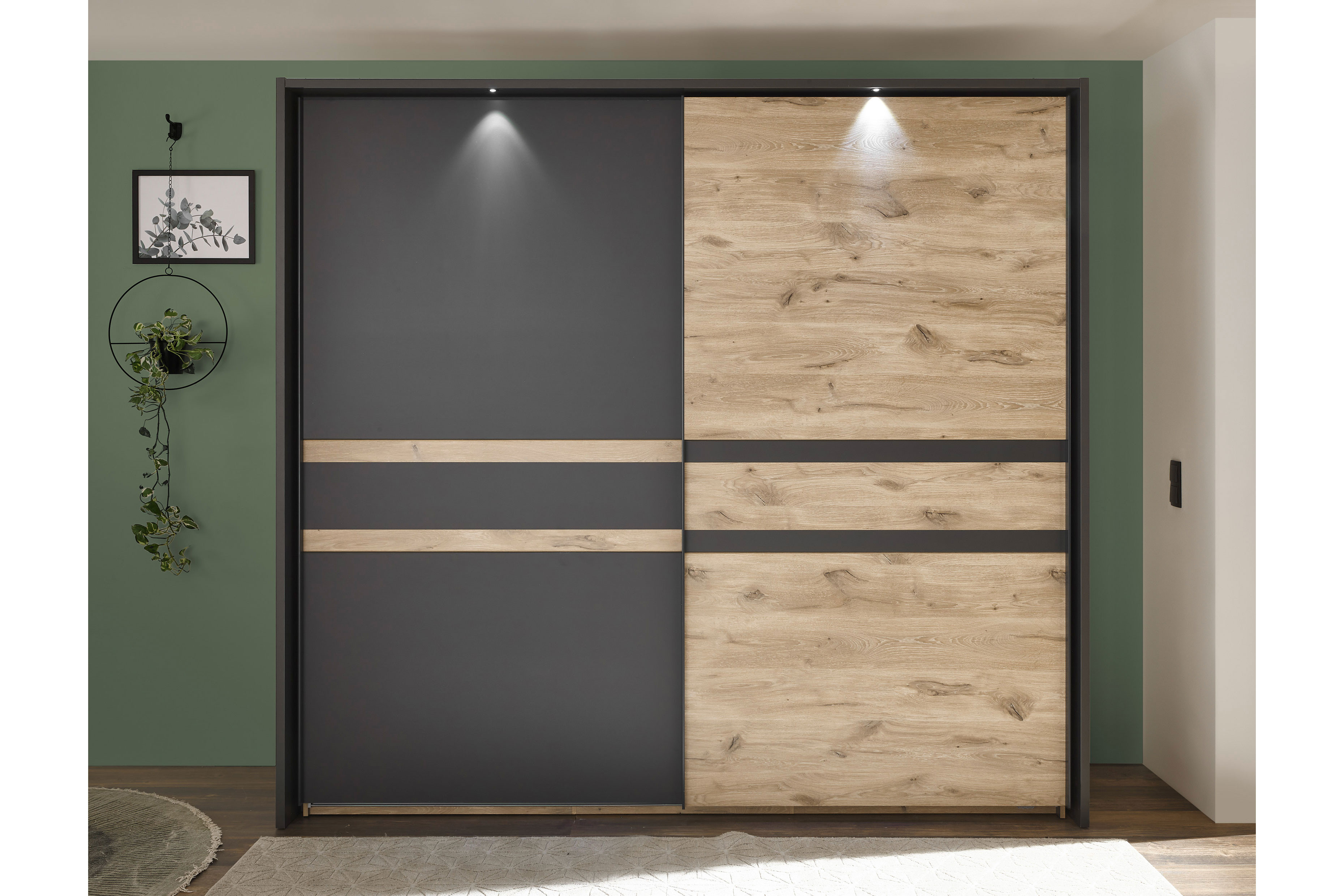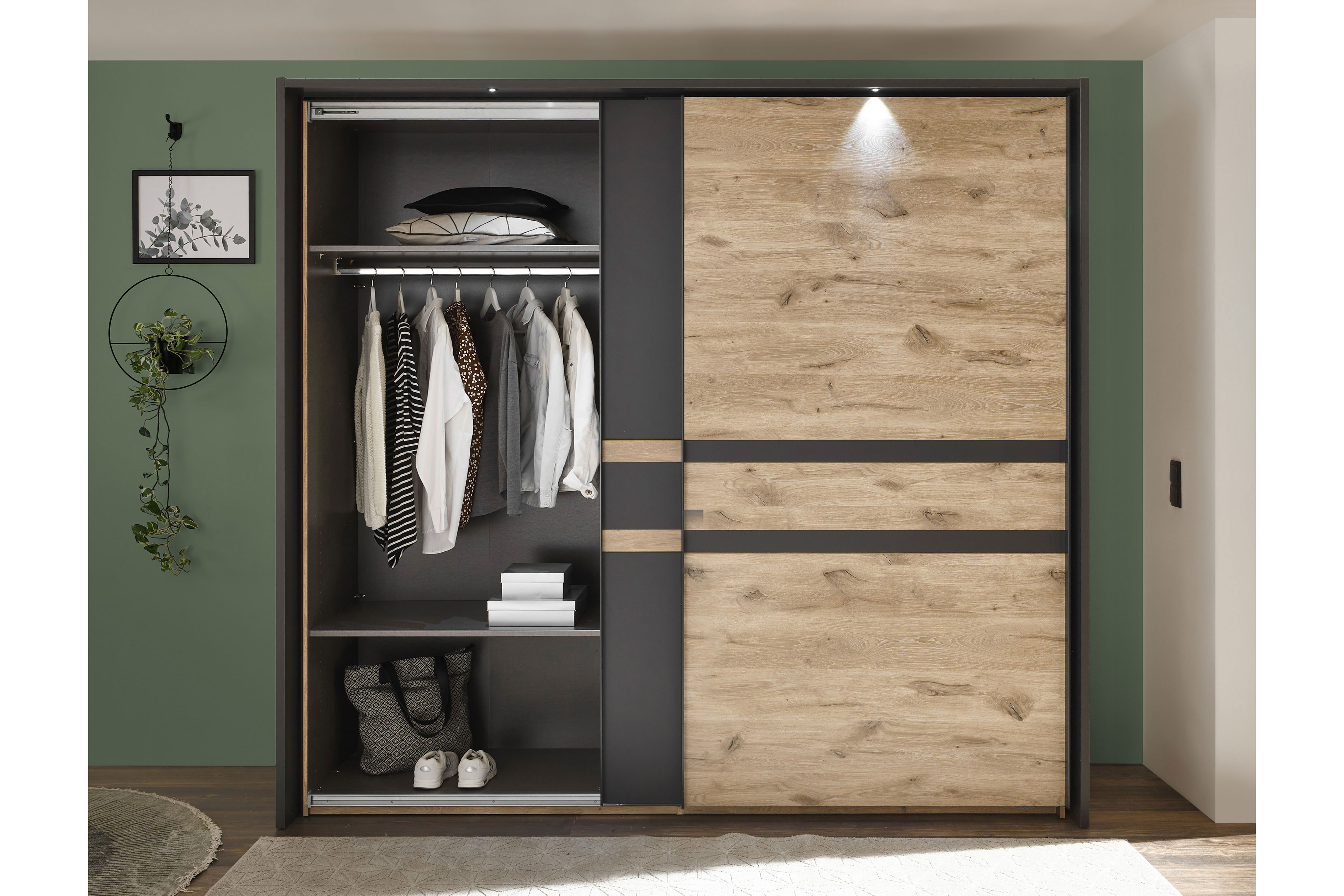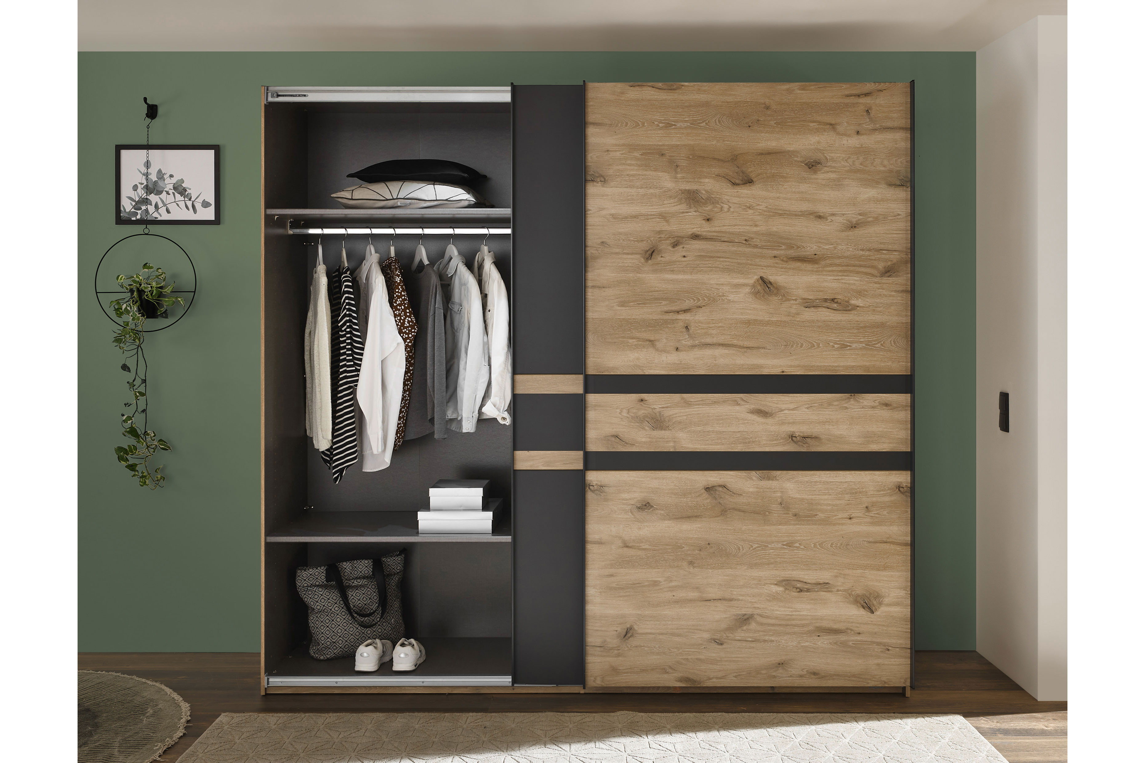 Über zwei etwa 118 cm breite Kleiderschrank-Elemente, die insgesamt vier Böden und zwei Kleiderstangen beherbergen, verfügt die schmale Version des Schwebetürenschrankes aus dem Schlafzimmer-Einrichtungsprogramm Raven von SchlafKONTOR. Dabei zeigen sich der Korpus und die eine Hälfte der Front in einer natürlich wirkenden Viking Oak Nachbildung, während die andere Front-Hälfte in dunklem Graphit auftritt. Optional erhalten Sie als Zubehör verschiedene Komfort-Ausstattungen. Zum einen den dekorativen Rahmen mit Spotbeleuchtung, der als formvollendete Umrandung fungiert und dem Möbelstück eine elegantere und optisch wertvollere Ausstrahlung verleiht. Zum anderen erhalten Sie Dämpfungsbeschläge, die ein leises Öffnen und Schließen ermöglichen, sowie weitere Fachböden und Innen-Schubladen. So können Sie den Innenraum des Schranks mit einem Ordnungssystem Ihrer Wahl ausrüsten, um all Ihre Textilien ordentlich und übersichtlich im Schrank unterzubringen. Der Kleiderschrank aus dem Programm Raven von SchlafKONTOR: Wo modernes Design auf gemütliche Naturtöne trifft.