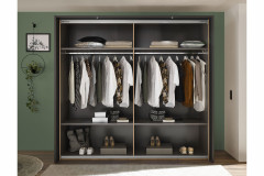 Schwebetürenschrank von SchlafKONTOR - Modell Raven / Xora - mit 4 Böden und 2 Kleiderstangen Raven: Wo modernes Design auf gemütliche Naturtöne trifft.