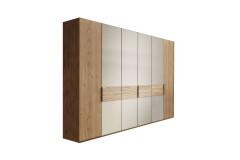 Die urigen Riffholz-Absetzungen auf den mittleren, champagnerfarbenen Türen des etwa 300 x 216 x 58 cm großen Ordnungshüters aus dem Schlafzimmer-Programm Cadiz von Wiemann gestalten die Optik besonders attraktiv. Eine authentische Eichenholz-Nachbildung ummantelt sowohl den Korpus als auch die Fronten der beiden Außentüren und schafft damit ein stimmiges, harmonisches Gesamtbild. Der Schrank-Innenraum wurde in drei gleich große Abteile untergliedert, die jeweils zwei Wäscheböden und eine Kleiderstange als Standard-Ordnungssystem bereithalten. Eine noch individuellere und bestmöglich an Ihre Bedürfnisse angepasste Unterteilung erhalten Sie mit dem zubuchbaren Zubehör. Bestimmen Sie selbst, welche Optionen geeignet sind: Weitere Fachböden, ein praktischer Kleiderlift, in der Höhe variabel einbaubare Schubladen oder auch ein ausziehbarer Hosenhalter stehen zur Auswahl in den Zusatzoptionen bereit. Des Weiteren können Sie einen Innenspiegel sowie den gezeigten Passepartout-Rahmen, mit oder ohne LED-Leuchten, zukaufen. Das Modell Cadiz aus der Wiemann Kollektion enthält natürlich noch viele weitere Kleiderschrank-Varianten sowie Betten und Beimöbel. Im Typenplan, der unter Downloads zur Ansicht hinterlegt wurde, finden Sie alle zugehörigen Elemente und für eine individuelle Bestellung oder Möbel-Planung stehen Ihnen unsere Einrichtungsexperten per Telefon oder Live-Chat gern zur Verfügung.