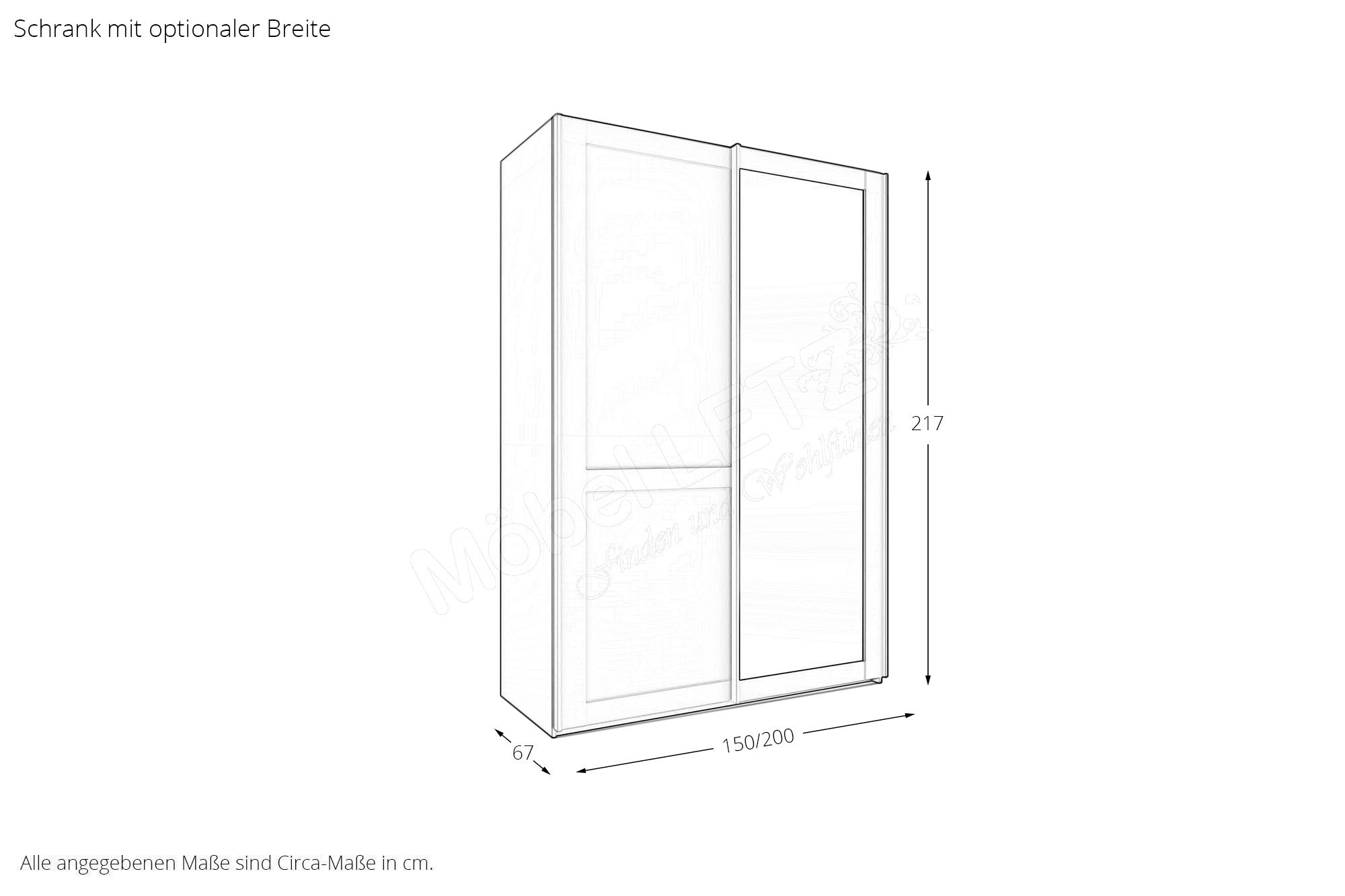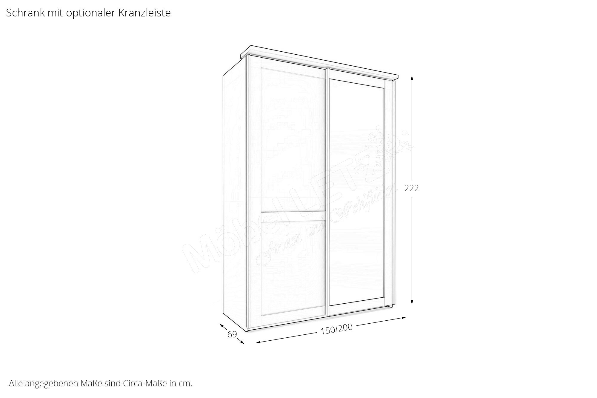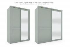Während klassische Landhausschränke mit schmalen Drehtüren aufwarten, zeigt sich der Wiemann Schrank aus dem Schlafzimmerprogramm Marlow mit platzsparend öffnenden Schwebetüren, wobei das rechte Türblatt mit einem großflächigen Kristallspiegel ausgerüstet wurde. Der Ordnungshüter ist etwa 217 cm hoch, rund 67 cm tief und kann in zwei Breiten bestellt werden: ca. 150 cm oder ca. 200 cm. Optional ist der Landhaus-Kleiderschrank auch ohne Spiegel kaufbar. Für das Innere, das eine Standard-Ausstattung mit insgesamt vier Wäscheböden und zwei Kleiderstangen bietet, können Sie mithilfe der Zusatzoptionen praktische, in der Höhe variabel montierbare Schubladen sowie weitere Fachböden hinzubuchen. Als Beleuchtungslösung stehen Ihnen eine optionale Kranzleiste mit Spots und wiederaufladbare Innenleuchten mit Bewegungsmelder zur Wahl. Gestalten Sie den Marlow Schrank im Landhausstil ganz nach Ihren individuellen Wünschen und Bedürfnissen, gern auch in einer alternativen Farbe, die Sie ebenfalls in den Zusatzoptionen über das Attribut „Ausführung“ bestimmen können.