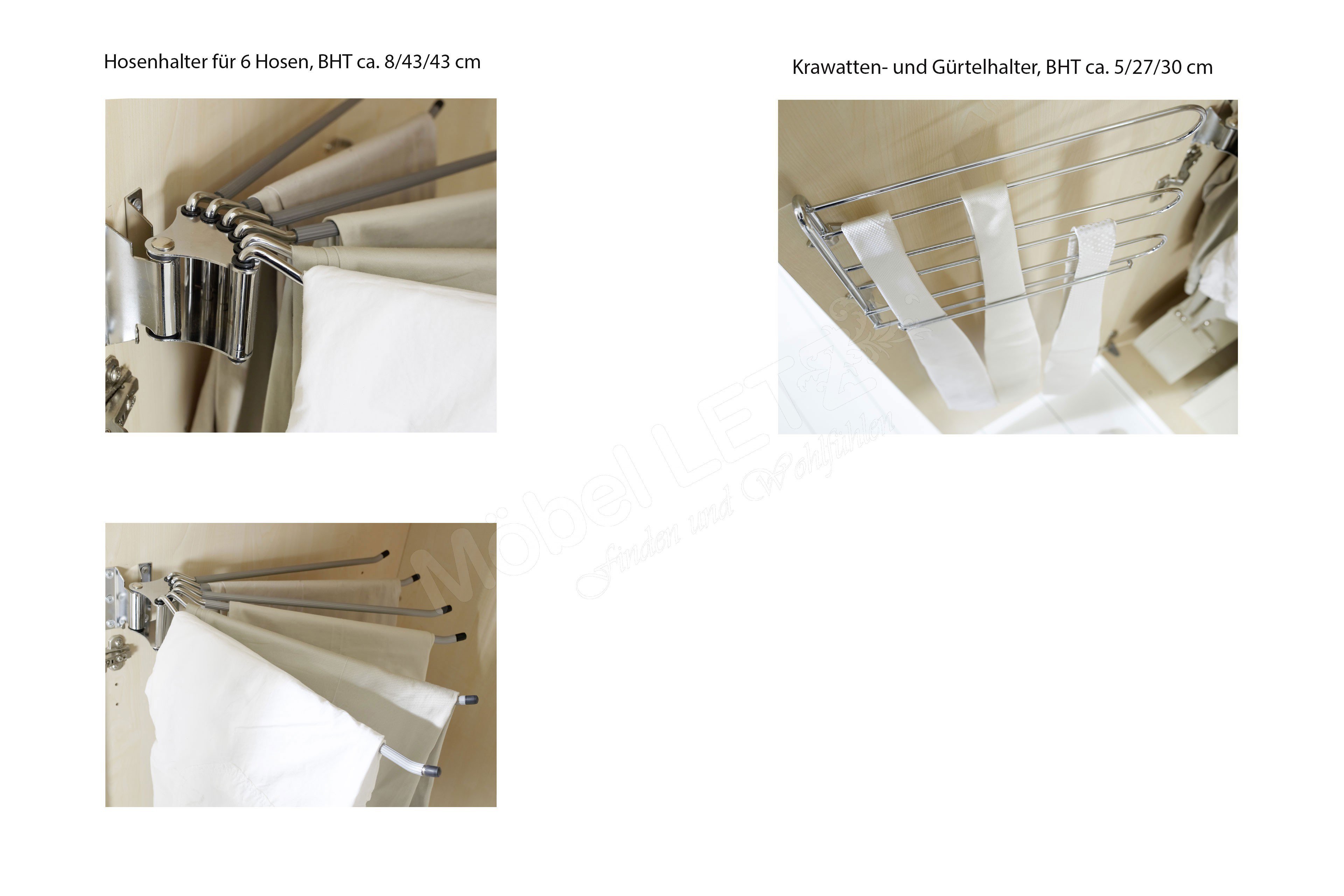- Kleiderschrank: Innenausstattung linkes Element 1 Fachboden, 1 Kleiderstange und 3 Schubkästen, rechtes Element 1 Fachboden, 1 Kleiderstange, mittleres Element 2 Fachböden und 3 Schubkästen