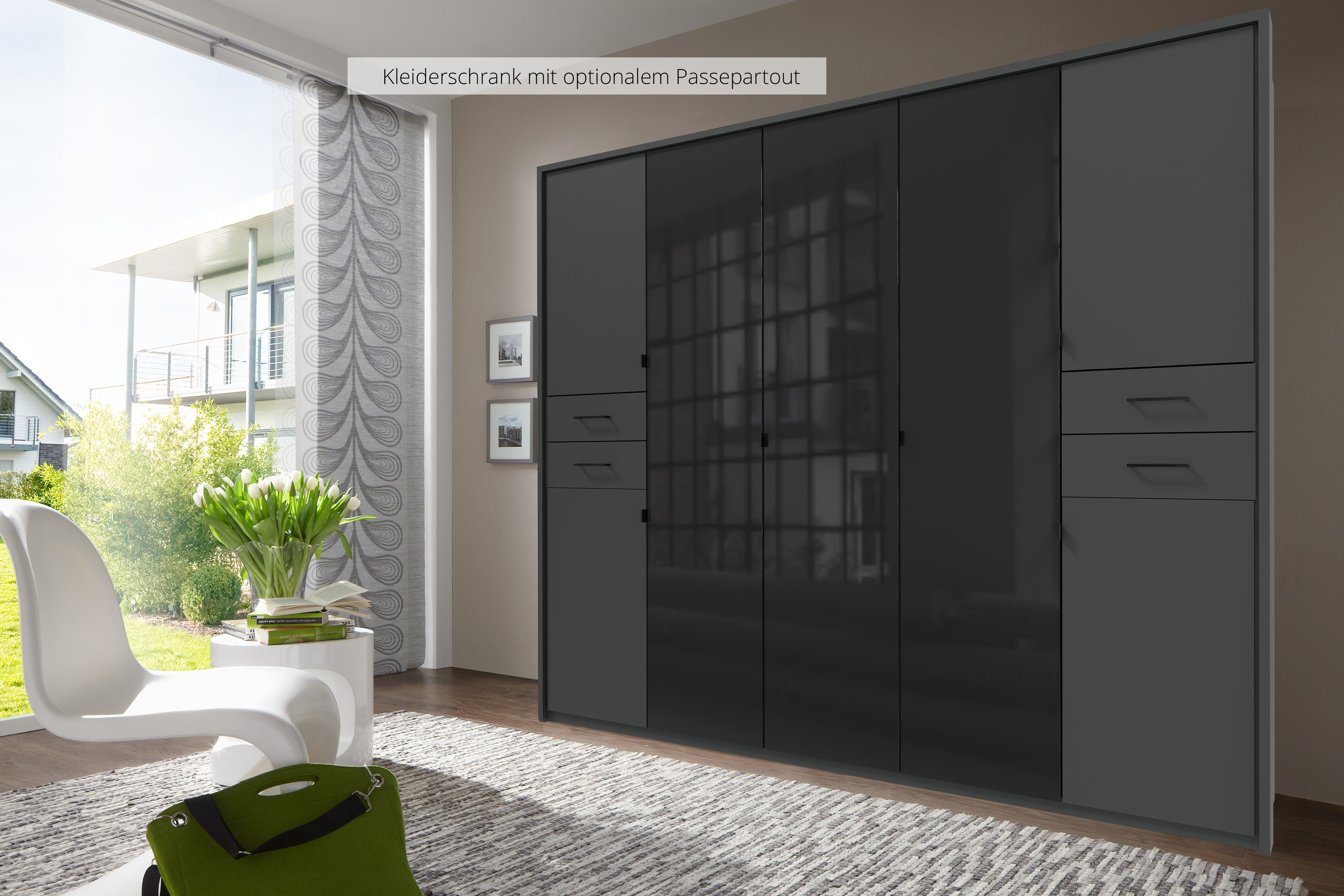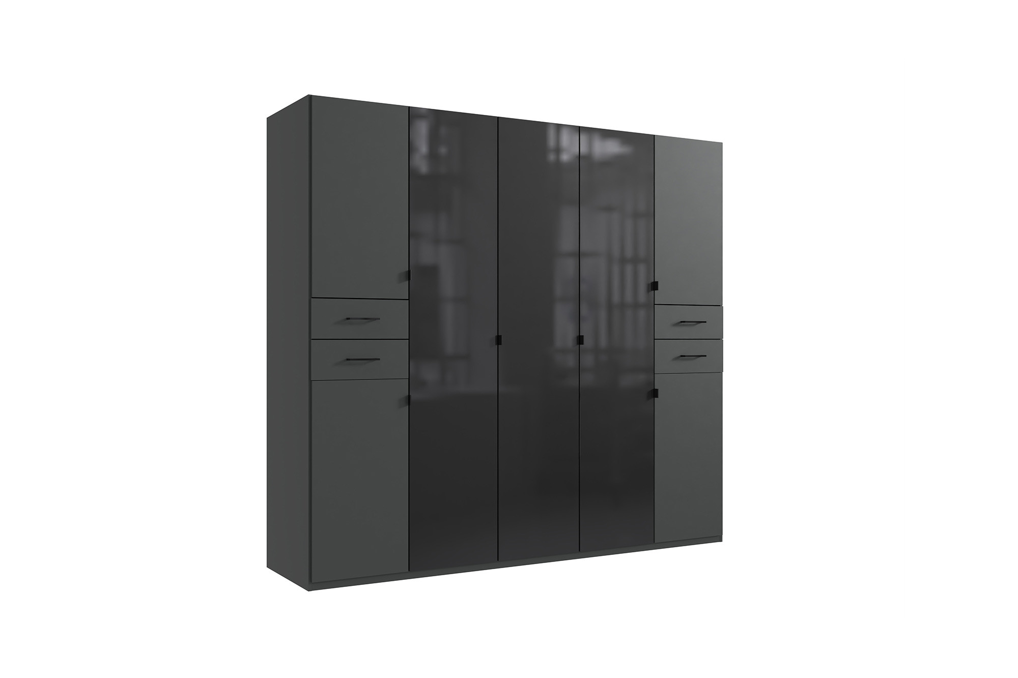 Mit dem Kleiderschrank Danzig von Wimex holen Sie sich edlen Stauraum in Ihr Schlafzimmer. Der geräumige Schrank kombiniert stilvoll Drehtüren mit vier praktischen Schubkästen. Die Schubladen sind dank ihrer durchdachten Höhe bequem erreichbar. Das erleichtert Ihnen sowohl das Einsortieren als auch das Herausholen Ihrer kleineren Wäschestücke und Accessoires. Ein besonderes Stilmerkmal des Wimex Kleiderschranks sind die drei Glastüren, die sich je nach gewählter Farbe in kräftigem Schwarz oder in zeitlosem Weiß zeigen. Mit Danzig bekommen Sie ein tolles vorgefertigtes Ordnungskonzept, das Ihnen viele Fächer und genügend Platz für hängende Kleidungsstücke bietet. Die beiden äußeren Schrankelemente besitzen ober- und unterhalb der Schubladen noch zwei Fachböden. Dadurch stehen Ihnen insgesamt vier Fächer für Ihre Lieblingskleidung zur Verfügung. Die Glastüren verbergen zwei Schrankabteile, die beide mit einer Kleiderstange und einem Wäscheboden ausgestattet sind. Ändern Sie auf Wunsch mit unseren Zusatzoptionen die Farbe von Danzig oder bestellen Sie ganz bequem weitere Einlegeböden und eine passende Schrankbeleuchtung dazu. Freuen Sie sich auf einen Kleiderschrank, der Ihre Mode gut für Sie aufbewahrt und dabei noch tolle Akzente im Schlafzimmer setzt – mit Danzig von Wimex.