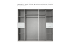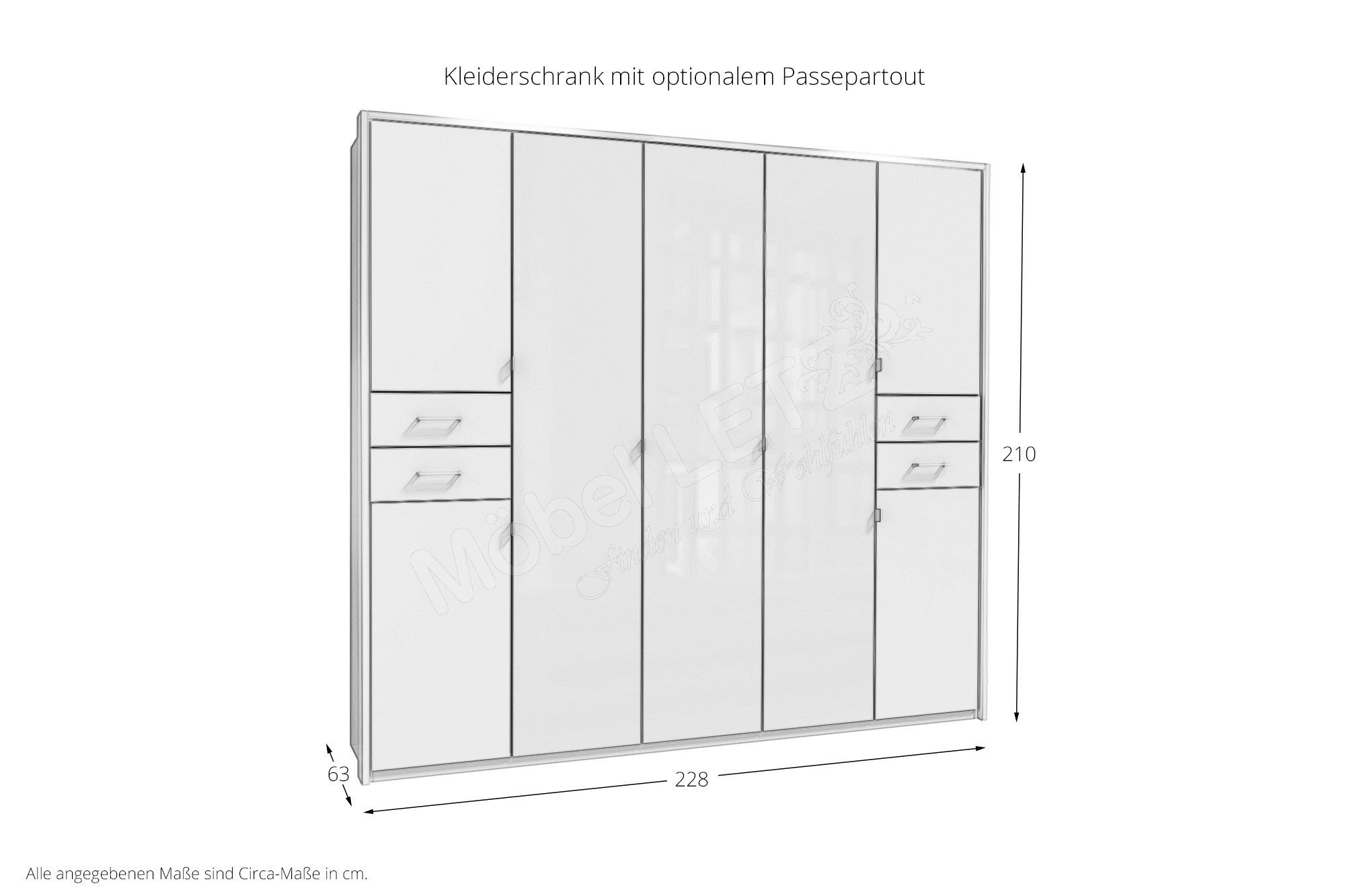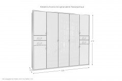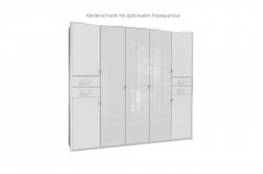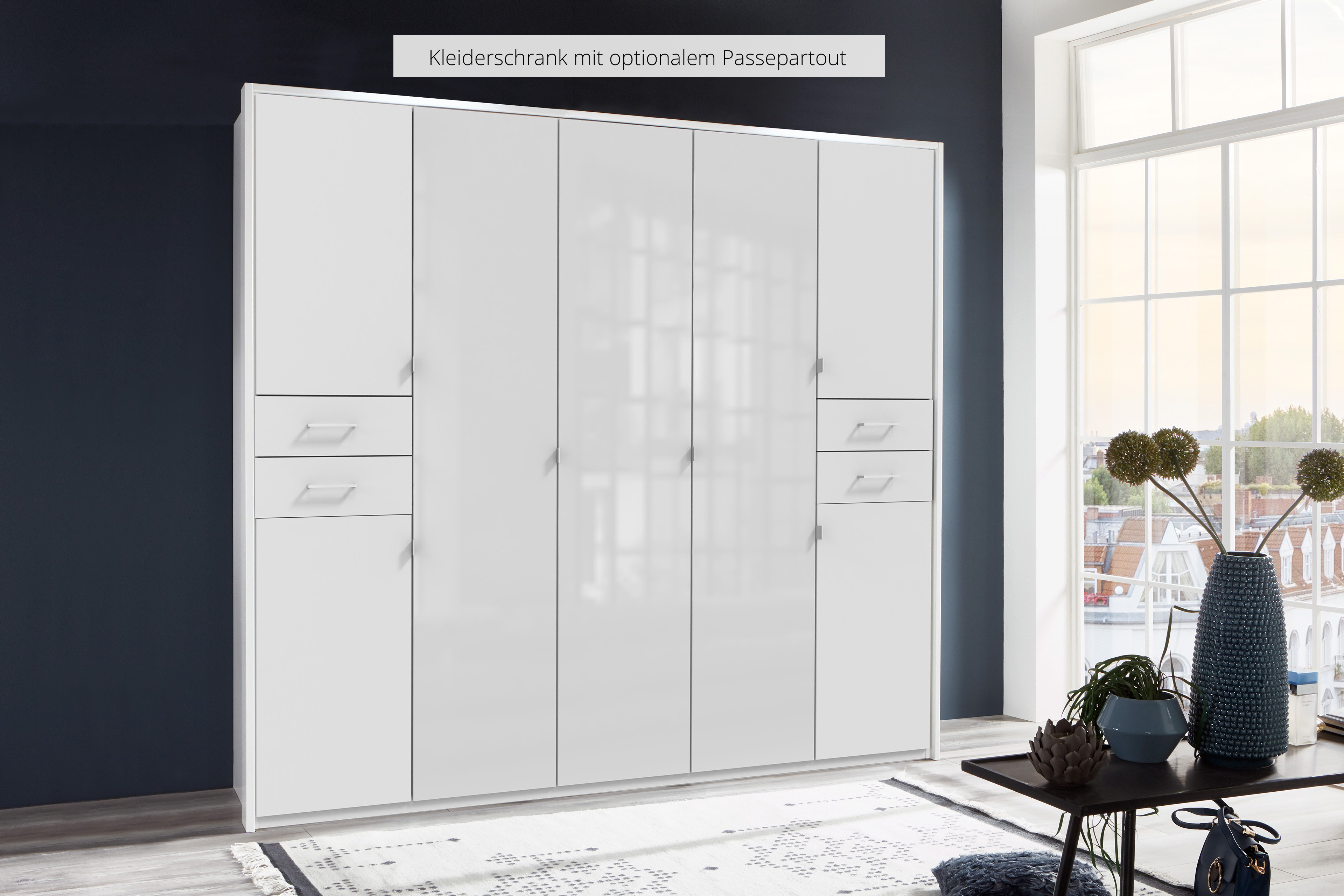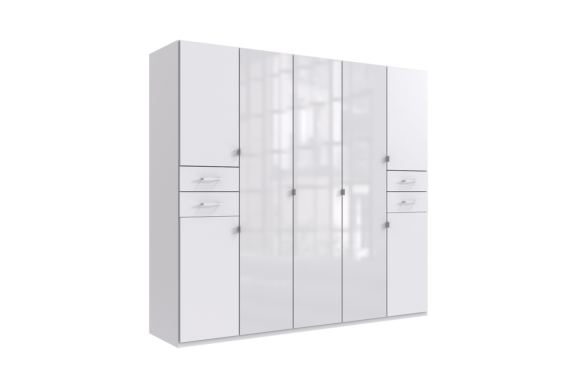 Mit dem Kleiderschrank Danzig von Wimex holen Sie sich edlen Stauraum in Ihr Schlafzimmer. Der geräumige Schrank kombiniert stilvoll Drehtüren mit vier praktischen Schubkästen. Die Schubladen sind dank ihrer durchdachten Höhe bequem erreichbar. Das erleichtert Ihnen sowohl das Einsortieren als auch das Herausholen Ihrer kleineren Wäschestücke und Accessoires. Ein besonderes Stilmerkmal des Wimex Kleiderschranks sind die drei Glastüren, die sich je nach gewählter Farbe in kräftigem Schwarz oder in zeitlosem Weiß zeigen. Mit Danzig bekommen Sie ein tolles vorgefertigtes Ordnungskonzept, das Ihnen viele Fächer und genügend Platz für hängende Kleidungsstücke bietet. Die beiden äußeren Schrankelemente besitzen ober- und unterhalb der Schubladen noch zwei Fachböden. Dadurch stehen Ihnen insgesamt vier Fächer für Ihre Lieblingskleidung zur Verfügung. Die Glastüren verbergen zwei Schrankabteile, die beide mit einer Kleiderstange und einem Wäscheboden ausgestattet sind. Ändern Sie auf Wunsch mit unseren Zusatzoptionen die Farbe von Danzig oder bestellen Sie ganz bequem weitere Einlegeböden und eine passende Schrankbeleuchtung dazu. Freuen Sie sich auf einen Kleiderschrank, der Ihre Mode gut für Sie aufbewahrt und dabei noch tolle Akzente im Schlafzimmer setzt – mit Danzig von Wimex.