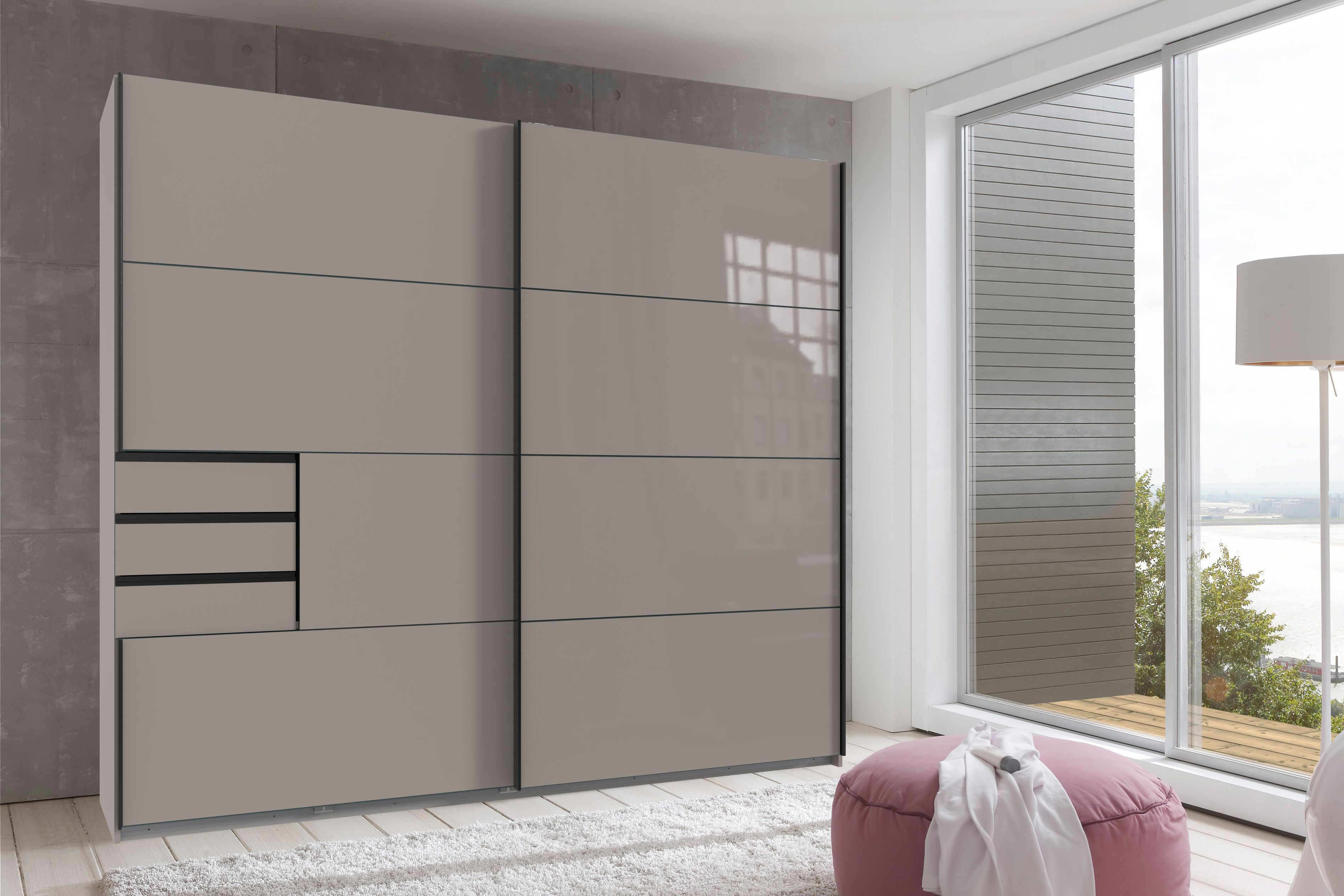 Schwebetürenschrank Tilburg von Wimex – kompakt, elegant und klug durchdacht, bietet er alles, was Sie für eine ordentliche und ästhetische Kleideraufbewahrung benötigen. In der ca. 225 cm breiten und etwa 208 cm hohen Ausführung ist der Kleiderschrank perfekt für mittelgroße bis größere Schlafräume, ohne den Raum zu überladen. Die linke Schrankhälfte eignet sich mit drei eingelassenen Schubkästen perfekt, um Kleinutensilien, Accessoires und Wäsche zu sortieren und direkt griffbereit zu haben. Zusätzlich begeistert Tilburg mit zwei kreativen Frontvarianten: Die linke Tür, die sich in mattem Dekor zeigt, wird durch die elegante Glasfront der rechten Tür ergänzt. In der saharafarbenen Variante besticht der Wimex Schrank mit einer Ton-in-Ton gehaltenen Glastür, die Sie wahlweise auch gegen einen Spiegel oder eine schwarze Glastür auswählen können. Auch im Inneren weiß der Schrank zu überzeugen: Links sorgt Tilburg mit seinen Schubkästen, zwei großen und zwei kleinen Böden für eine strukturierte Gliederung und eine klare Übersicht. Die rechte Schrankseite bietet mit ihrer Kleiderstange viel Platz für Kleider, Hemden, Anzüge und lange Kleidungsstücke. So bleibt alles ordentlich und schnell griffbereit. Mit unserem Konfigurator lassen sich zusätzliche Böden, Krawatten- oder Gürtelhalter sowie Dämpfungsbeschläge hinzufügen und Sie erhalten einen Schrank, der sich Ihren Bedürfnissen und Ihrem Raum anpasst. Nutzen Sie die attraktive Gestaltungsvielfalt und wählen Sie zwischen dem warmen Beige-Ton und edlem Grafit und freuen Sie sich auf einen Kleiderschrank, der sich modern und zeitlos in Ihr Schlafzimmer einfügt und mit seinen neutralen Farben ein ruhiges Ambiente schafft.