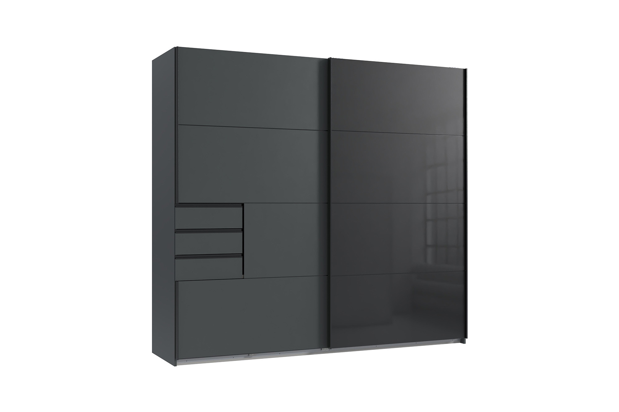Schwebetürenschrank Tilburg von Wimex – kompakt, elegant und klug durchdacht, bietet er alles, was Sie für eine ordentliche und ästhetische Kleideraufbewahrung benötigen. In der ca. 225 cm breiten und etwa 208 cm hohen Ausführung ist der Kleiderschrank perfekt für mittelgroße bis größere Schlafräume, ohne den Raum zu überladen. Die linke Schrankhälfte eignet sich mit drei eingelassenen Schubkästen perfekt, um Kleinutensilien, Accessoires und Wäsche zu sortieren und direkt griffbereit zu haben. Zusätzlich begeistert Tilburg mit zwei kreativen Frontvarianten: Die linke Tür, die sich in mattem Dekor zeigt, wird durch die elegante Glasfront der rechten Tür ergänzt. In der dunkelgrauen Variante besticht der Wimex Schrank mit einer eleganten Glastür in Schwarz. Mit unseren wählbaren Optionen ist der Schrank auch in anderen Farben erhältlich. Zusätzlich überzeugt das Modell Tilburg auch im Inneren: Links sorgt der Schrank von Wimex mit seinen Schubkästen, zwei großen und zwei kleinen Böden für eine strukturierte Gliederung und eine klare Übersicht. Die rechte Schrankseite bietet mit ihrer Kleiderstange viel Platz für Kleider, Hemden, Anzüge und lange Kleidungsstücke. So bleibt alles ordentlich und schnell griffbereit. Mit unserem Konfigurator lassen sich zusätzliche Böden, Krawatten- oder Gürtelhalter sowie Dämpfungsbeschläge hinzufügen und Sie erhalten einen Schrank, der sich Ihren Bedürfnissen und Ihrem Raum anpasst. Nutzen Sie die attraktive Gestaltungsvielfalt und wählen Sie zwischen dem warmen Beige-Ton und edlem Grafit und freuen Sie sich auf einen Kleiderschrank, der sich modern und zeitlos in Ihr Schlafzimmer einfügt und mit seinen neutralen Farben ein ruhiges Ambiente schafft.
