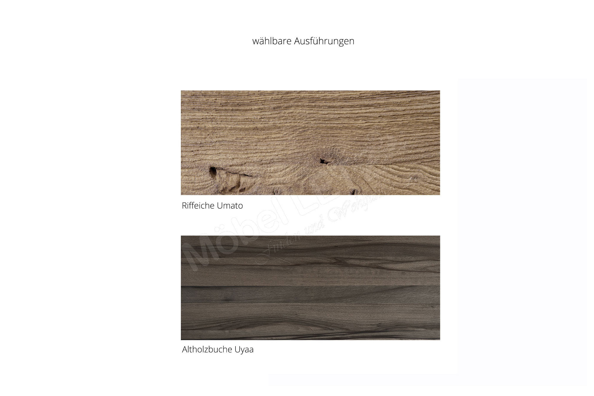 - Tischplatte: Riffeiche Umato, Massivholz, Hirnholzapplikation