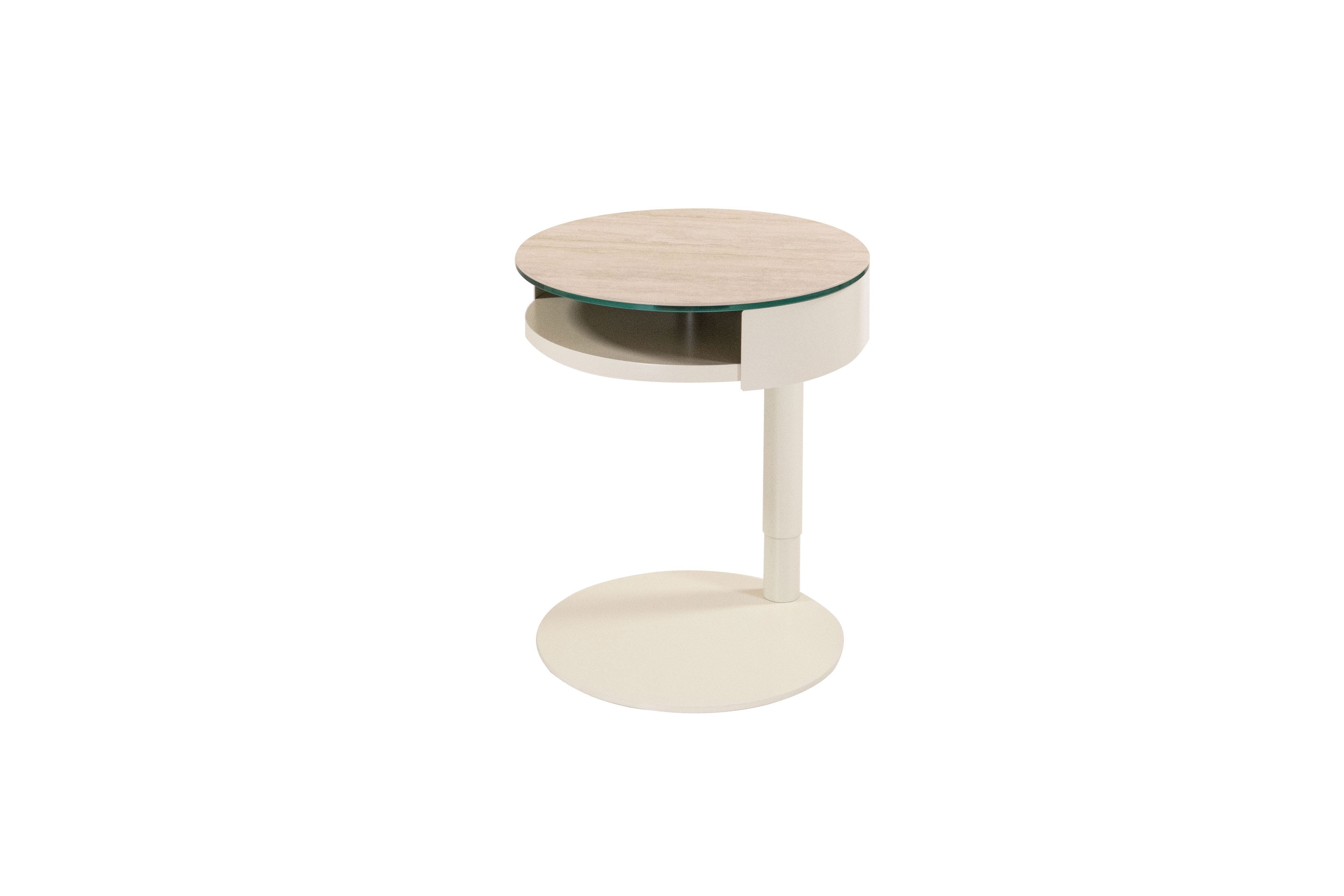 Mit diesem Beistelltisch aus der Modellreihe Merkur K444 ist dem Hersteller Ronald Schmitt ein galaktischer Auftritt gelungen. Die runde Tischplatte aus Keramik Travertino ruht auf einer kleinen stabilen und drehbaren Säule. Auf dieser lässt sich die Platte um die eigene Achse drehen und passt sich somit an Ihren Moment an. Durch die darunter liegende Tischplatte in Perlweiß erhalten Sie einen Zwischenraum, der als Ablagefach für kleinere Dinge dient. Verstauen Sie zum Beispiel Ihr Ladekabel vom Smartphone oder Ihre Fernbedienungen. Somit sieht Ihre neue Errungenschaft immer ordentlich aus. Die höhenverstellbare Säule ermöglicht es Ihnen, Merkur spielend leicht auf Ihre Wunschhöhe zu bringen und die stabile Bodenplatte aus lackiertem Edelstahl sorgt für die nötige Standfestigkeit. Egal ob im Wohnzimmer neben dem Sofa, im Empfangsbereich oder als stilvolle Ablage in Ihrem Büro – dieser Beistelltisch fügt sich harmonisch in verschiedene Einrichtungsstile ein. Holen Sie sich mit Merkur K444 von Ronald Schmitt ein Stück Galaxy nach Hause.