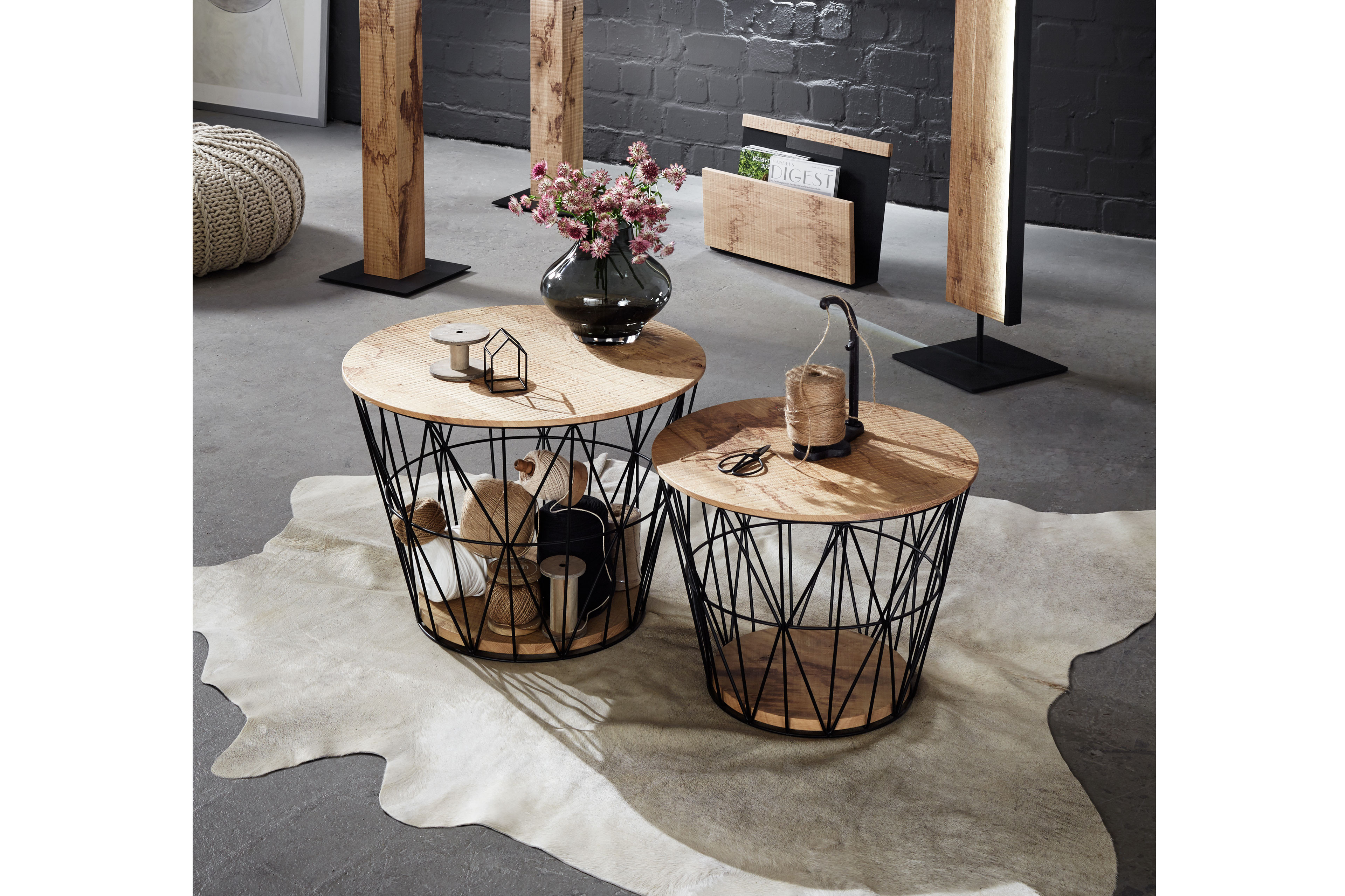 Der Hartmann Couchtisch aus der Kollektion Naturstücke mit einem Metallkorbgestell und der Tischplatte aus Riffeiche Umato ist ein modernes sowie gleichzeitig naturnahes Möbelstück. Das Gestell in elegantem Anthrazit verleiht dem Tisch zum einen eine robuste Stabilität, zum anderen eine zeitgemäße Optik. Die massive Tischplatte fügt sich perfekt in das Gesamtbild ein und übermittelt einen Hauch von rustikaler Schönheit. Der Metallkorb unterhalb der Tischplatte dient nicht nur als stilvolles Gestaltungselement, sondern bietet auch zusätzlichen Stauraum für Kissen, Decken oder andere Gegenstände. Dadurch können Sie Ihre Wohnzimmereinrichtung ordentlich und organisiert halten. Der Wohnzimmertisch ist in zwei Größen erhältlich, sodass Sie die perfekte Variante für Ihren Wohnraum auswählen können. Egal, ob Sie eine kleine Ablagefläche für Zeitschriften und Fernbedienungen benötigen oder eine größere Fläche für Snacks und Getränke wünschen – dieser Allrounder bietet Ihnen die passende Lösung. Der Tisch vereint modernes Design und natürliche Elemente auf harmonische Weise. Er ist ein vielseitiges und praktisches Möbelstück, das Ihrem Wohnzimmer einen Hauch von Eleganz verleiht. Genießen Sie gemütliche Abende mit Familie und Freunden und lassen Sie sich von der Qualität und dem Charme dieses Couchtisches begeistern.