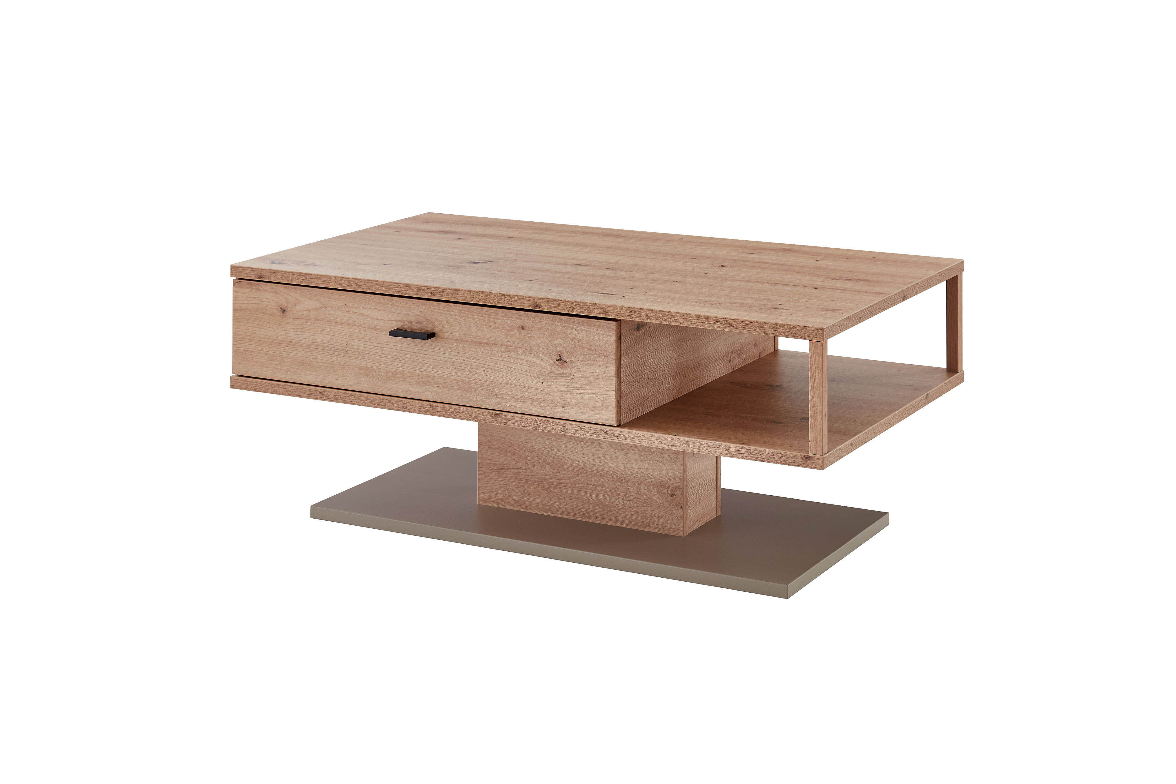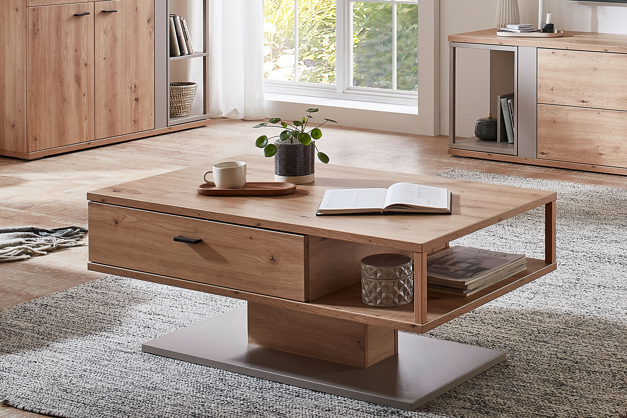 Suchen Sie einen neuen Begleiter für Ihre Sitzecke, der praktisch und formschön zugleich ist? Das Modell Grado-living von IDEAL Möbel enthält diesen Couchtisch in Eiche Artisan und mit einer dunkel abgesetzten Bodenplatte in Basalt, der zum neuen Mittelpunkt des Wohnzimmers werden kann. Mit einem durchgehenden offenen Fach sowie einem Schubkasten verschwinden nicht benötigte Fernbedienungen und andere Kleinigkeiten mit einem Griff. Die Tischplatte hat eine Größe von circa 110 mal 65 Zentimetern und bietet damit ausreichend Platz für Getränke, Snacks und saisonale Dekorationen. Ergänzend dazu enthält die Serie viele weitere passende Elemente. Unter anderem finden Sie dort Sideboards, Lowboards oder direkt zusammengestellte Wohnkombination. Mithilfe des Typenplans sowie des Möbelkonfigurators von Grado-living finden Sie nicht nur Inspiration, sondern gleichzeitig erhalten Sie die Möglichkeit, sich ein stimmiges Wohnzimmer zusammenzustellen. IDEAL Möbel ist Ihre Anlaufstelle für modische Einrichtung und Gemütlichkeit.