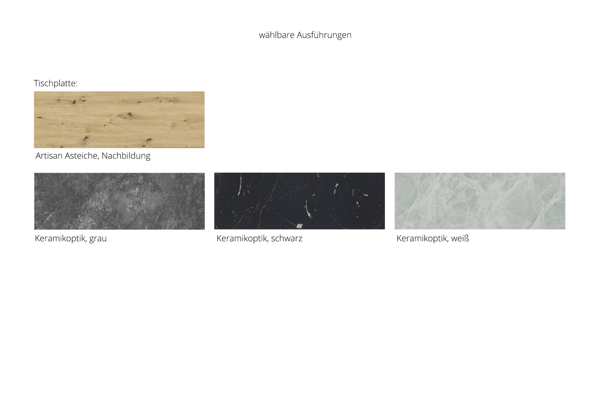 - Tischplatte: Keramikoptik, weiß, mit ABS-Kante, kratzfest durch Melaminharzbeschichtung