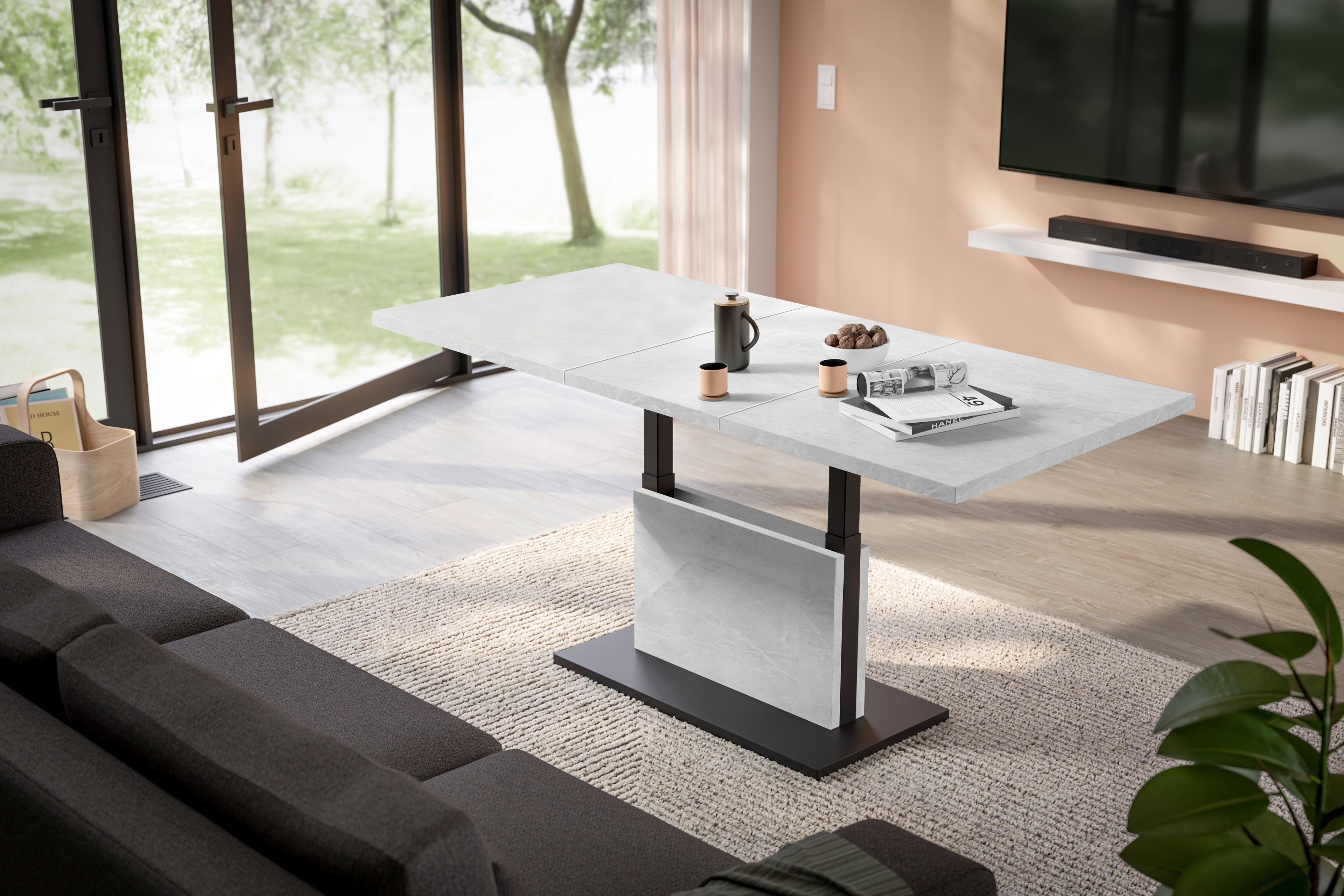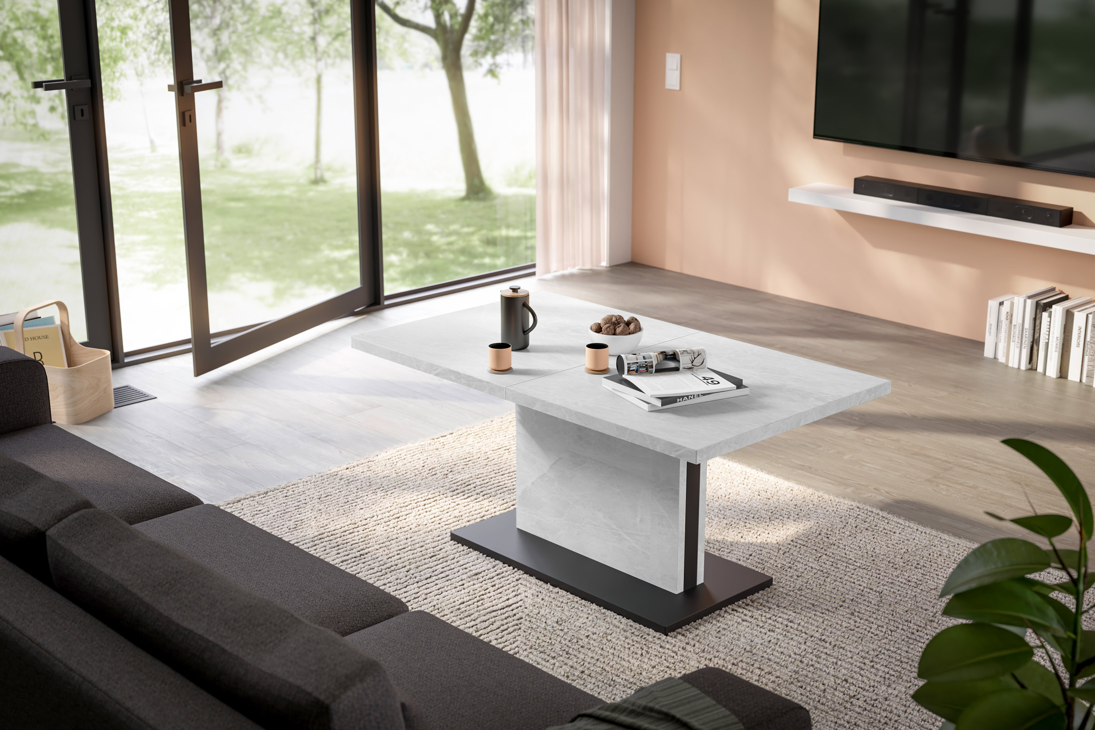 Ein Möbelstück, das sich verändert, wenn Ihr Alltag es verlangt: Der Couchtisch von Mäusbacher aus der Tischserie Lift verbindet reduziertes Design mit intelligenter Technik und wird so zum vielseitigen Mittelpunkt Ihres Wohnbereichs. Klar in der Form, hochwertig in der Ausführung und präzise gefertigt, erfüllt er höchste Ansprüche an Funktionalität und Ästhetik. Die Tischplatte und Säule in mattem Weiß verleihen dem Solisten ein modernes und elegantes Erscheinungsbild. Zudem sorgt die vulkanschwarze Bodenplatte in supermattem Lack einen kraftvollen Kontrast. Dank der kratzfesten Melaminbeschichtung bleiben alle Flächen auch bei intensiver Nutzung dauerhaft gepflegt. Seine besondere Stärke zeigt der Beistelltisch in der Funktion: Die Liftmechanik ermöglicht eine komfortable Höhenverstellung von ungefähr 47 bis 66 cm und passt sich somit flexibel unterschiedlichen Nutzungssituationen an. Zusätzlich lässt sich die Tischfläche über einen Synchronauszug mühelos von ungefähr 120 Zentimetern auf circa 160 Zentimetern erweitern – ideal, wenn aus dem Couchtisch spontan eine großzügige Ablage oder Tafel wird.
