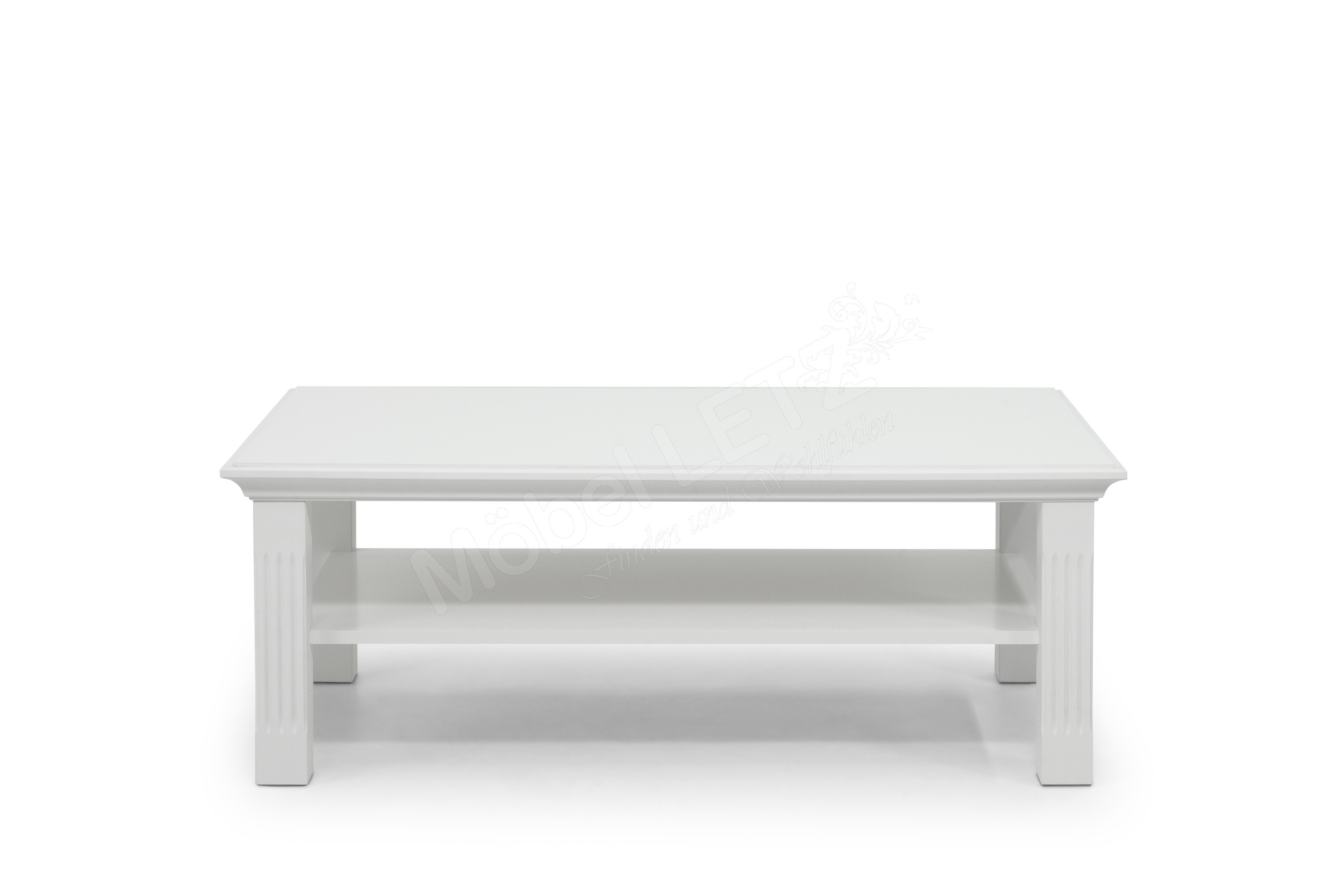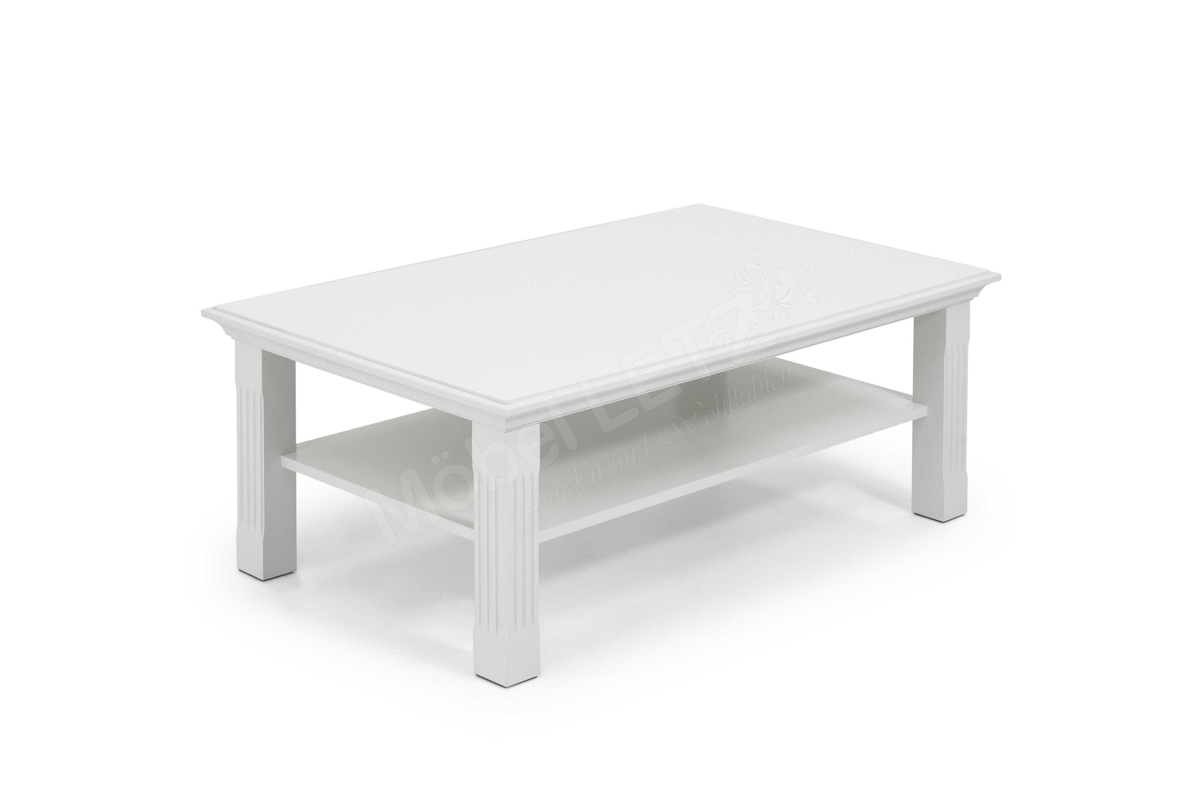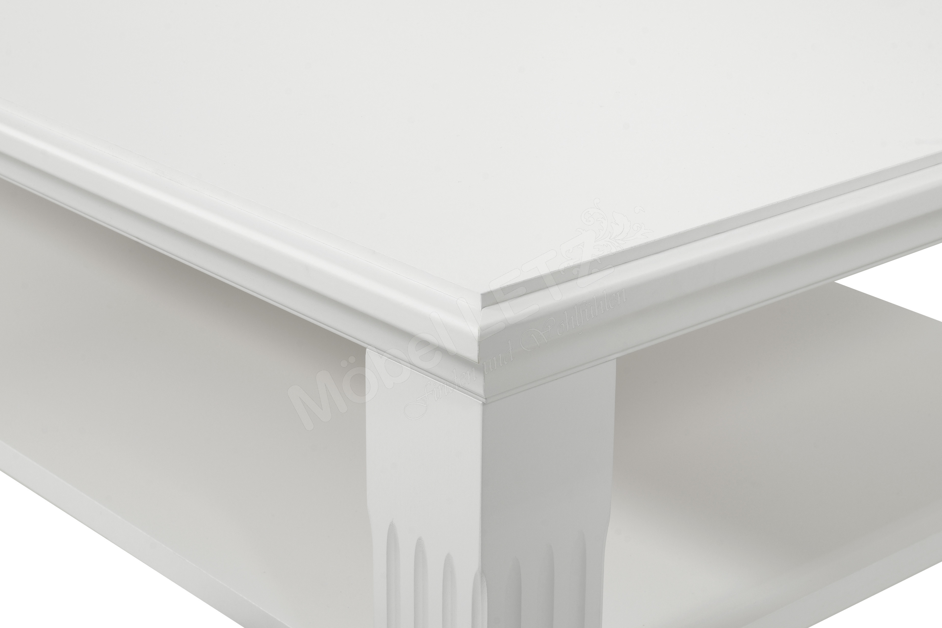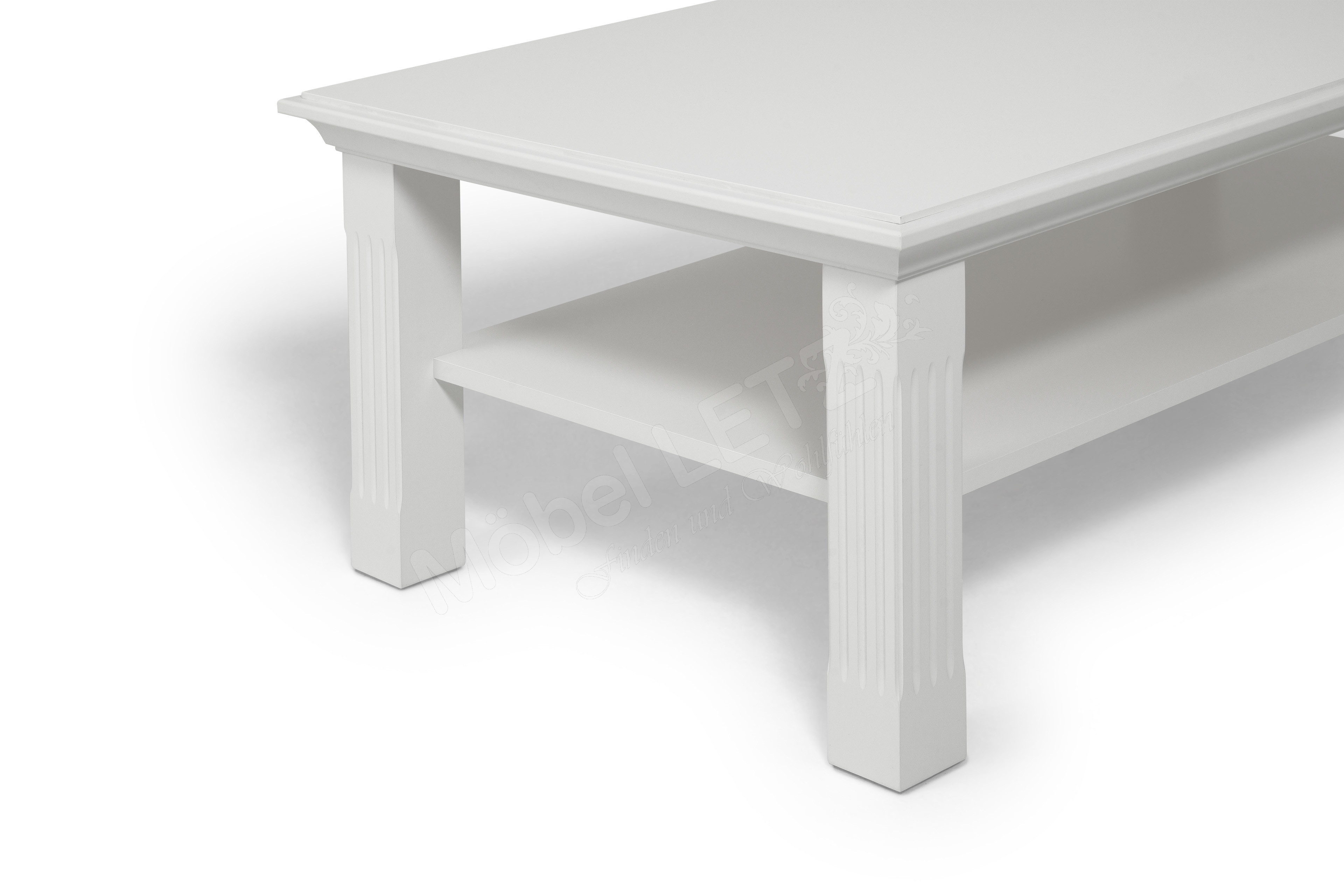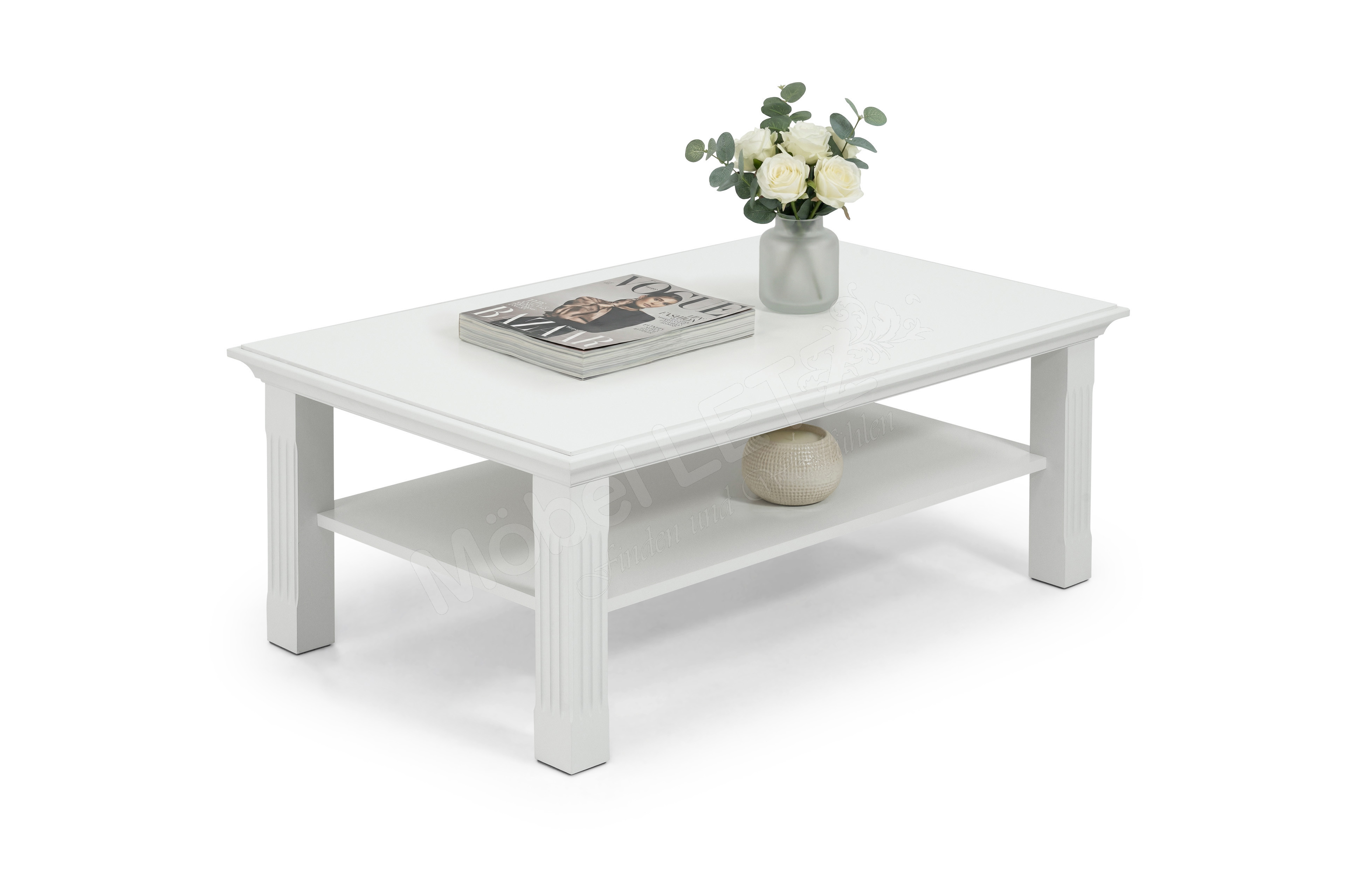 Um Ihre Wohnzimmereinrichtung im Landhausstil stimmig und zugleich edel zu vollenden, halten die Wehrsdorfer Werkstätten den Couchtisch aus der Serie Maison für Sie bereit. Mit seiner harmonischen Gestaltung und den liebevoll ausgearbeiteten Details fügt er sich stilvoll in ein behagliches Ambiente ein. Charakteristisch sind die Pilaster – die Zier- beziehungsweise Kranzprofile –, die dem Möbelstück eine besondere Ausdruckskraft verleihen und ihm eine markante, zugleich elegante Note schenken. Der Couchtisch präsentiert sich in weißem Lack und avanciert rasch zum unverzichtbaren Mittelpunkt Ihrer Sofaecke. Auf der großzügigen Tischplatte finden Fernbedienungen, Zeitschriften oder Bücher ebenso ihren Platz wie dekorative Vasen, Schalen oder Kerzenarrangements. Der darunterliegende Ablageboden schafft weiteren Stauraum für Wohnaccessoires oder Alltagsgegenstände und sorgt für eine aufgeräumte Atmosphäre. So verbindet der Wehrsdorfer Couchtisch Maison ansprechende Optik mit praktischer Funktionalität – und Wohnen wird schöner.