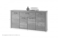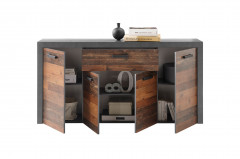 Sie sind auf der Suche nach einem Möbelstück mit viel Stauraum und einer eindrucksvollen Optik? Dann schauen Sie sich dieses Sideboard Jones von HBZ genauer an. Hinter vier Türen und in einem Schubkasten befindet sich viel Platz für Ihre Tischwäsche, Ihr Geschirr oder andere Utensilien, je nachdem wo Sie diesen Allrounder aufstellen möchten. Mit mehreren Einlegeböden ausgestattet, ist das Möbel für den Essbereich sowohl für das Wohnzimmer als auch für die Diele bestens geeignet. Von nun an ist für Ordnung in Ihren Wohnräumen gesorgt. Die eindrucksvolle Ansicht in antiker Holzoptik kombiniert mit Rahmenakzenten in Matera grau geben der Kommode einen ganz speziellen Look. In Old-Style gewählte Griffe passen perfekt zu der beeindruckenden Ansicht und eignen sich ideal für den täglichen Gebrauch. Unser Shop bietet Ihnen die passende Wohnkombination dazu. Jones, ein Modell von HBZ.