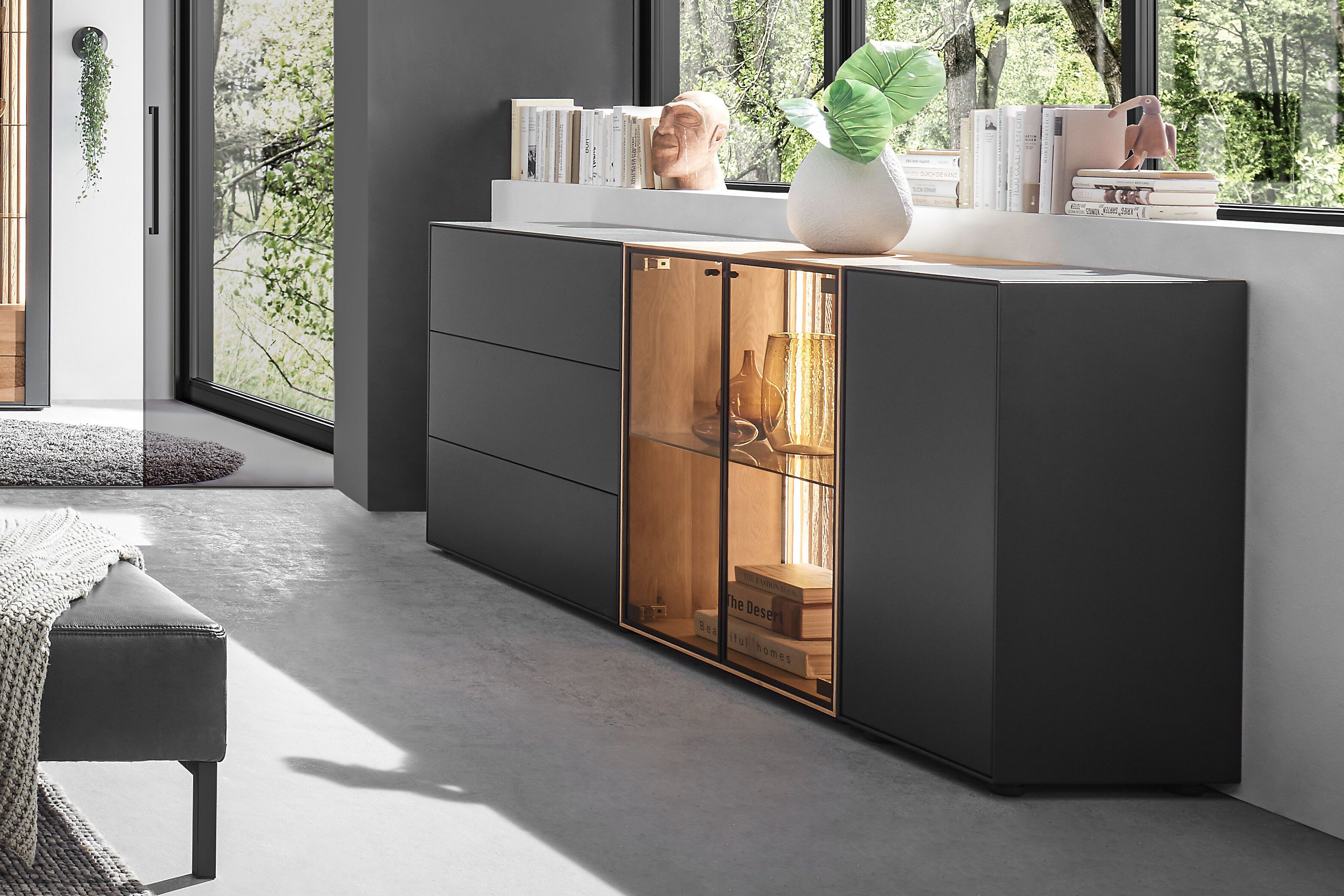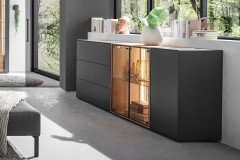 Dieses Sideboard von Hartmann ist ein Statement für höchste Möbelkultur – 100 % Made in Germany. Es vereint handwerkliche Perfektion, durchdachte Funktionalität und ein Design, das auf den ersten Blick begeistert. Der raffinierte Materialmix aus edler, anthrazit lackierter Birke, warmem Eichenholz und feinen Metallakzenten verleiht dem Möbelstück seinen unverwechselbaren Charakter. Unterschiedliche Öffnungsmechanismen – eine Holztür sowie Schubkästen mit Push-Pull-Funktion und Glastüren mit Metallgriffen – machen diese Kommode nicht nur optisch spannend, sondern auch in der Handhabung komfortabel und modern. Hinter den Glastüren setzt eine Lamellenrückwand aus massiver Eiche eindrucksvolle Akzente. Das warme, strukturierte Holz bildet einen faszinierenden Kontrast zur kühlen, anthrazitfarbenen Front und schafft Tiefe und Atmosphäre. Das zweifarbige Deckblatt rundet das harmonische Gesamtbild ab und unterstreicht den hochwertigen Charakter dieses Designmöbels. Ein Möbel mit Persönlichkeit – präzise gefertigt, ausdrucksstark im Auftritt und ein echtes Highlight für alle, die Wert auf Stil, Qualität und Raffinesse legen. Selino – begeisternd schön.