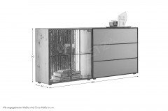 - Sideboard mit 2 Glastüren (links), 1 Holzklappe, 2 Schubkästen, 1 Glasboden, 1 Holzboden und 1 Lamellenrückwand