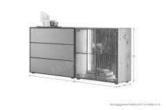 - Sideboard mit 2 Glastüren (rechts), 1 Holzklappe, 2 Schubkästen, 1 Glasboden, 1 Holzboden und 1 Lamellenrückwand