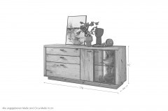 Sideboards sind universale Helfer für fast jeden Raum. Dieses Element aus der Serie Malaga von IDEAL Möbel bietet umfassenden Stauraum, welcher in drei Schubkästen, hinter einer Holztür sowie einer Glastür mit Metallrahmen gegeben ist. Im Innern finden Sie insgesamt vier Fächer, für Ihre Schätze und andere wichtige Dinge. Die Glastür gibt den Blick frei auf einen Glasboden und die sichtbare Rückwand in einer sandgestrahlten Optik. Die ganze Kommode ist in Eiche gehalten, wobei die Fronten aus Massivholz bestehen. Kombinieren Sie diesen Solisten mit weiteren Stücken der Serie. Im hinterlegten Typenplan können Sie sich einen schnellen Überblick verschaffen oder sich Inspiration holen. Nutzen Sie den praktischen Möbelplaner, um mit wenigen Klicks eine komplette Wohnzimmereinrichtung zusammenzustellen. Malaga von IDEAL Möbel ist ein zeitloses Programm, welches sich in unterschiedliche Stile einfügen wird. Von warm rustikal bis zu modern naturverbunden. Überzeugen Sie sich selbst.