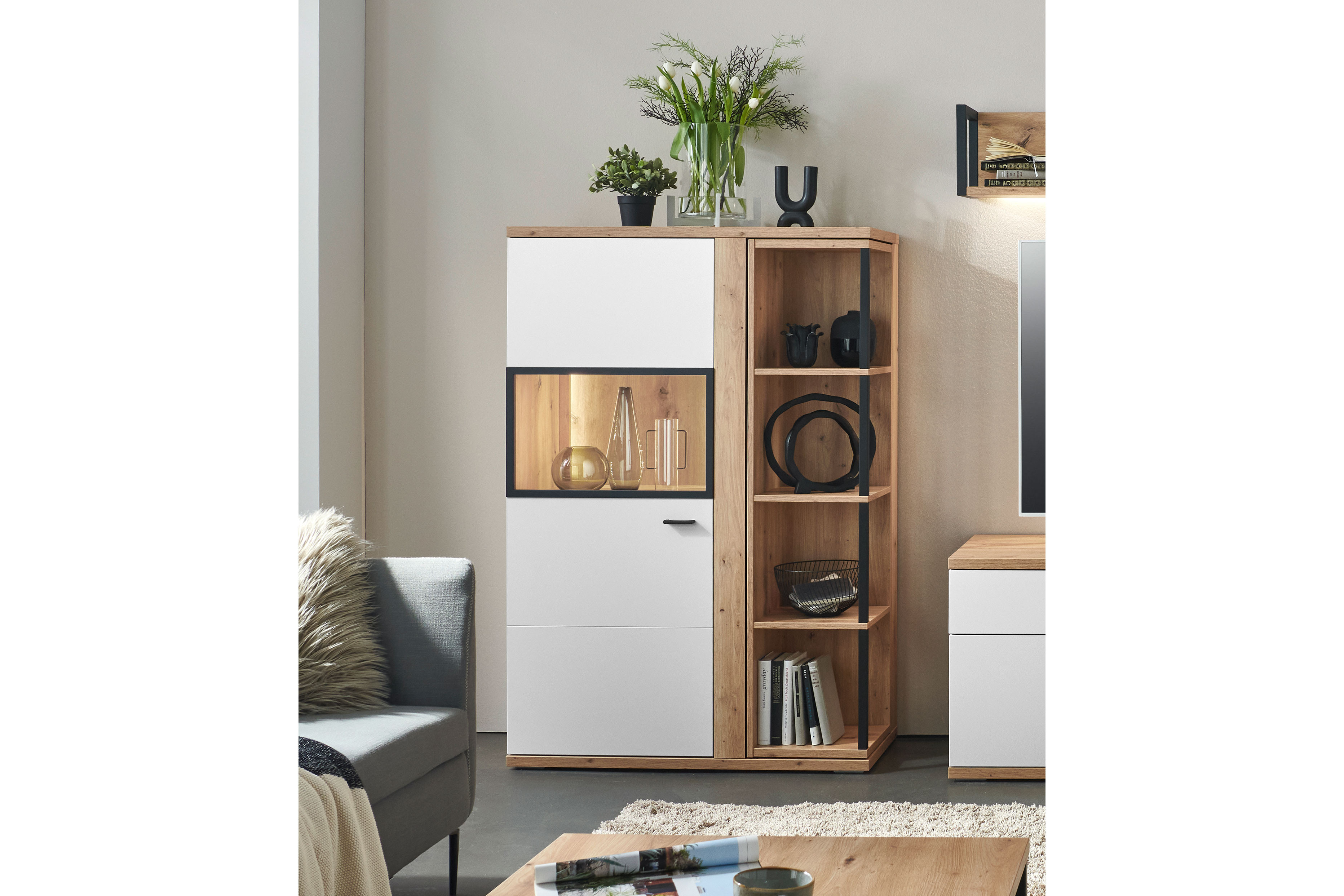 Warme Eichenholznuancen treffen bei diesem Highboard Modica von IDEAL Möbel auf modernes Weiß und formen ein harmonisches Erscheinungsbild, das sowohl Behaglichkeit als auch eine zeitgemäße, luftige Ausstrahlung vermittelt und zugleich mit praktischen Stauraum- und Präsentationslösungen punktet. Hinter der Holz-/ Glastür verbergen sich drei stabile Holzböden, die reichlich Platz für Gläser oder dekorative Arrangements bieten und diese zugleich wirkungsvoll zur Geltung bringen. Eine optionale Beleuchtung setzt gezielte Akzente und unterstreicht die wohnliche Atmosphäre im Raum. Als durchdachtes Detail erweist sich das seitlich integrierte Drehregal des Highboards, das flexibel genutzt werden kann: ob zur Präsentation ausgewählter Dekoration oder zum unauffälligen Verstauen. Mit insgesamt vier Fächern entsteht großzügiger Raum für Bücher, Accessoires oder saisonale Elemente und sorgt für eine klare, übersichtliche Struktur. Modica von IDEAL Möbel überzeugt mit funktionaler Raffinesse und einem charakterstarken Design, das sich mühelos in verschiedene Wohnstile einfügt.