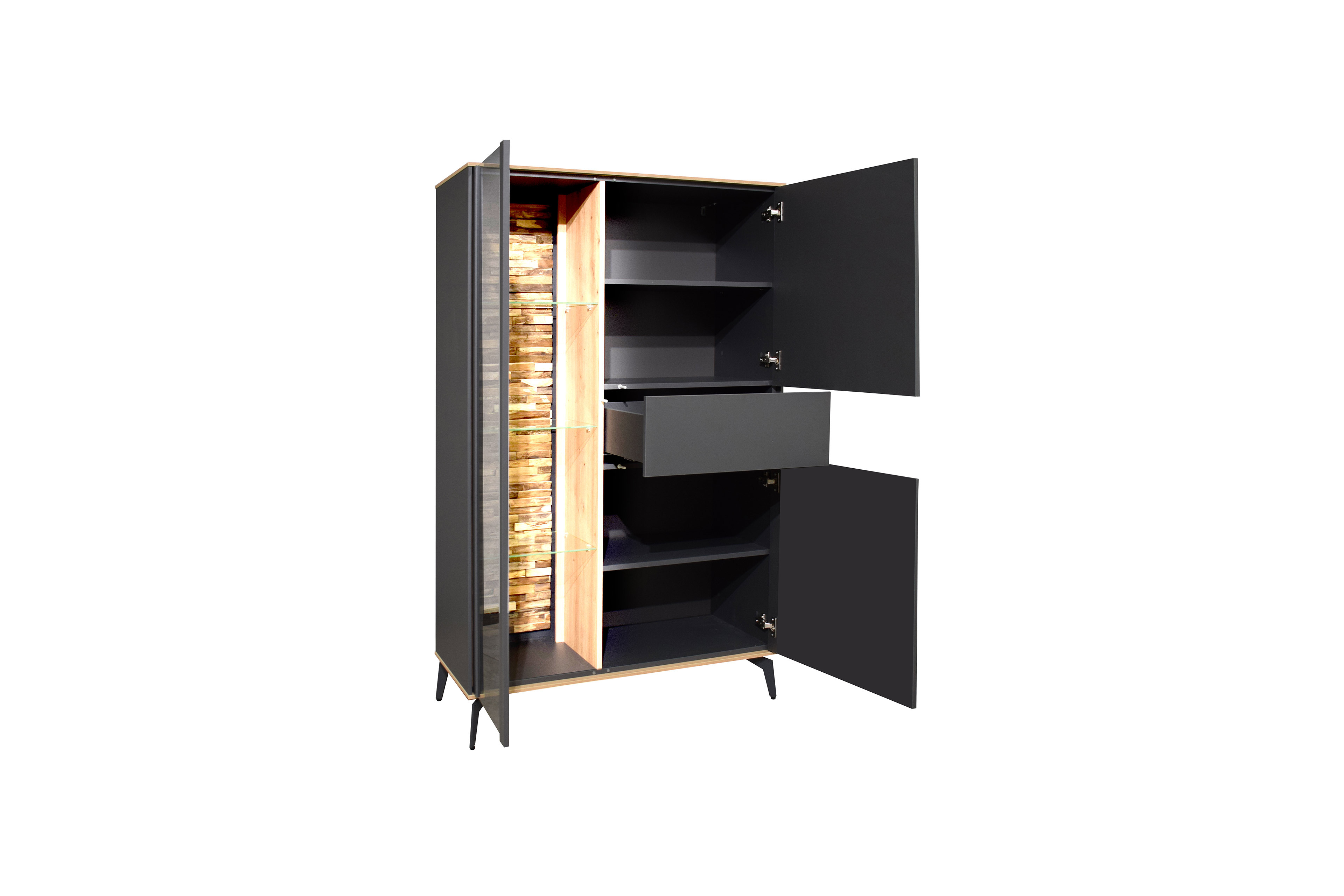 - Highboard mit 2 Holztüren, 1 Glas-/ Holztür, 2 Holzböden, 3 Glasböden und 1 Schubkasten