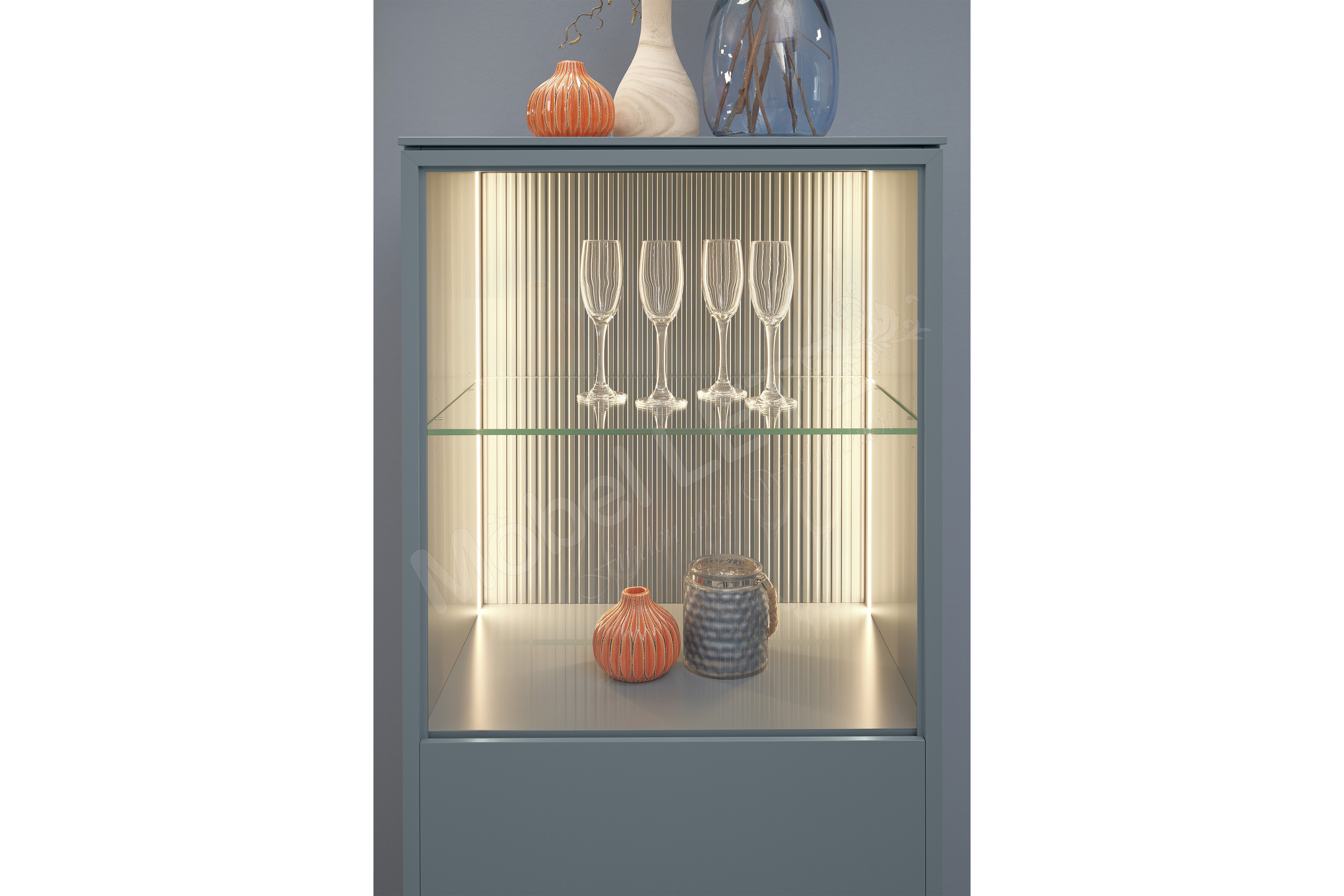 Ein Highboard der Extraklasse bekommen Sie mit diesem Möbelstück aus der Serie Amaya von SCHÖNER WOHNEN. Das in Taubenblau gehaltene Element begeistert mit einer Glas-/ Holztür mit Push-to-open, einem Glasboden sowie zwei Konstruktionsböden. Präsentieren Sie hinter den Glasausschnitten schöne Gläser, elegante Vasen oder einfach alle Schätze, die Sie gern jeden Tag betrachten möchten. Ein verdecktes Fach eignet sich hingegen für Unterlagen oder Dinge, die außer Sichtweite verstaut werden sollen. Mit der eingebauten Beleuchtung "Lubia" setzen Sie ein echtes Highlight in Ihrem Wohnraum. Ob warmes Licht oder kaltes, ob heller oder gedimmter – Sie entscheiden über die gewünschte Stimmung. Die eleganten sichtbaren Rückwände, welche mit einer Rillenoptik versehen sind, schaffen ein spannendes Spiel aus hell und dunkel. Mit der passenden Funkfernbedienung steuern Sie dies bequem vom Sofa aus. Schauen Sie sich das Angebot noch heute bei uns im Möbelhaus an und überzeugen Sie sich selbst.